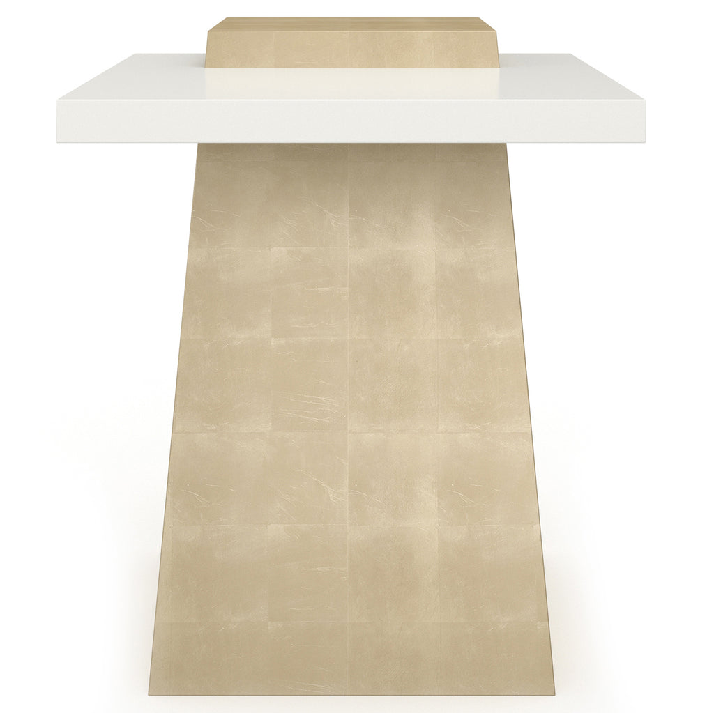 A study in suspended trapezoids meeting monoliths, Plank displays impressive balance as its Almond Milk top extends from a trapezoidal base that is dramatically finished in hand-applied Oracle leaf. This is sure to be a conversation starter in any room.