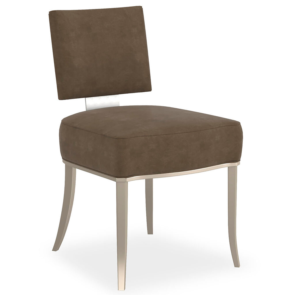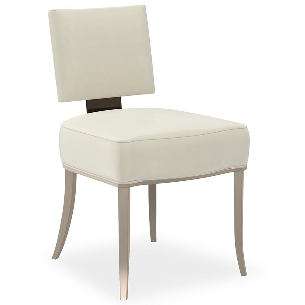 This contemporary side chair takes on dramatic style when you view the wide, Whisper of Gold panel that shines off its back. Neutral fabric fully surrounds the square upper back and seat cushion that rest on an exposed wood frame, sabre legs and gracefully curving arms finished in Soft Silver Paint. This is a low, klismos chair with truly polished appeal.
