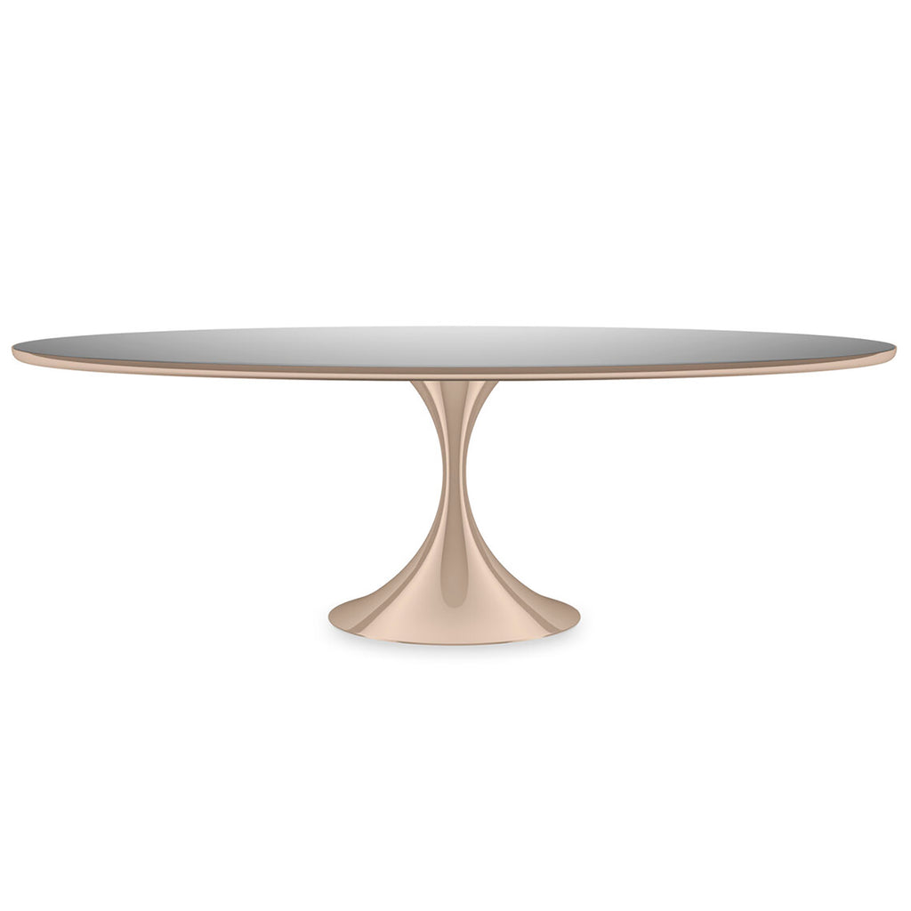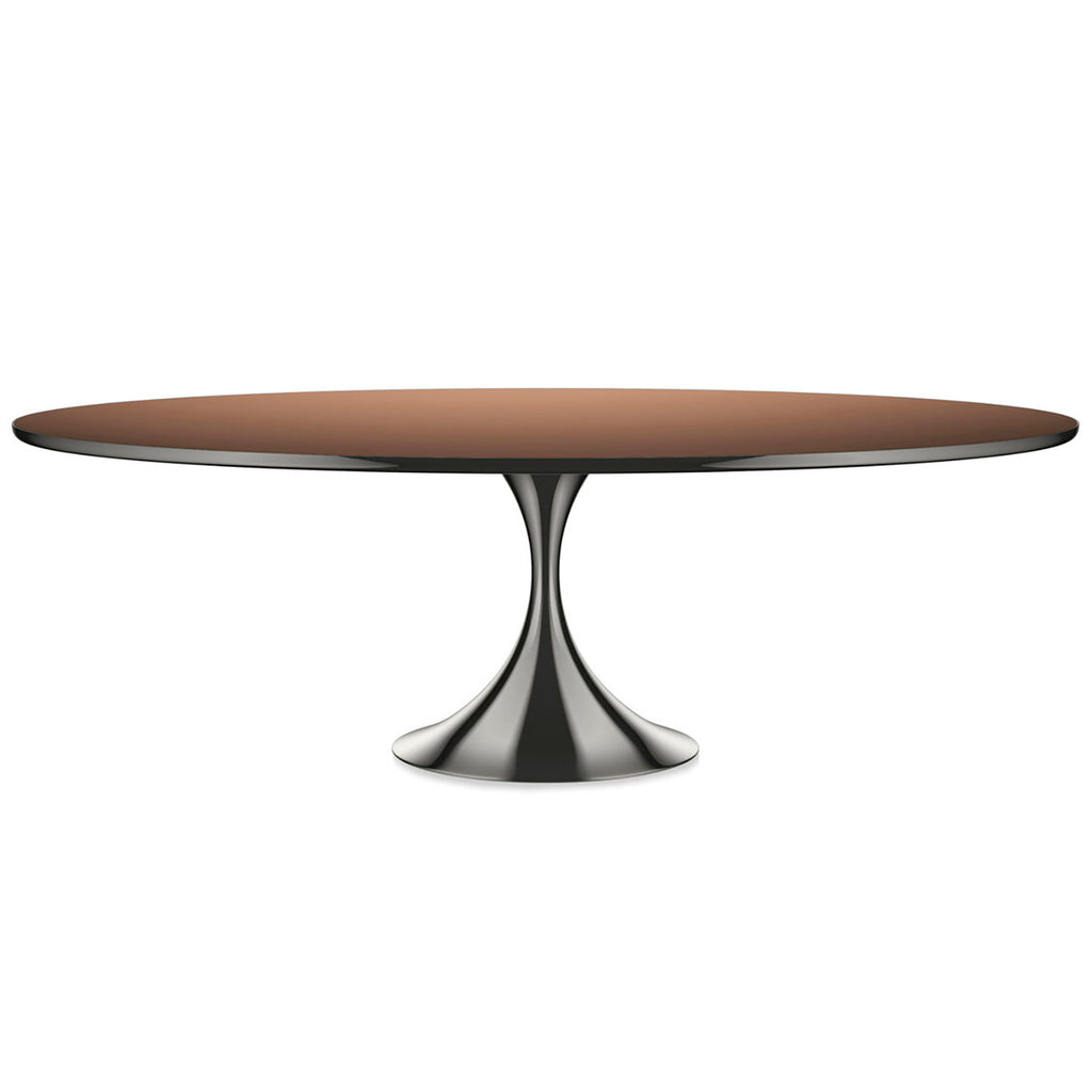 Our reinterpretation of a mid-century modern tulip table makes an eye-catching statement in a dining room, kitchen or sunroom window. Originally designed to remove the clutter of legs under a dining table, this piece boasts a curved, stem-like metal base in Whisper of Gold. This version has a round, silver mirror top that is encapsulated in the metal base. Also available in Deep Bronze metal with a Bronze-tinted mirrored top
