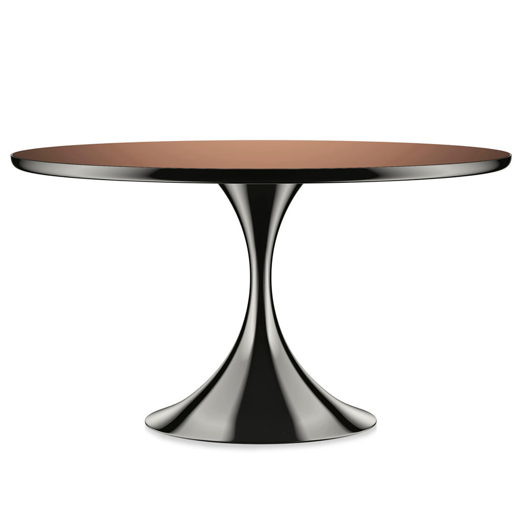 Our reinterpretation of a mid-century modern tulip table makes an eye-catching statement in a dining room, kitchen or sunroom window. Originally designed to remove the clutter of legs under a dining table, this piece boasts a curved, stem-like metal base in Whisper of Gold. This version has a round, silver mirror top that is encapsulated in the metal base. Also available in Deep Bronze metal with a Bronze-tinted mirrored top