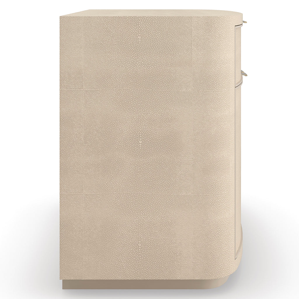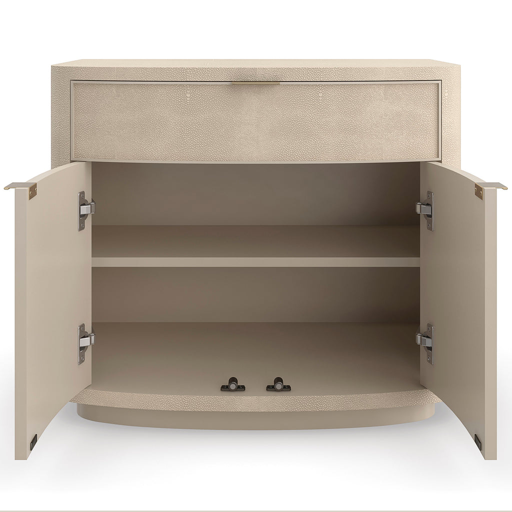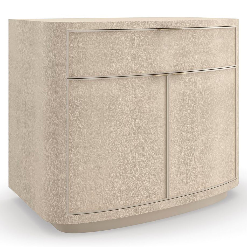 Understated yet alluring, the Caracole Simple Perfect nightstand is a celebration of material and purity in form. With a gently bowed front, its classic silhouette is wrapped in an ivory-painted, pieced faux shagreen for subtle texture and a note of luxe. Generous storage features a single, soft-close drawer and an adjustable shelf concealed behind two, touch-latch doors.