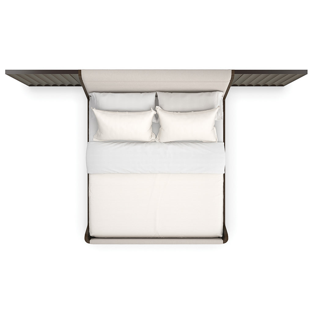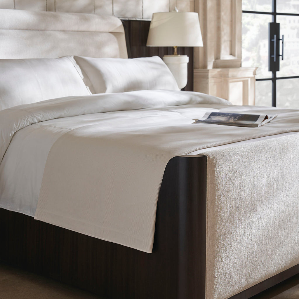 Inspired by neoclassical architecture, this contemporized sleigh bed makes a prominent statement with overscaled fluted wing panels, finished in a mix of Otter and Dark Chocolate. Features a comfortably canted headboard and clean-lined footboard, dressed in a faux slub silk that mimics microfluting found on other pieces in our collection. Sold as a set of two, wing panels are designed with cord access along the bottom corners for added function.