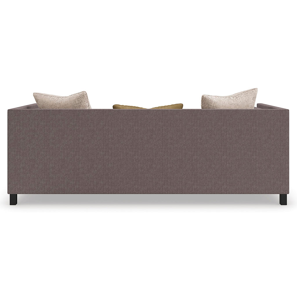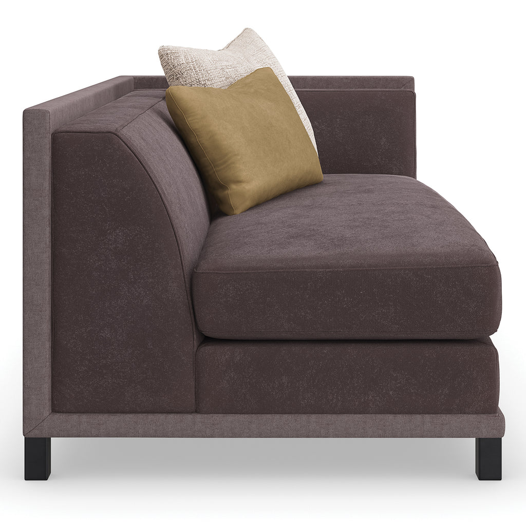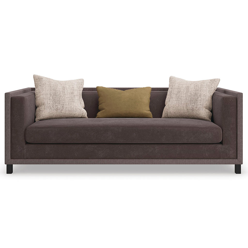 With clean lines and crisp tailoring in a deep chocolate brown hue, this classic shelter arm sofa is inspired by modern takes on the iconic tuxedo. Impeccably dressed, its confident silhouette is punctuated by a luxe mohair fabric on the inside arms, bench seat, and back cushion, with a textured woven linen wrapping the sides and back. Metal legs in brushed deep bronze add warmth and a dashing finish, complemented by a bronze faux mohair toss pillow.