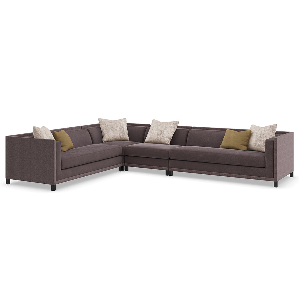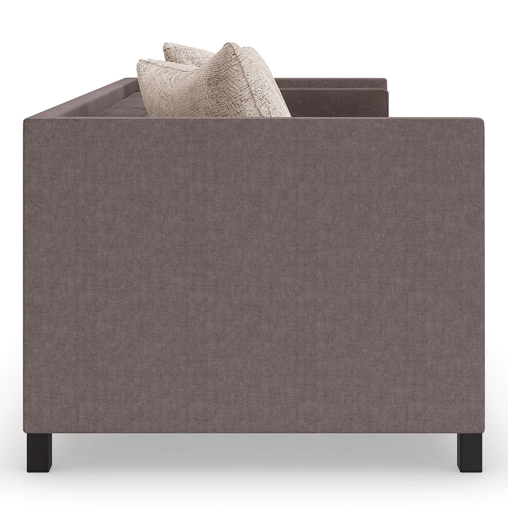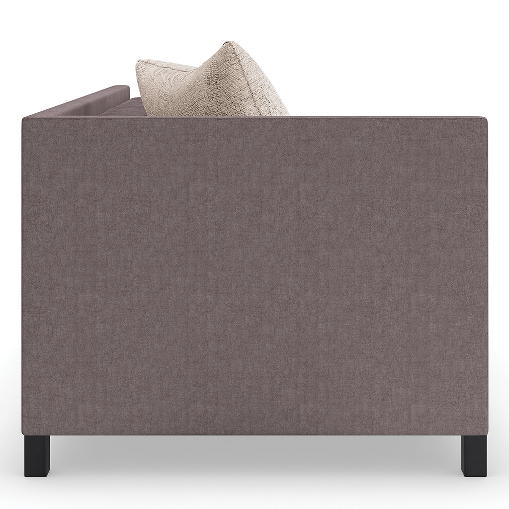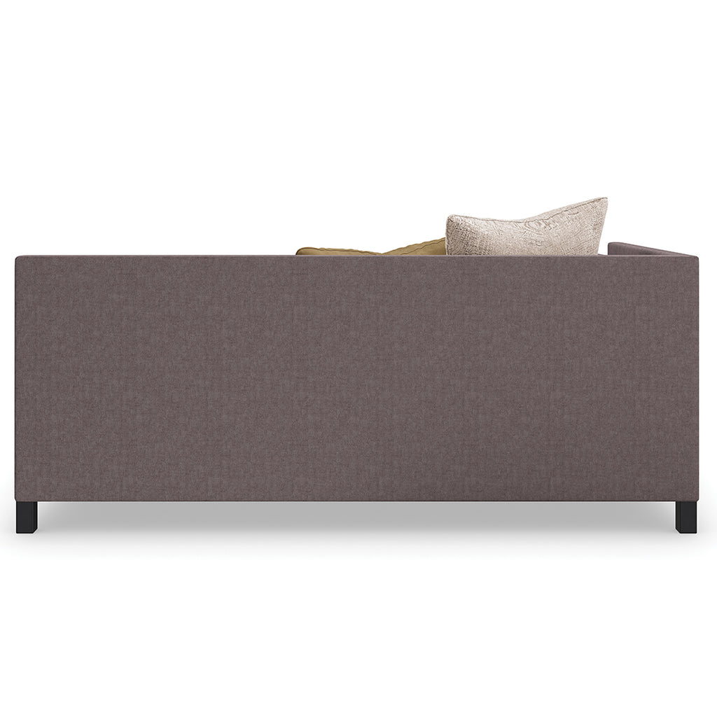With clean lines and crisp tailoring in a deep chocolate brown hue, this classic shelter arm sofa is inspired by modern takes on the iconic tuxedo. Impeccably dressed, its confident silhouette is punctuated by a luxe mohair fabric on the inside arms, bench seat, and back cushion, with a textured woven linen wrapping the sides and back. Metal legs in brushed deep bronze add warmth and a dashing finish, complemented by a bronze faux mohair toss pillow.