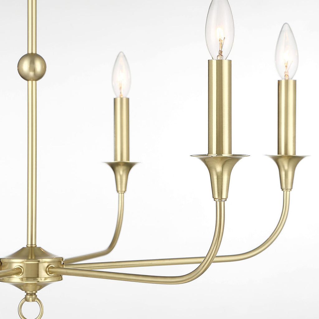 Timeless in style, the satin-brass Charlotte Chandelier is a study in classic design. Simple in form, but elegant in statement, this ceiling light measures 30 inches wide, so is large enough to use over most dining tables or in living rooms or foyers, but its slender arms keep it from dominating a space. Charlotte is dimmable and features six candle-style lights. Includes 6-foot chain to adjust height.