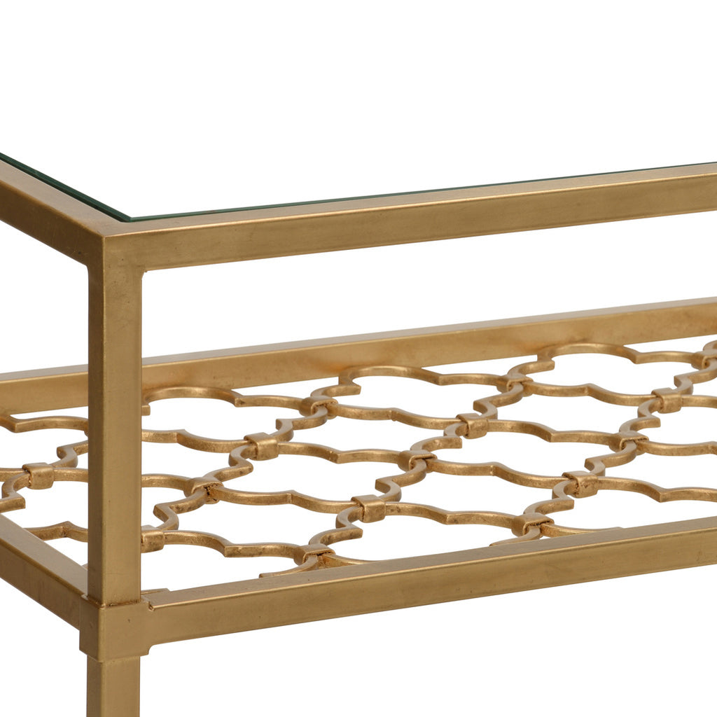 Narrow and sleek, perfect for displaying in your sitting room or entry way. The Pacific Coast Console is made of an iron frame finished with an antique gold finish with two glass shelves, one on top and one below for the right amount of storage and display options. Designed by Bill Cain.