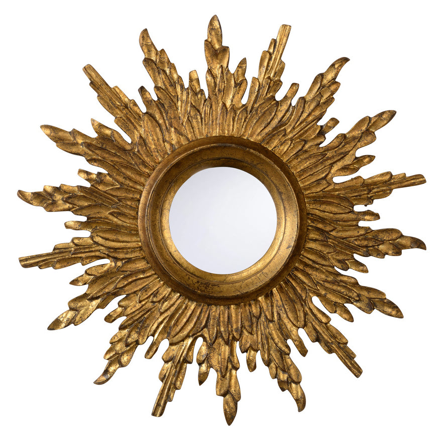 Ornate details combined with a glistening gold finish, the Sunbeam Mirror will brighten any room.