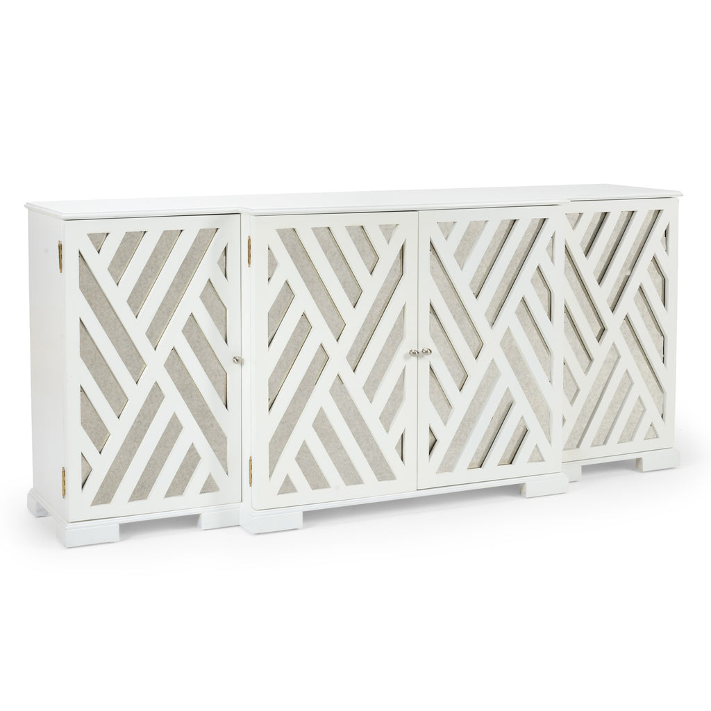 Chelsea brings its modern style to this captivating buffet/sideboard. A gorgeous statement in a living room or dining room, this furnishing intrigues with bold, contemporary flair. White painted wood with antique mirror backed doors and with polished nickel hardware.