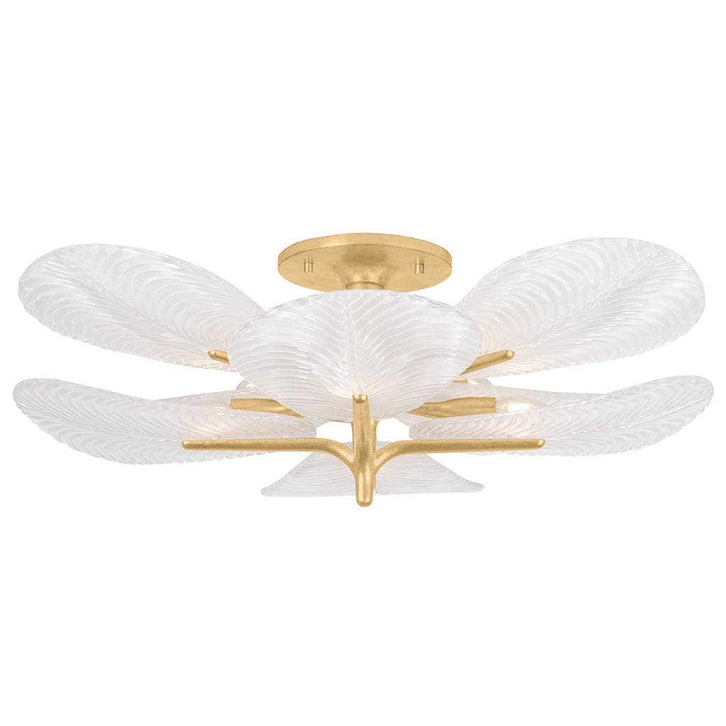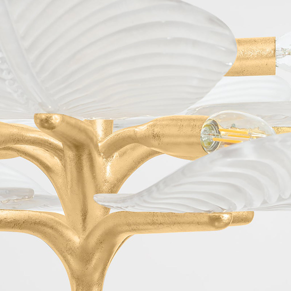 The layered botanical design of the Corbett Lighting Kamal semi-flush mount adds a pop of freshness overhead. Beautiful leaf patterns have been etched onto each piece of textured glass, creating a dynamic wave-like outward diffusion of light. The candelabra cluster positioned just beneath the ceiling canopy casts light through the layers to create a warm glow around the room. Available in two sizes and finished in Vintage Gold Leaf, Kamal makes a fresh statement in hallways, bedrooms, and beyond.