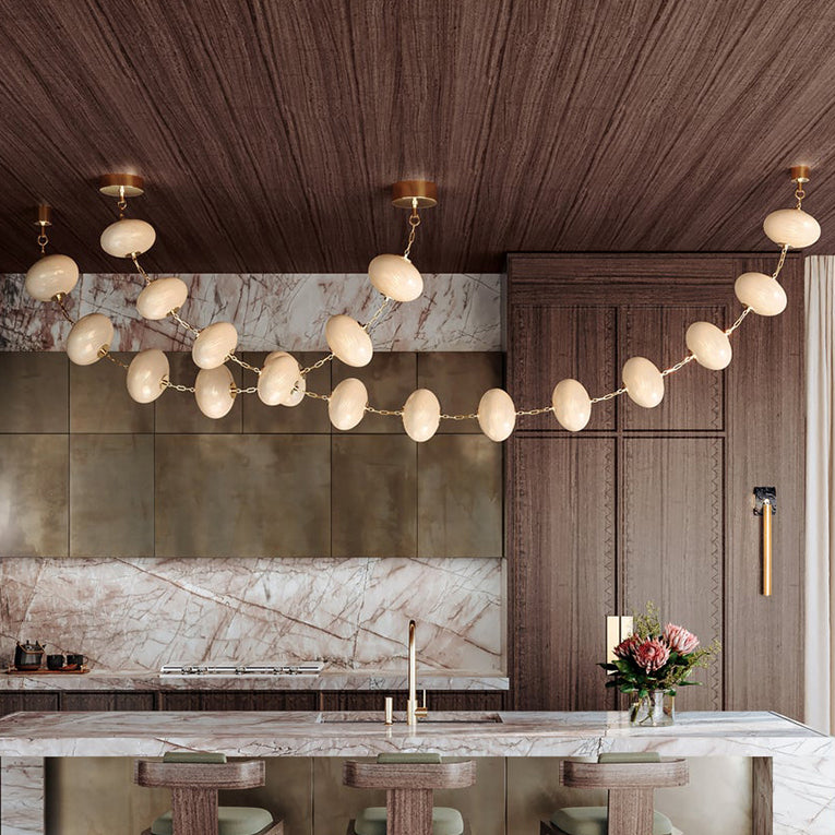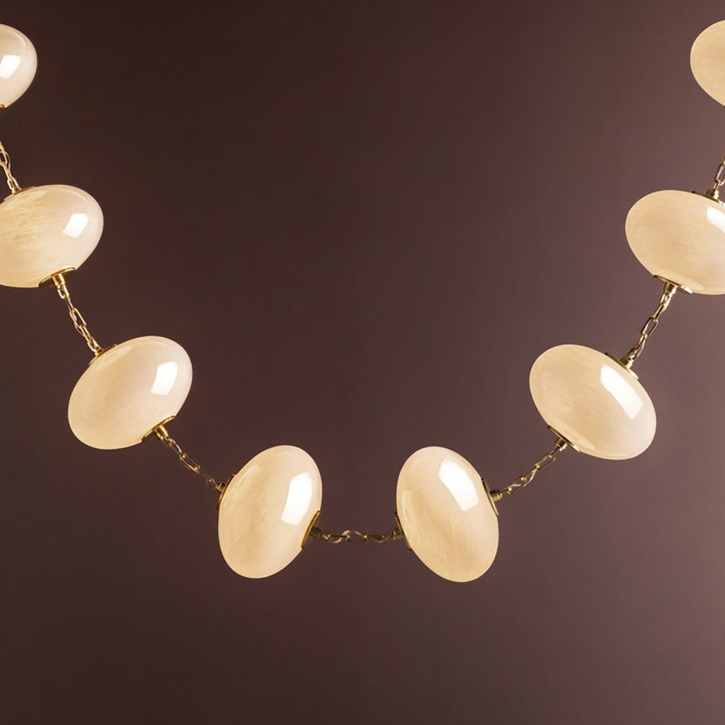 Echoing the artistry of bespoke installations and the graceful allure of fine jewelry, Corbett Lighting Nephele floats elegantly in space, resembling a string of luminous pearls suspended in perfect harmony. Each softly glowing cloud glass orb is held in place by intricately detailed Vintage Polished Brass links, creating a striking interplay of light and form.