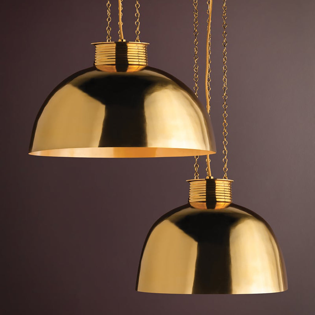 Suspended by three delicate decorative chains, this large-scale dome fixture is designed to bring refinement to everyday spaces. The allover Vintage Brass finish is refined and reflective, while the textured metal ‘bangle’ hardware gives the silhouette a jewelry-like feel. Available in two sizes, Corbett Lighting Perseus makes a bold, dynamic impression in modern spaces.