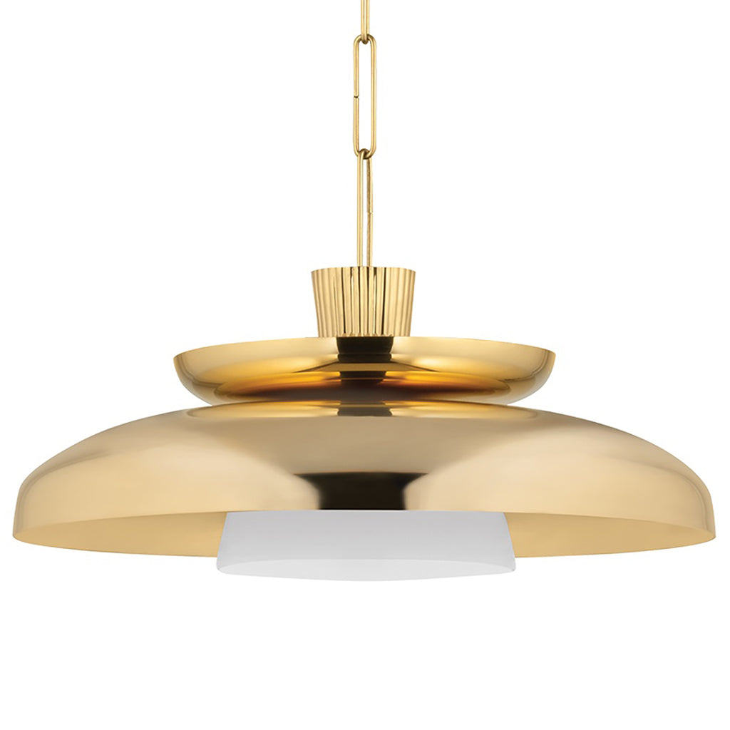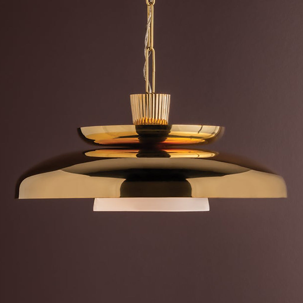 The architectural form and distinctive detailing of Corbett Lighting Ravenna make this shapely pendant a timeless treasure. Featuring alternating shallow bowl layers, the artistic stacked design culminates in a shiny opal glass shade nestled beneath a metal canopy. A ribbed cap adds an organic touch, while the allover Vintage Brass finish complements the glamorous silhouette.