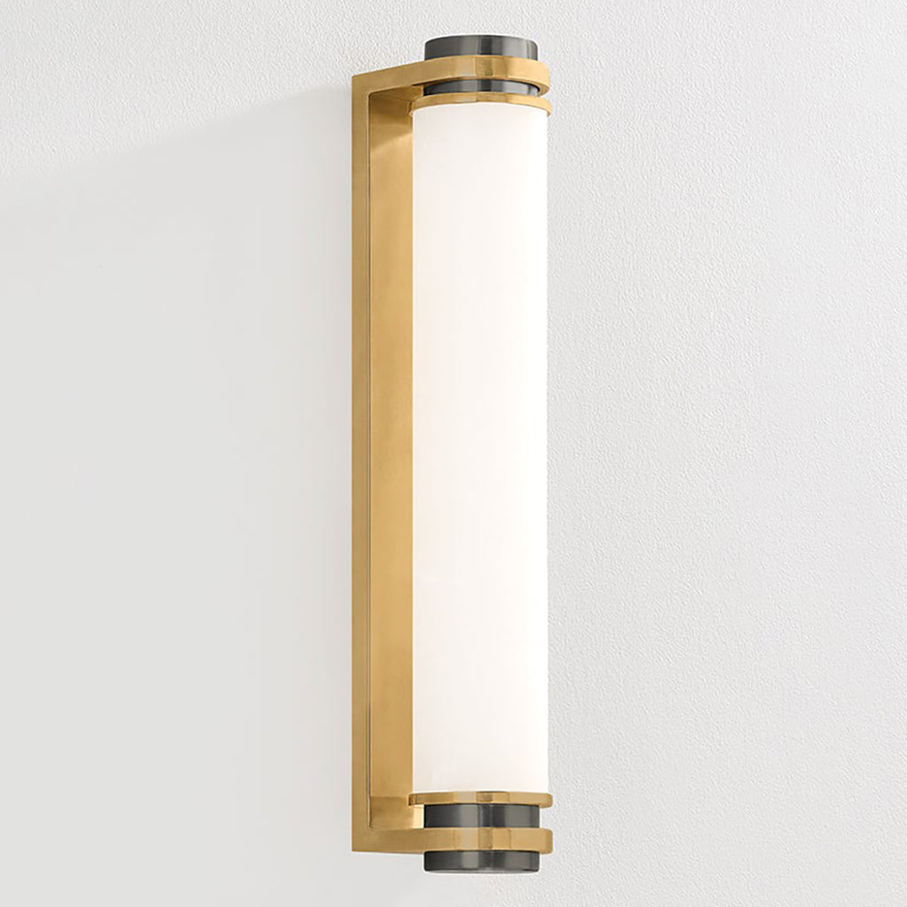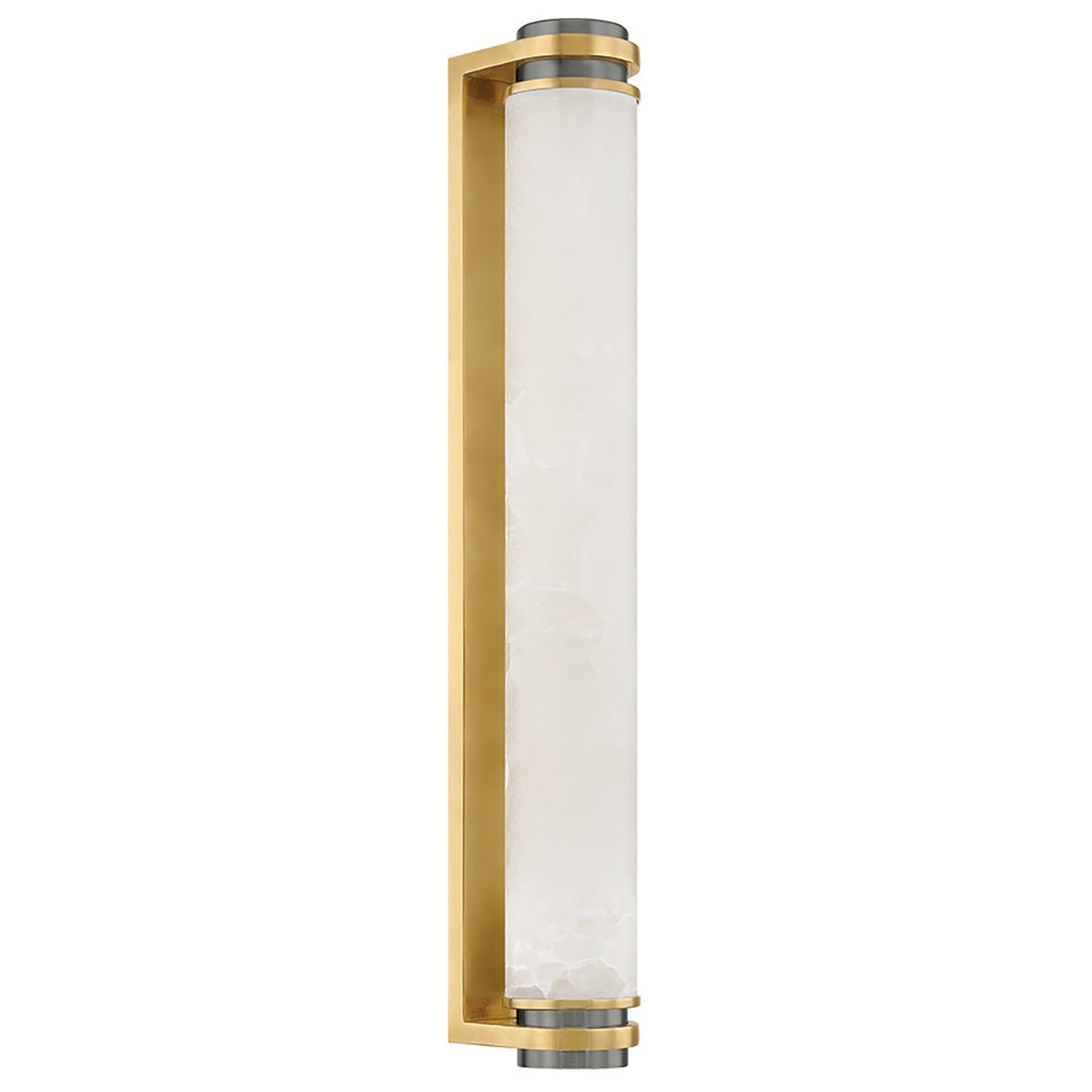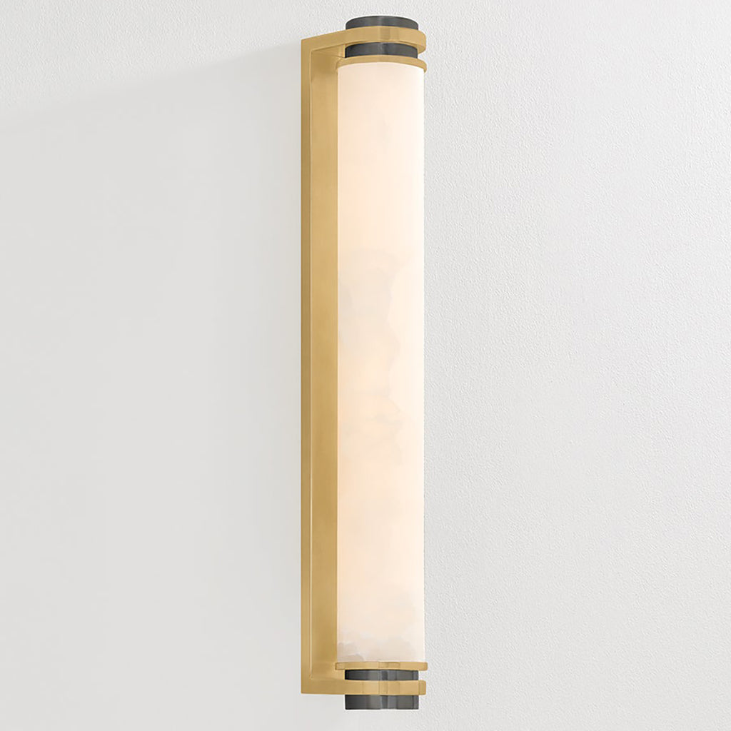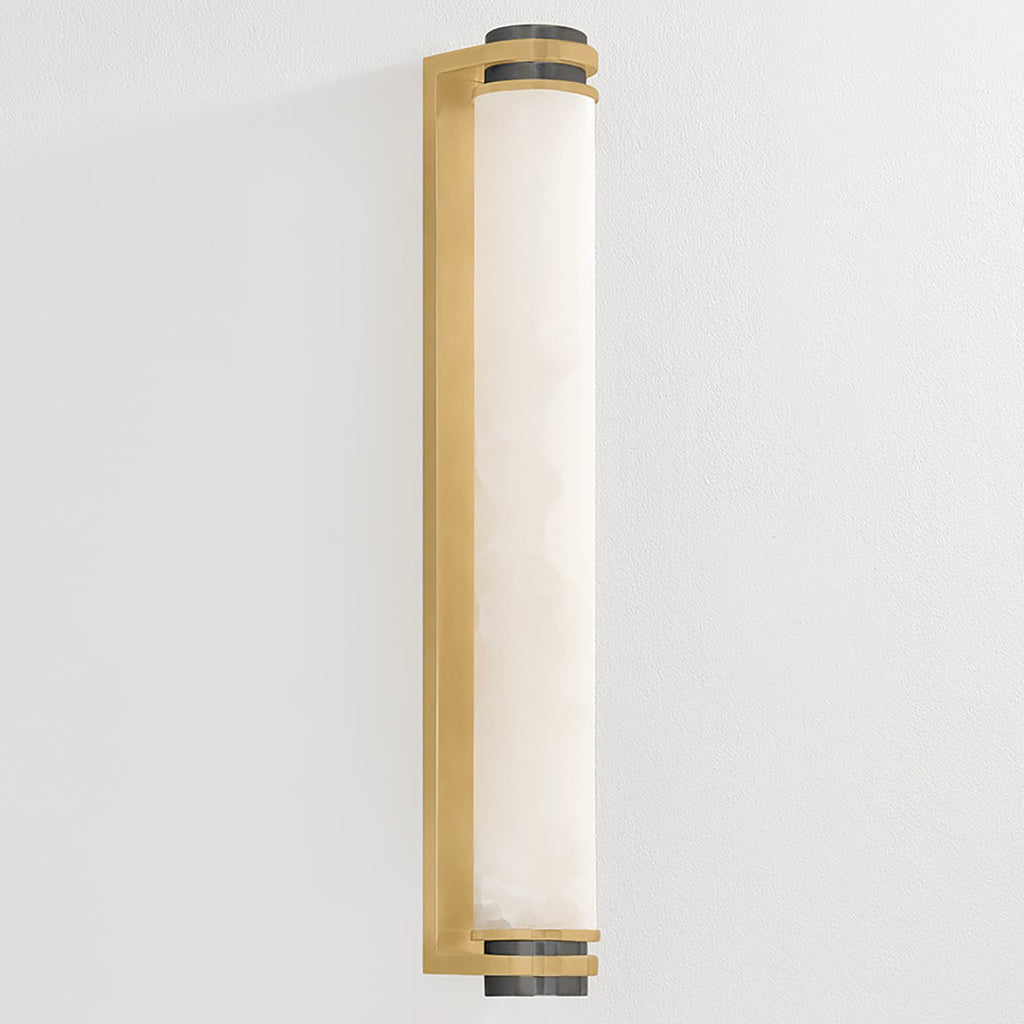 A celebration of the beauty of natural alabaster, this minimalist tube sconce is a timeless staple for the modern home. An elongated backplate frames the alabaster shade with a slim touch of metal. The Vintage and Patina Brass finishes forge a geometric relationship with the softness of the natural veining of the stone. Available in two sizes, Sorrento has bath and powder room crossover appeal.