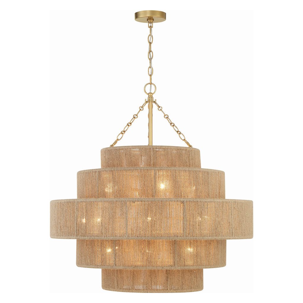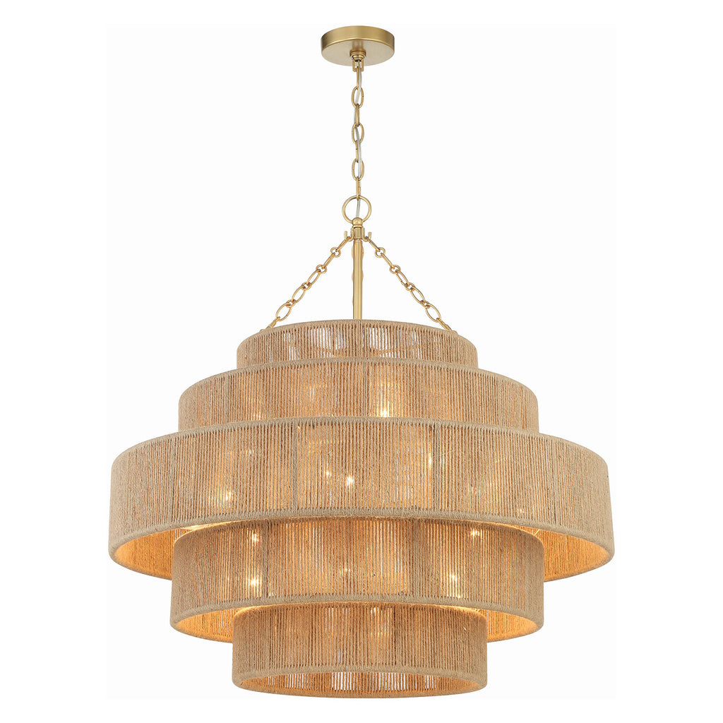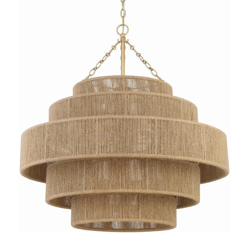 Crystorama is known for its standout lighting, which is exceptional in quality and design. From traditional all-crystal designs to transitional lighting collections, Crystorama offers styles that will match any décor and are always in fashion. A stylish beauty. The Shyla Chandelier is a stunning blend of form and function. Crafted with modern sensibilities in mind, it features a tiered jute design and a gold chain adorned with oval and round details. The jute-wrapped structure adds a textural element, creating a relaxed and refined ambiance. With a warm and cozy glow, it is the perfect lighting solution for various interior styles, thanks to its simple and versatile design. Authorized for use in damp, high-humidity interior locations or protected exterior locations.