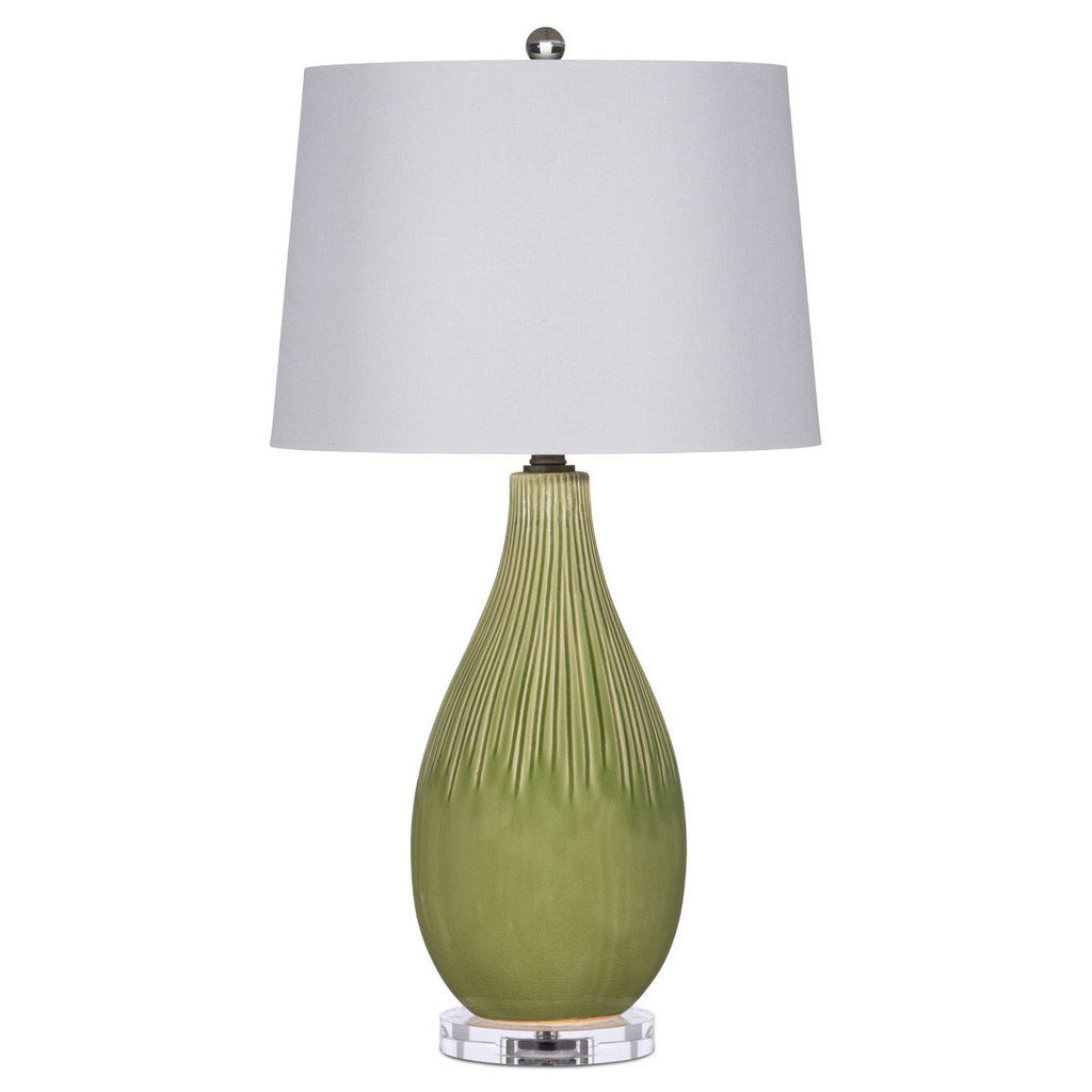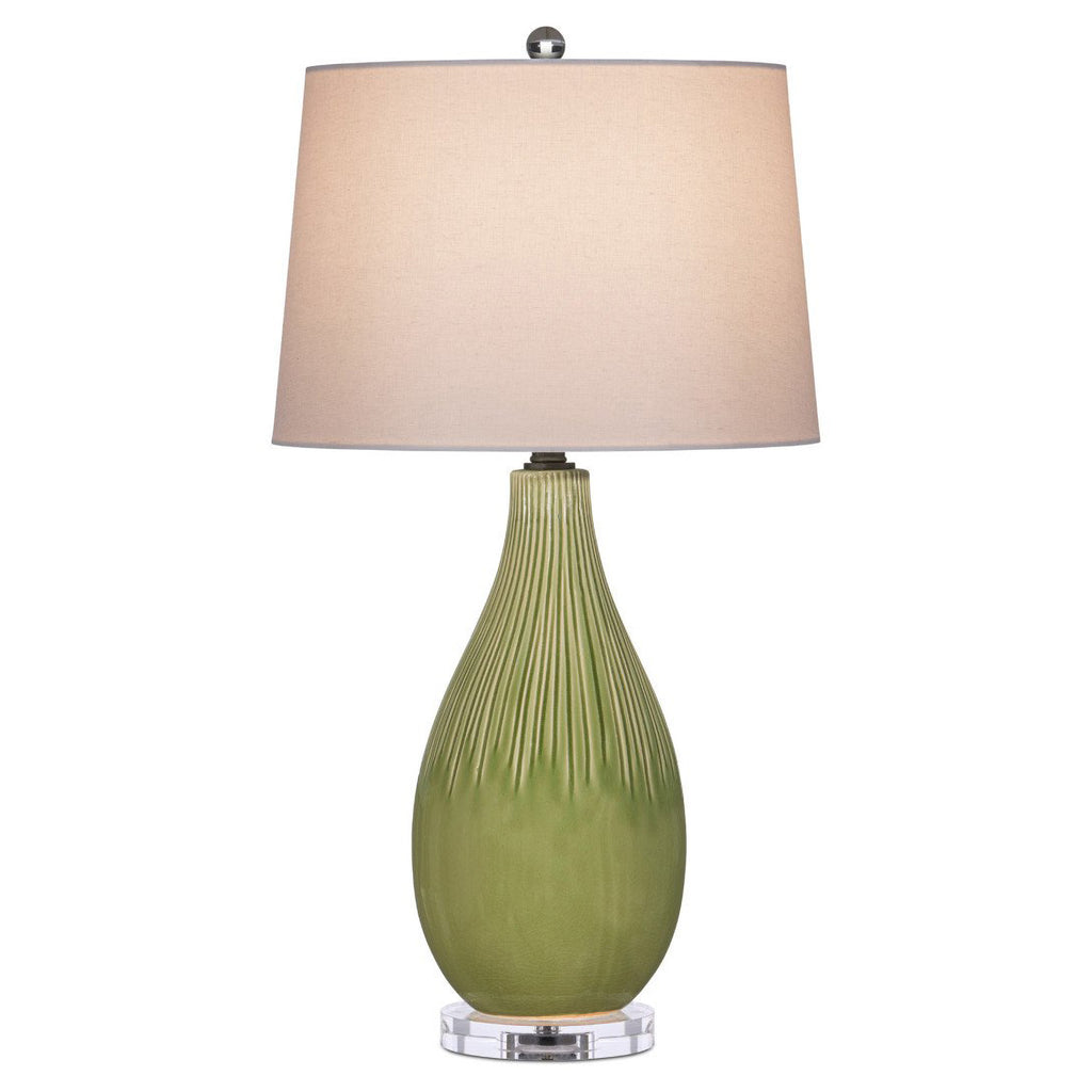 The Anjou Table Lamp is a glamorous creation made of ceramic with a rich green glazing that has been artfully applied to flow seamlessly down from the striations that are carved into the top section of the pear-shaped lamp. The optic crystal base and finial are luminous accents, and the satin brass finish on the hardware is warm in tone, as is the linen natural shade that tops the green lamp.