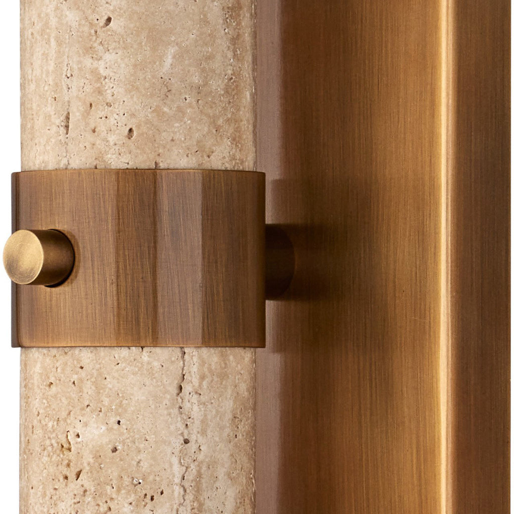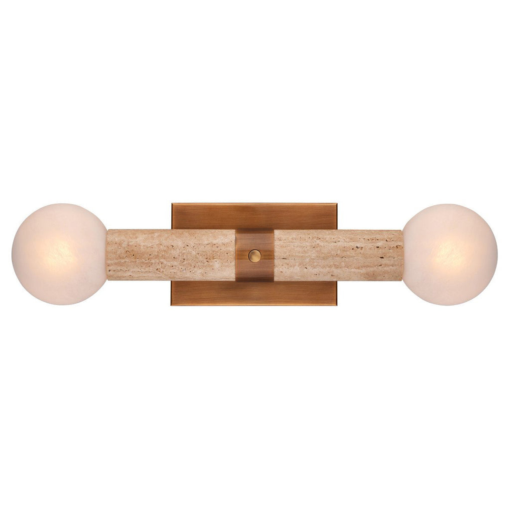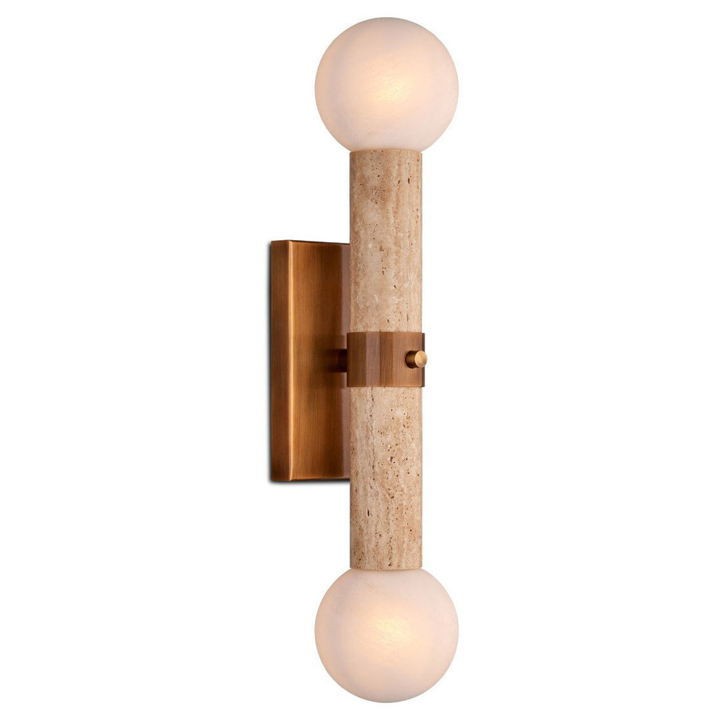 The Beatrix Bath Wall Sconce features a center column made of natural travertine that extends beyond each end of the wall-plate to hold globes made of textured art glass. The milky, mottled glass draws out the pale veins in the travertine or marble, while the antique brass finish on the metal brings warmth to the fixture. This wall sconce can be mounted horizontally or vertically, and the natural stone will vary from fixture to fixture.