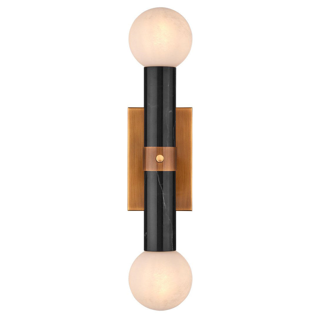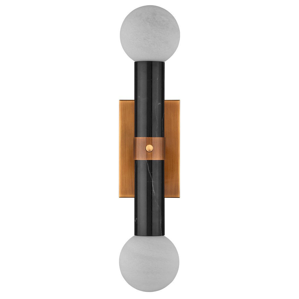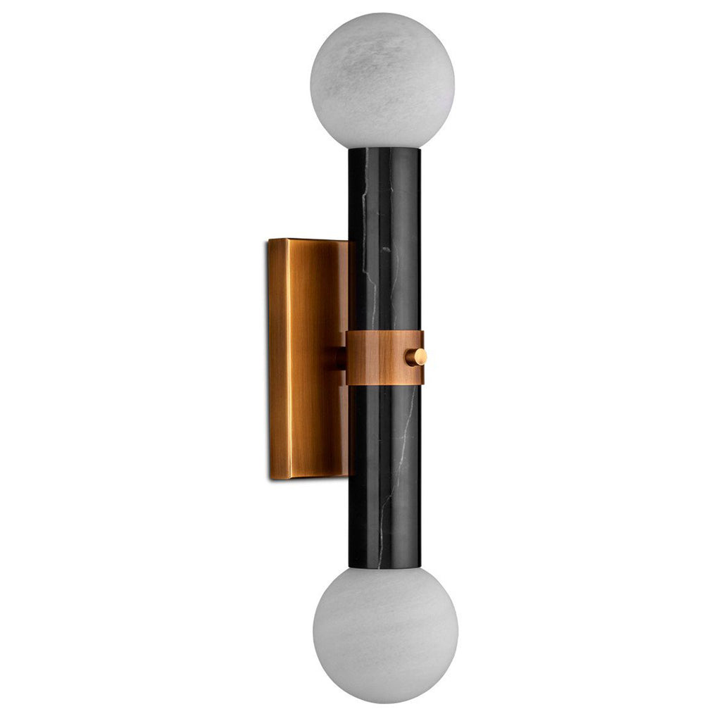 The Beatrix Bath Wall Sconce features a center column made of natural travertine that extends beyond each end of the wall-plate to hold globes made of textured art glass. The milky, mottled glass draws out the pale veins in the travertine or marble, while the antique brass finish on the metal brings warmth to the fixture. This wall sconce can be mounted horizontally or vertically, and the natural stone will vary from fixture to fixture.