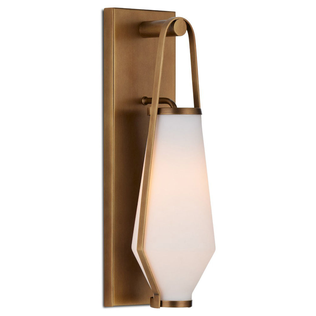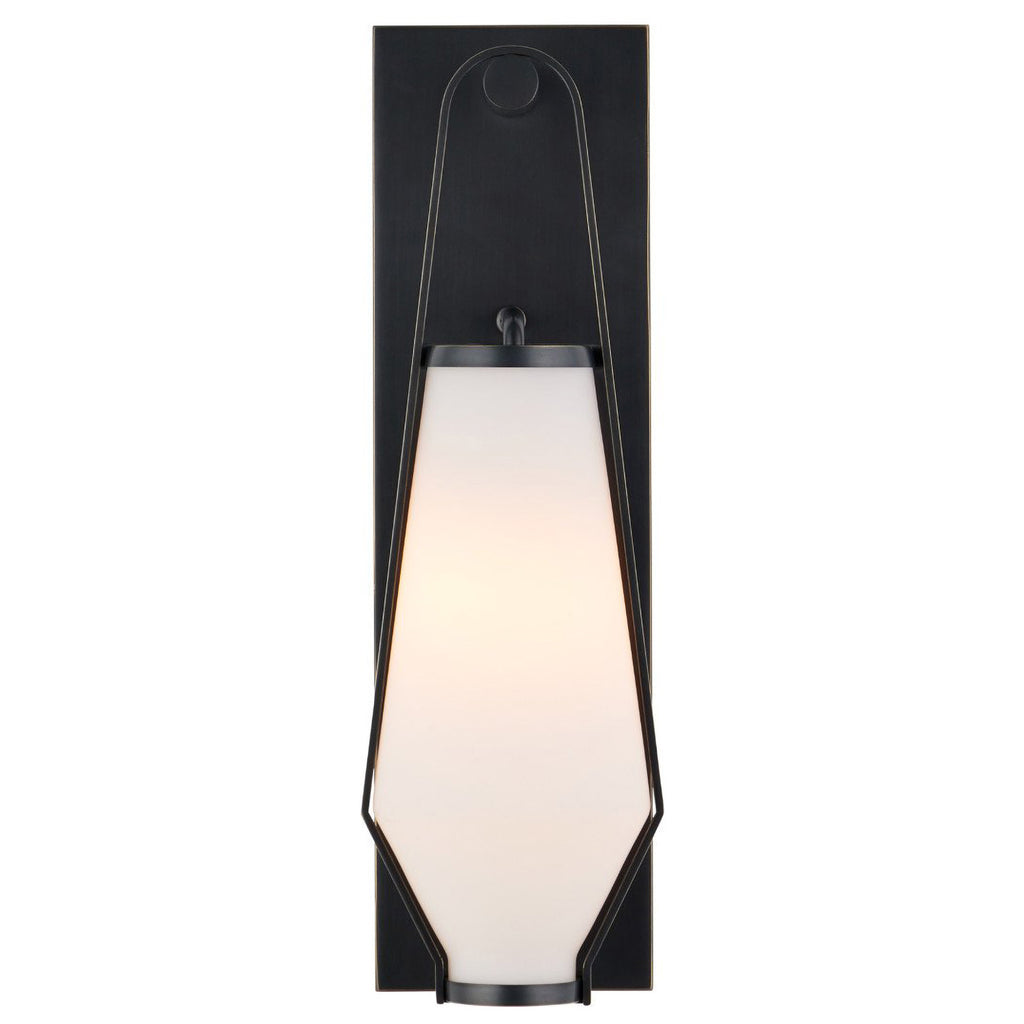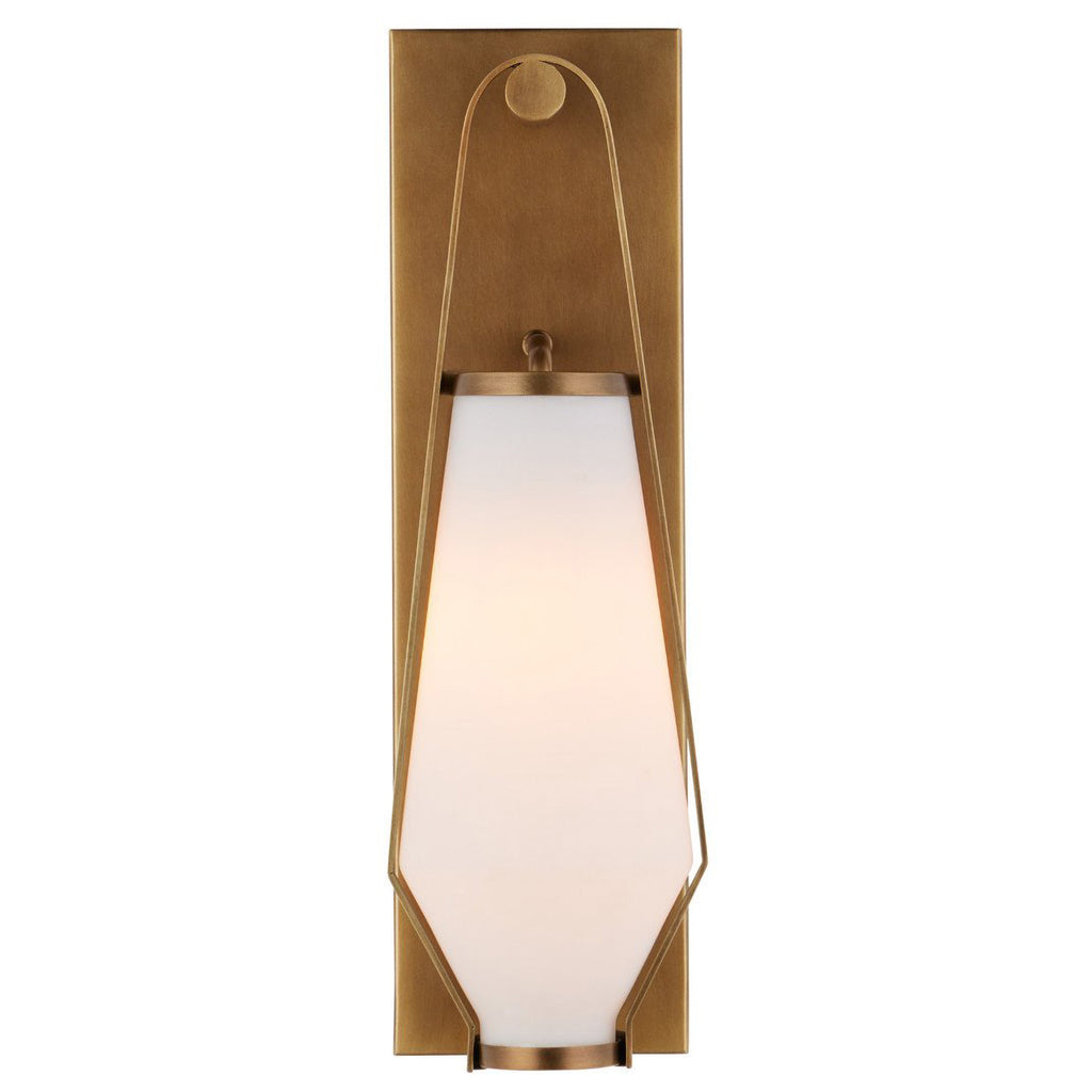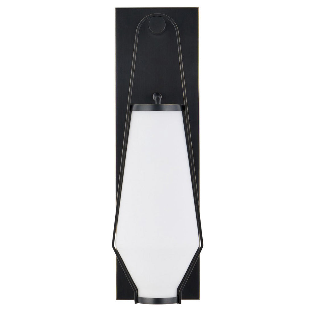 The Brompton Bath Wall Sconce dangles its shade like it is balancing a canister filled with illumination. Designed with a slim, rectangular wall-plate made of wrought iron in an oil-rubbed bronze or brass finish, the knob from which the shade hangs and the handle that cradles it are also in metal in the same finish. The opacity of the beautifully shaped shade on the black wall sconce creates a luminous glow.