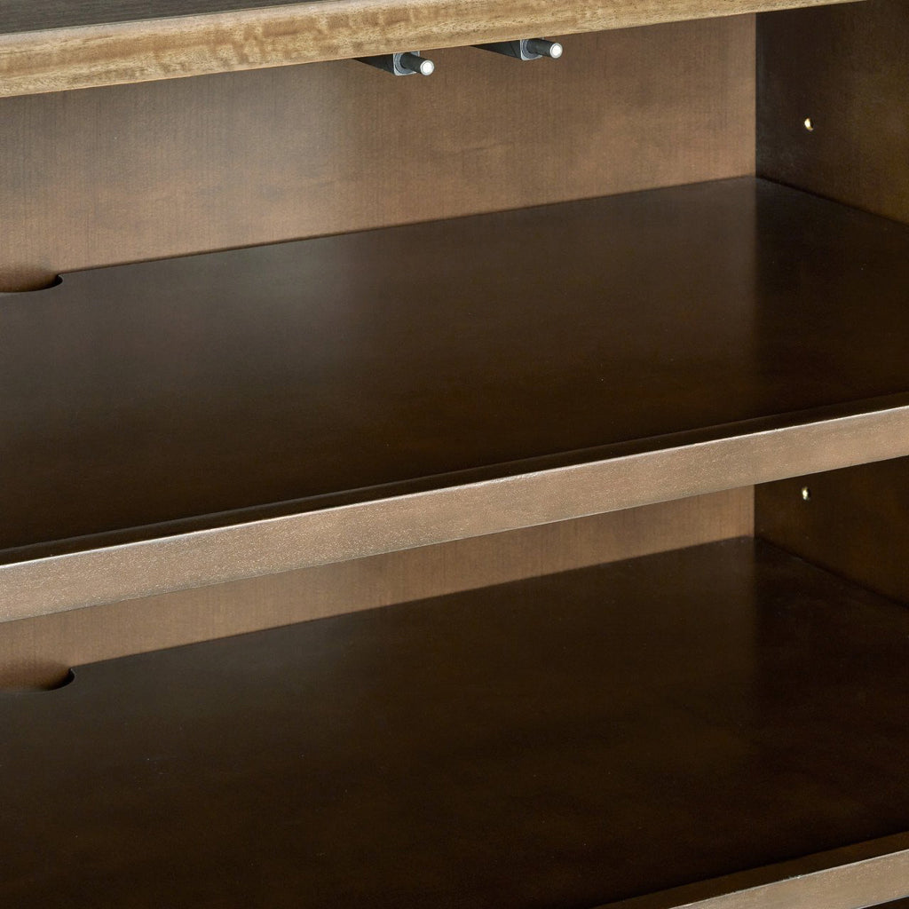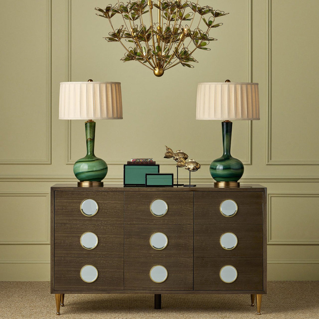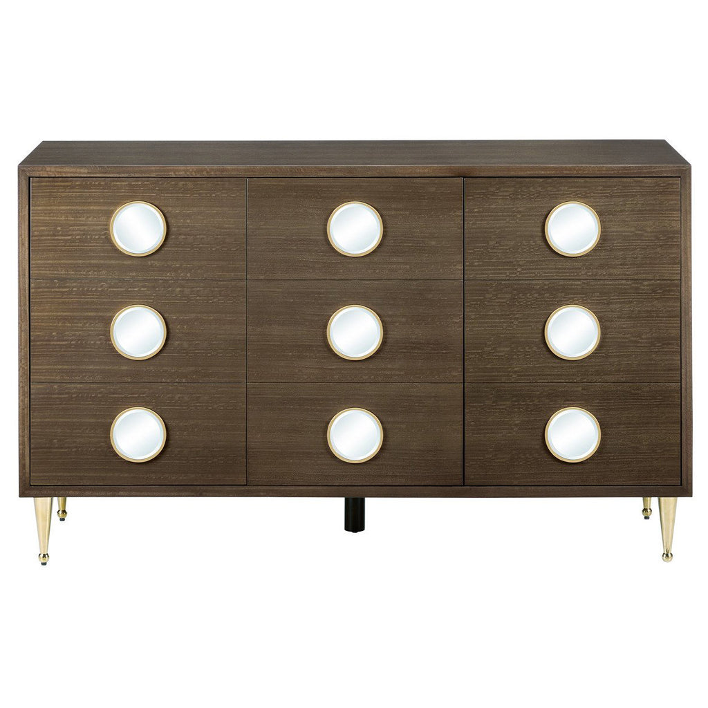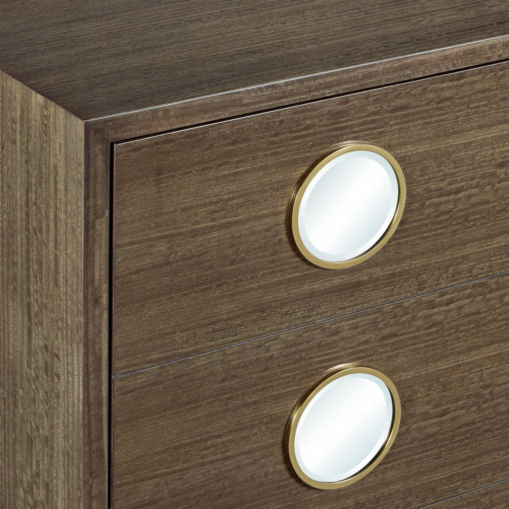 The Colette Cabinet is made of poplar wood that is covered in Eucalyptus veneers with a beautiful linear texture to them, heightened when finished in a tawny brown. Elevating the sophistication of the three-door cabinet is a high-gloss luster on the exterior. The luminous beveled mirror accents, which sit proud on the surface of the cabinet, are surrounded by stainless steel rings in a polished brass finish to match the ferrules on the legs.
