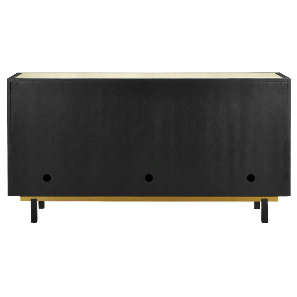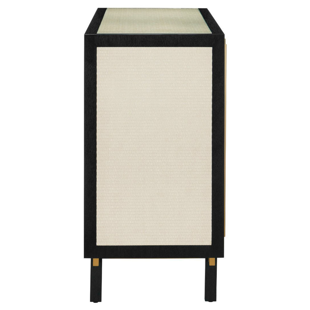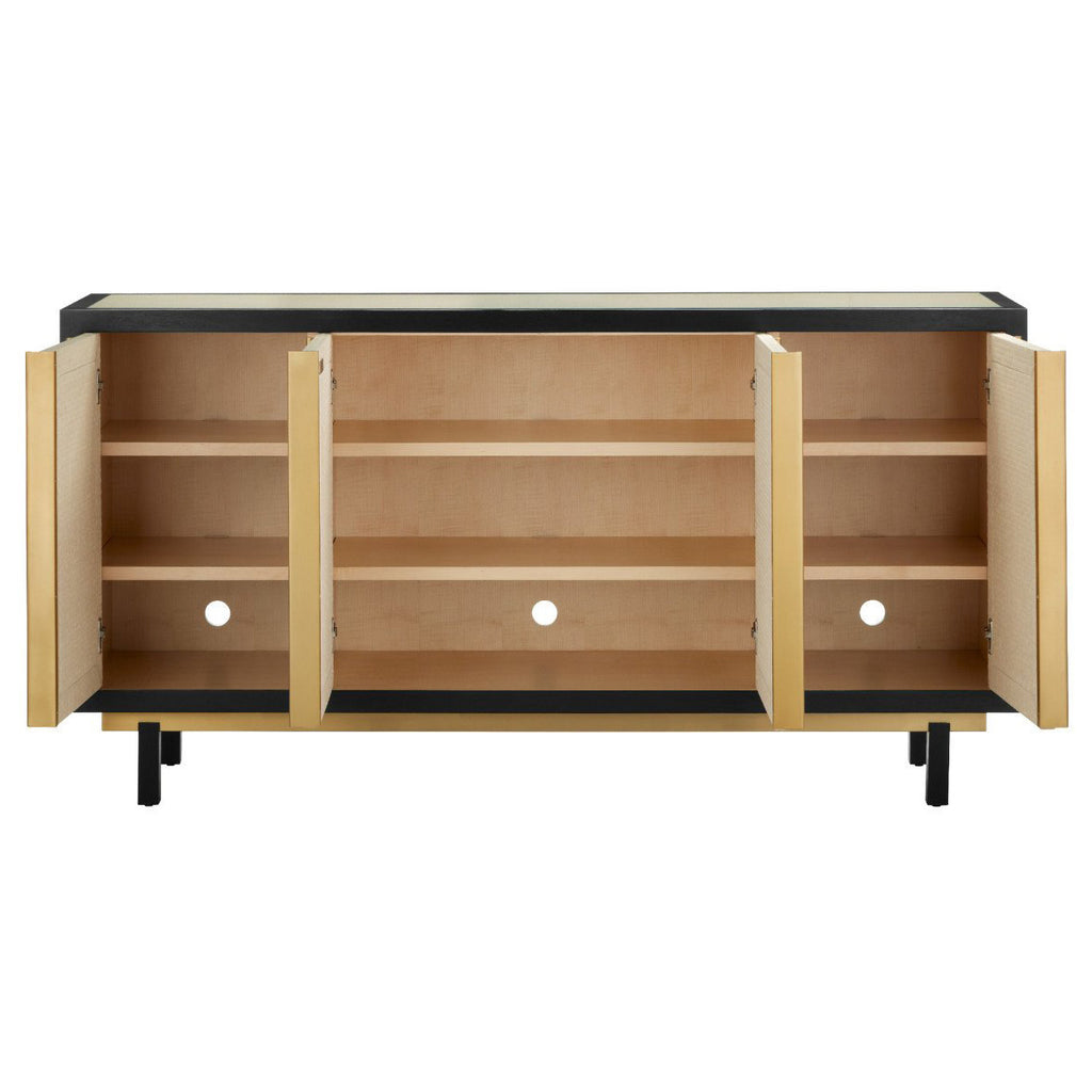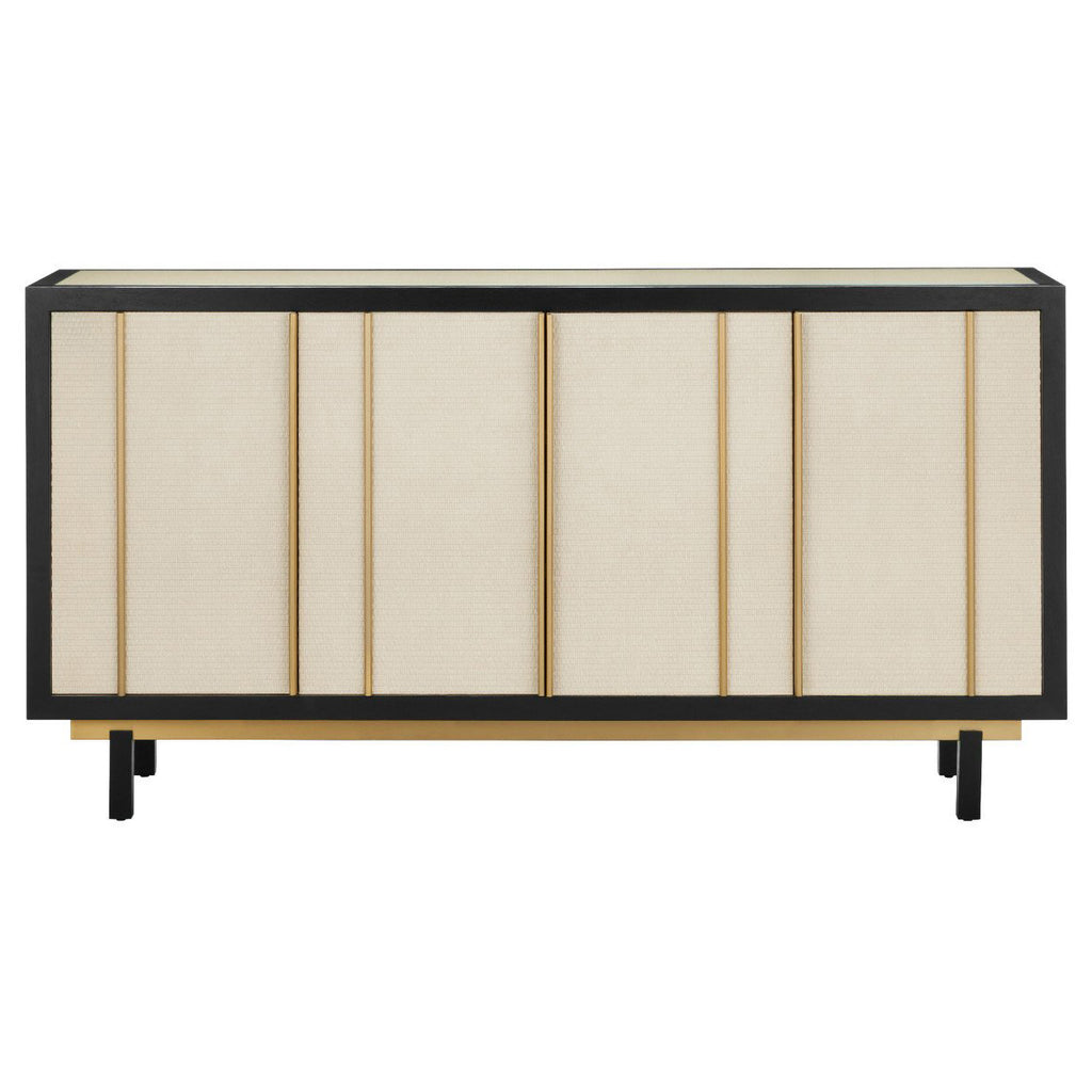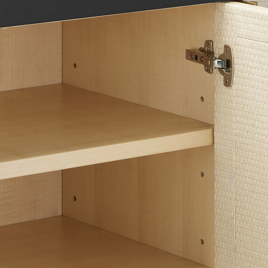 The Deanna Raffia Credenza has panels of woven raffia on its door-fronts, sides, and top that are surrounded by strips of Okoume wood in a black finish, matching the credenza’s legs. The combination of black and beige bring this credenza a tailored feel that fits within a wide spectrum of design styles, especially a room that exudes Hollywood glamour. The subtle texture of the raffia is a special aspect of this design, as is the fact the credenza is fitted with an inset glass top to protect the natural fibers. Linear door handles and a plinth base are made of metal in a brushed brass finish to bring added elegance to the piece.