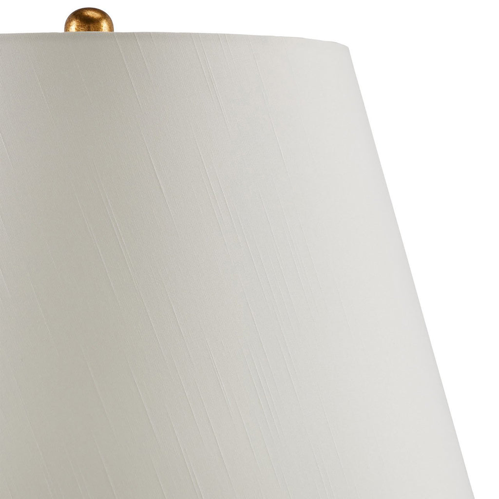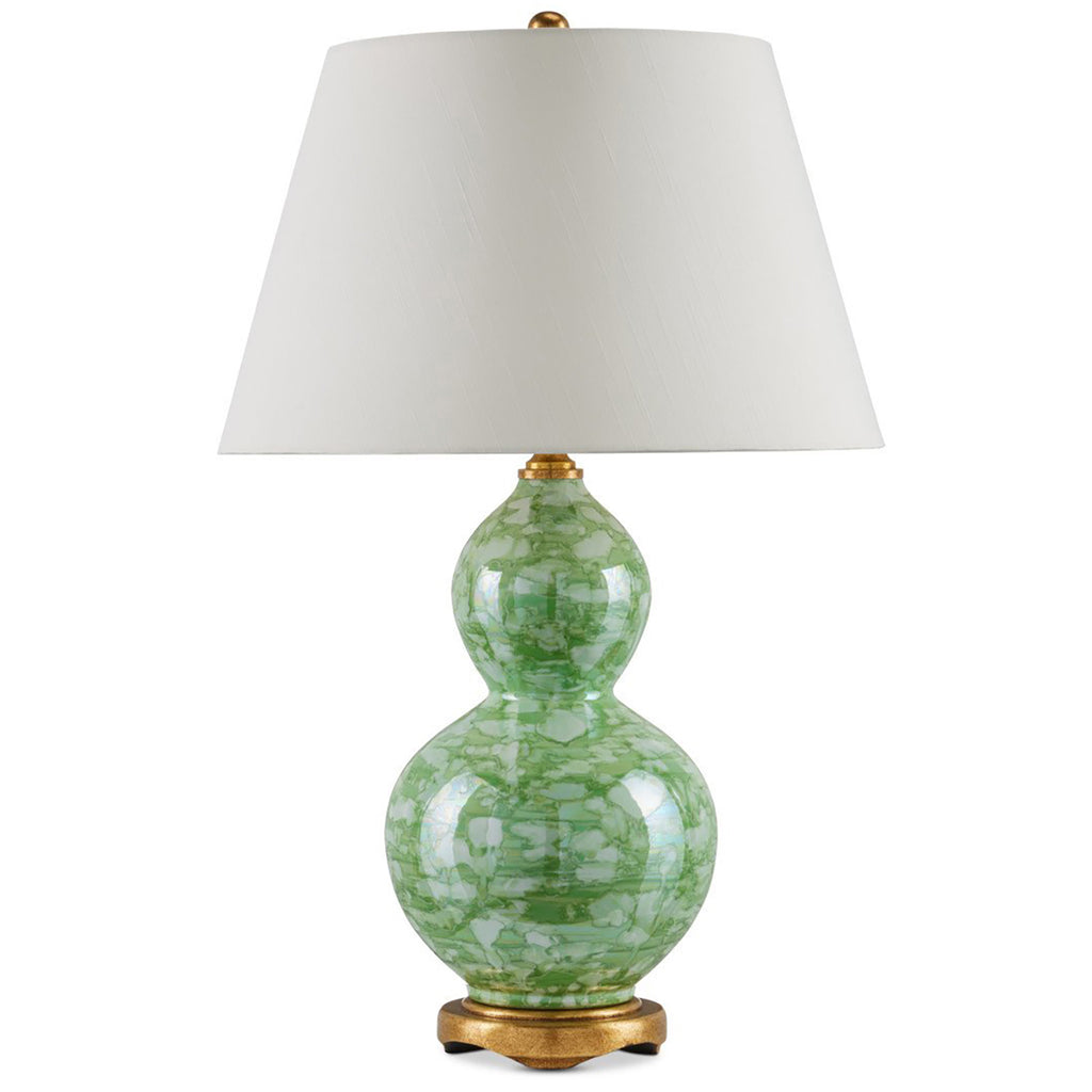 The name of the Currey & Co Eau de Nil Table Lamp was inspired by its pale green color, the sound as graceful as the design. Made of porcelain, the surface of the patterned double-gourd shaped body looks as if it is floating with clouds. The textured antique gold leaf on the metal and the wood base bring a warmth to the overall design. An empire shade is held in place by a matching gold finial.