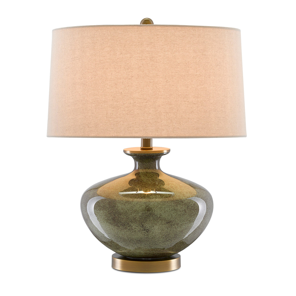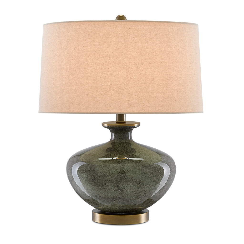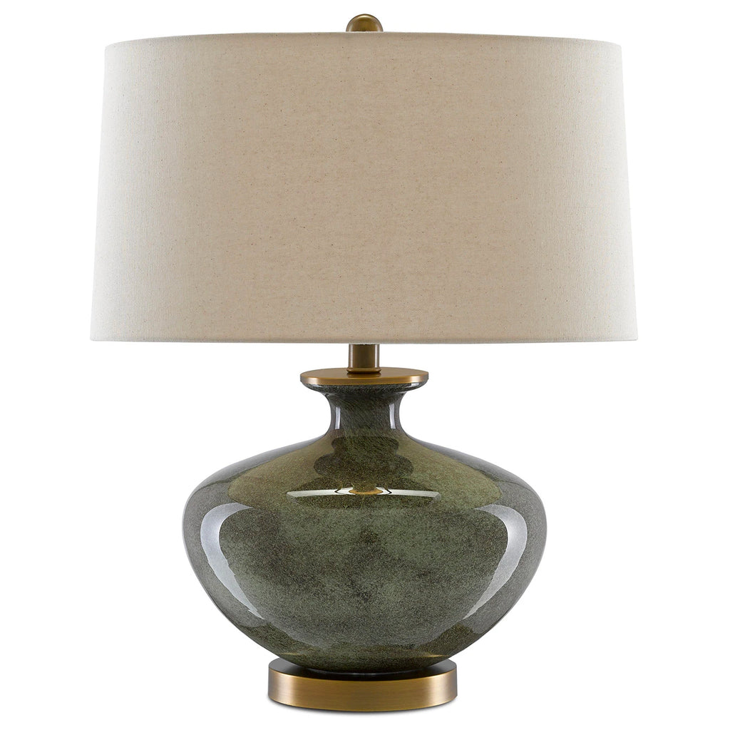 The Currey & Company Greenlea Table Lamp is made of glass with an intermingling of dark gray and moss green swirling on its surface. The base, finial, and hardware in an antique brass finish complement the natural linen shade.
