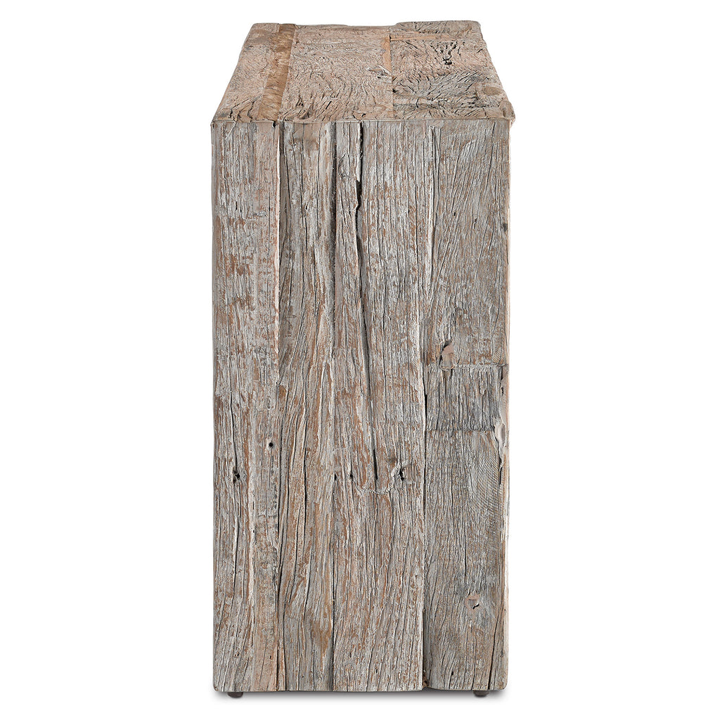 Made of pieces of reclaimed wood, the Currey & Company Kanor Console Table is a study in textural patina. Built with sustainability in mind, the aged wood console table with its whitewash finish is naturally distressed.