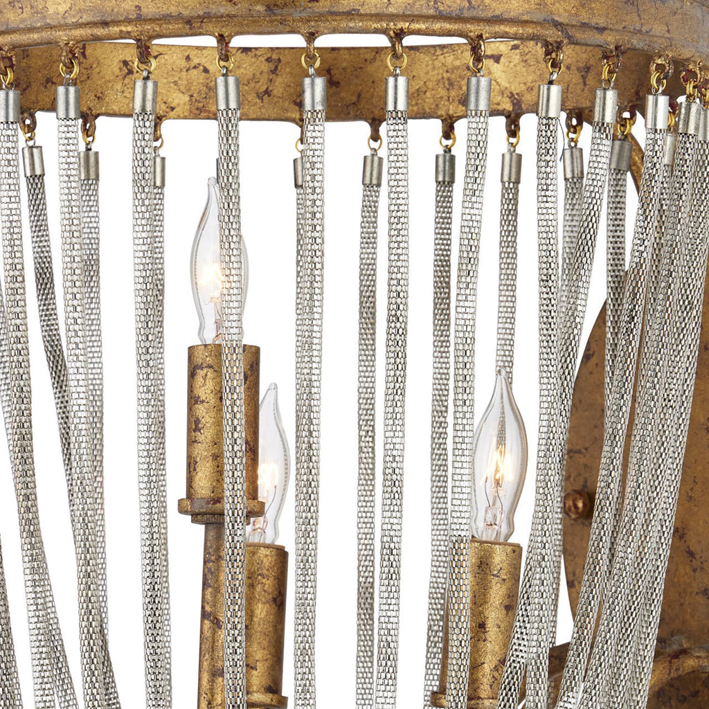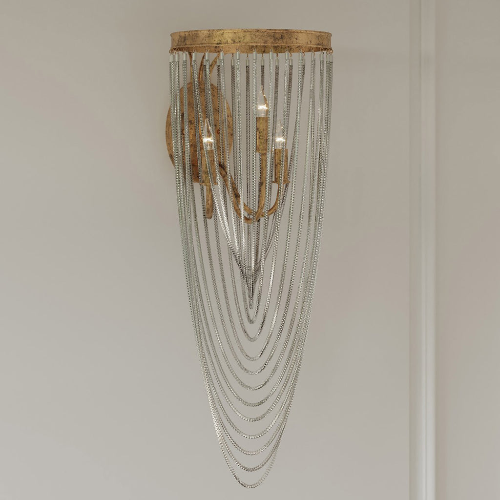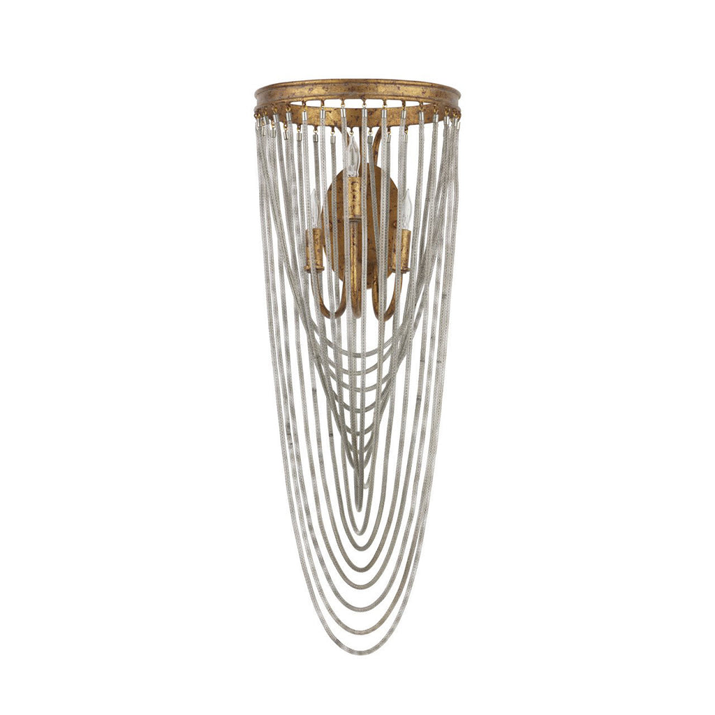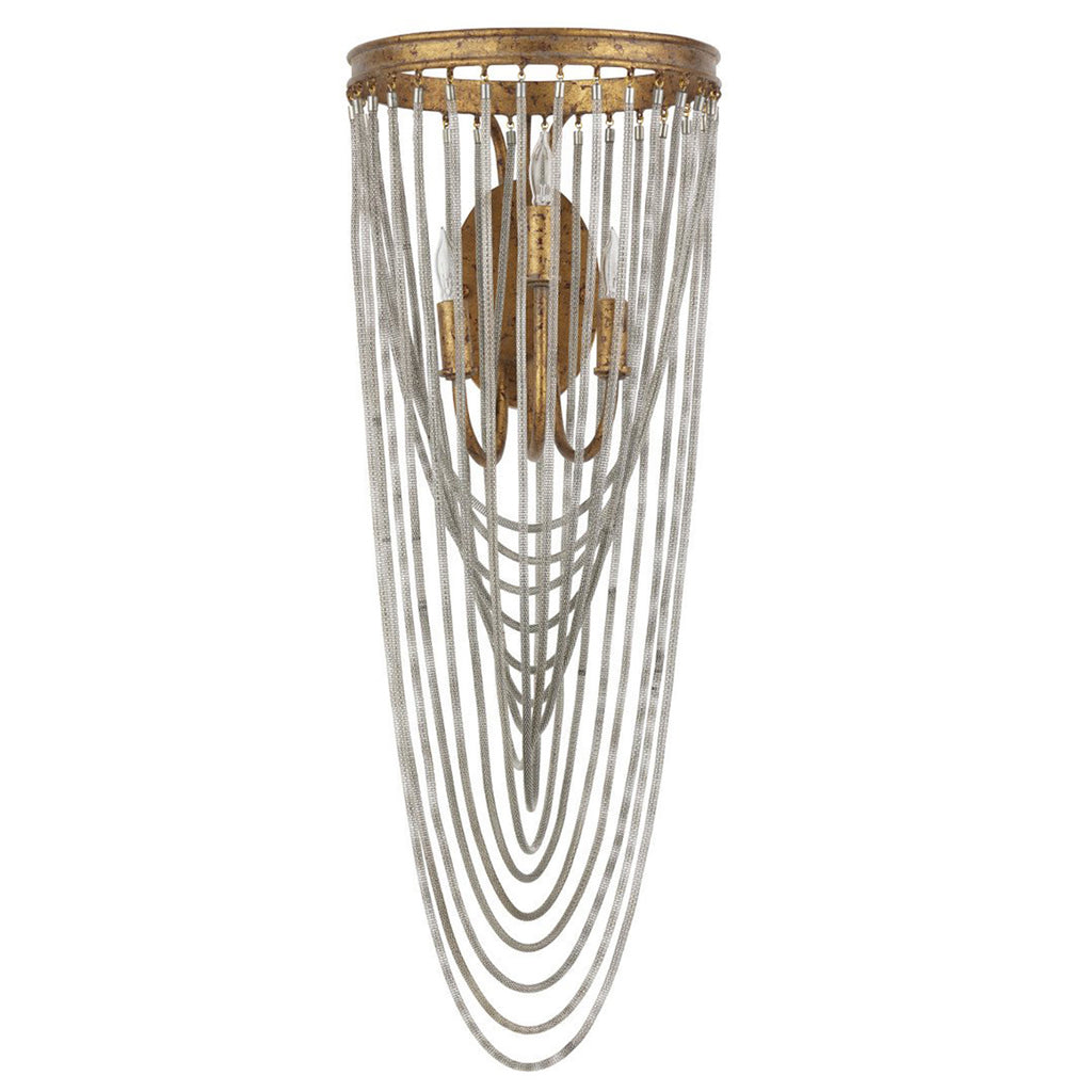 The dainty chains looping from point to point on the circular ring of the Currey & Co Lucien Wall Sconce are draped methodically and intentionally in a crisscross pattern. These bring this gold wrought iron sconce a sense of old world style, which is furthered by the French gold leaf finish on the metal. This gold sconce will grace a space like a piece of jewelry.