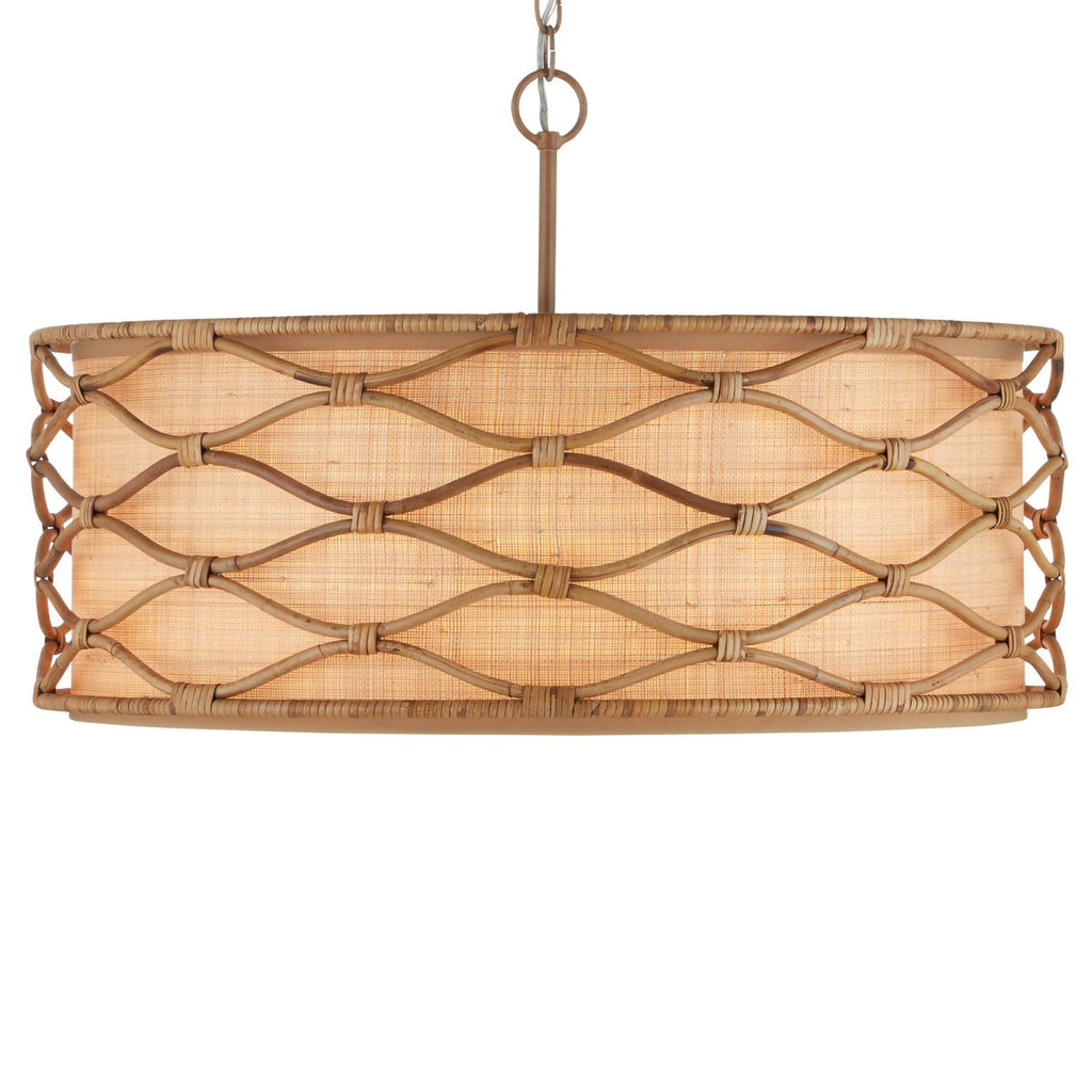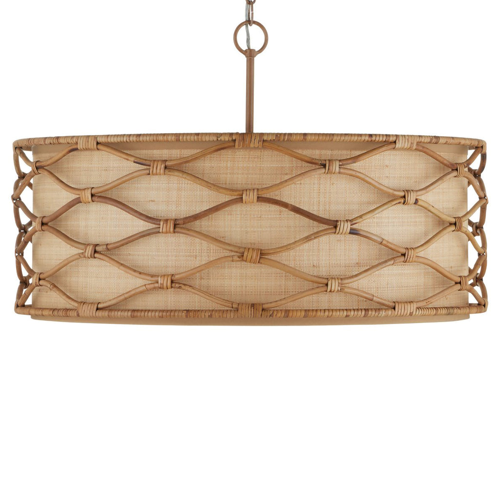 The Partita Pendant is a natural material story through and through. The illumination is softened from the sides and the bottom by grasscloth that shows off its subtle texture when the light filters through it. Surrounding the shade is a rattan pattern that flows elegantly without seeming to begin or end. The process to create this ornamentation is painstaking, as the rattan is steamed and bent by hand, then bound together with thin bands of the same material. To be consistent with the overall color of the other elements, the wrought iron frame and hardware on the pendant are finished in a saddle tan.