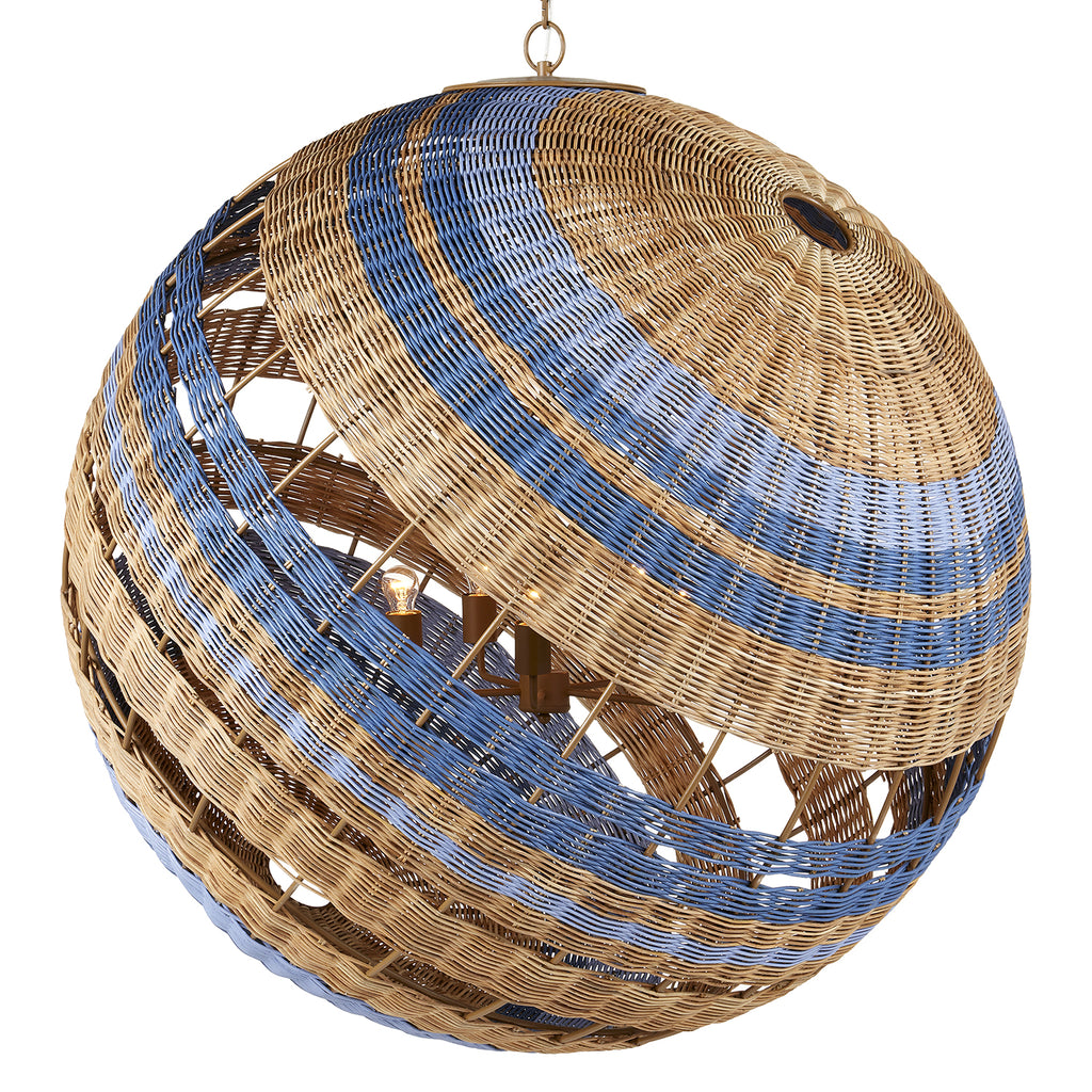 Hiroshi Koshitaka envisioned the Senjyo Tilted Orb Chandelier as one of a number of fixtures he sees as fulfilling Saisei, a concept that encompasses the acts involved in regeneration and reproduction as we restore, revive, and experience regrowth and rebirth. Rattan is woven around a wrought iron frame in stripes that graduate from a khaki finish to Bluebonnet and Cornflower blue finishes. With this tan and blue pendant, Koshitaka stays true to exploring his fascination with the Color Field tradition of the 1940s, which has been a constant in his repertoire for decades.