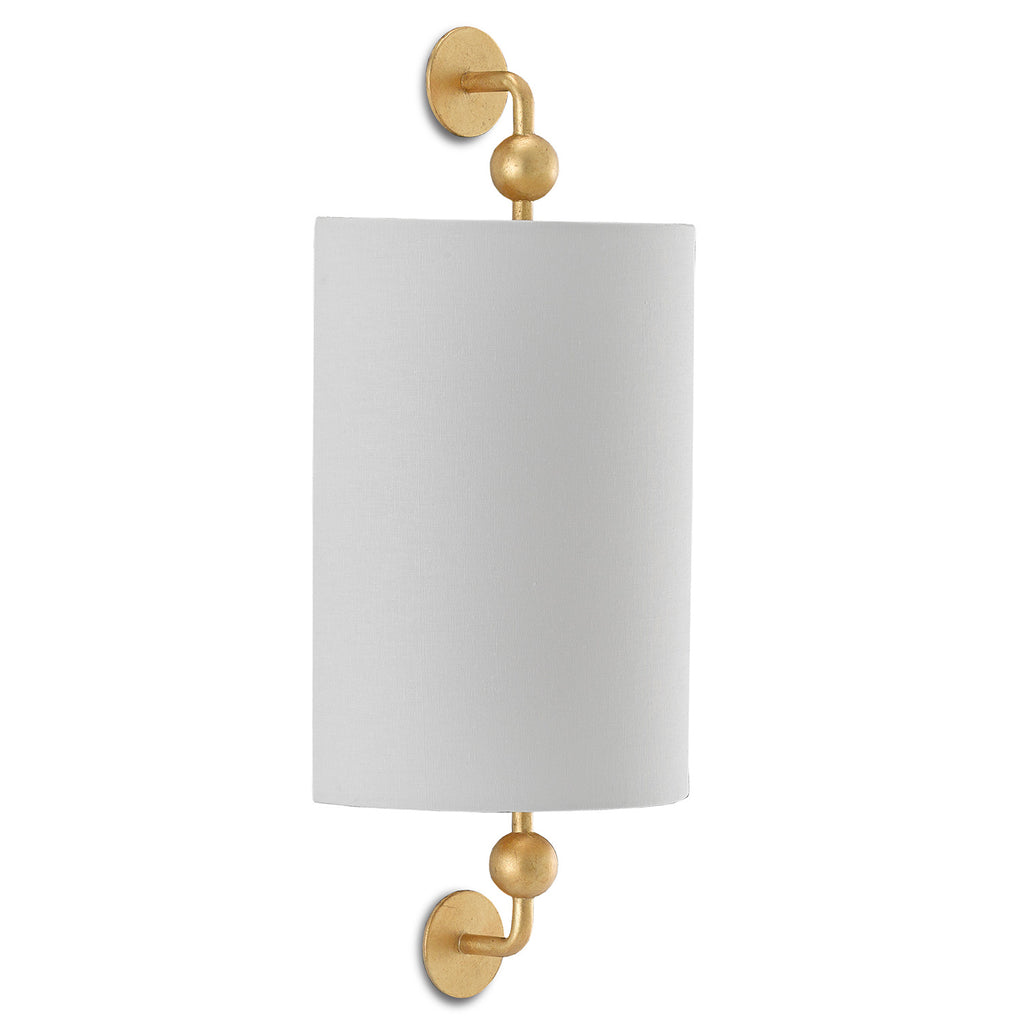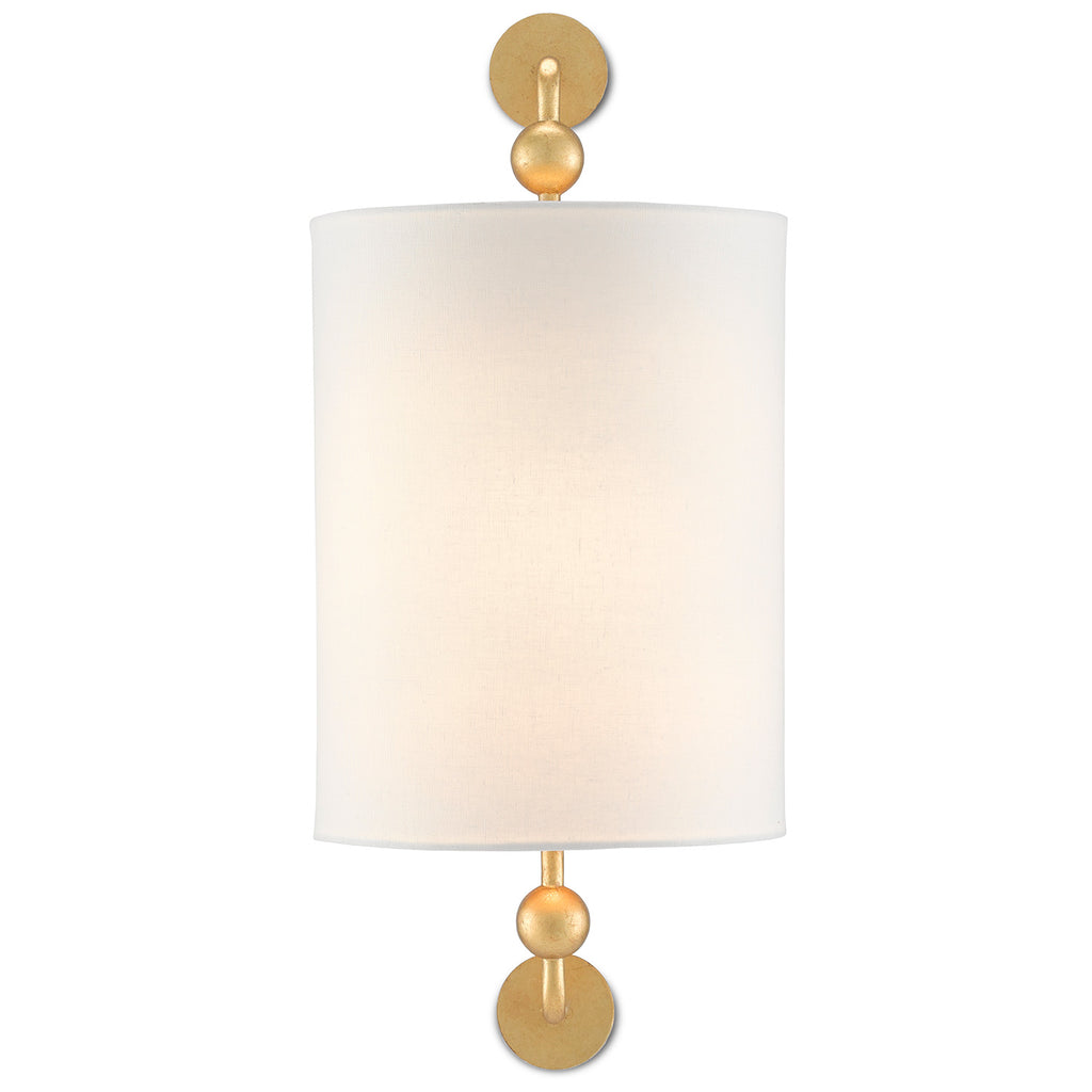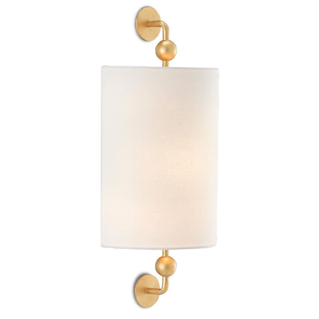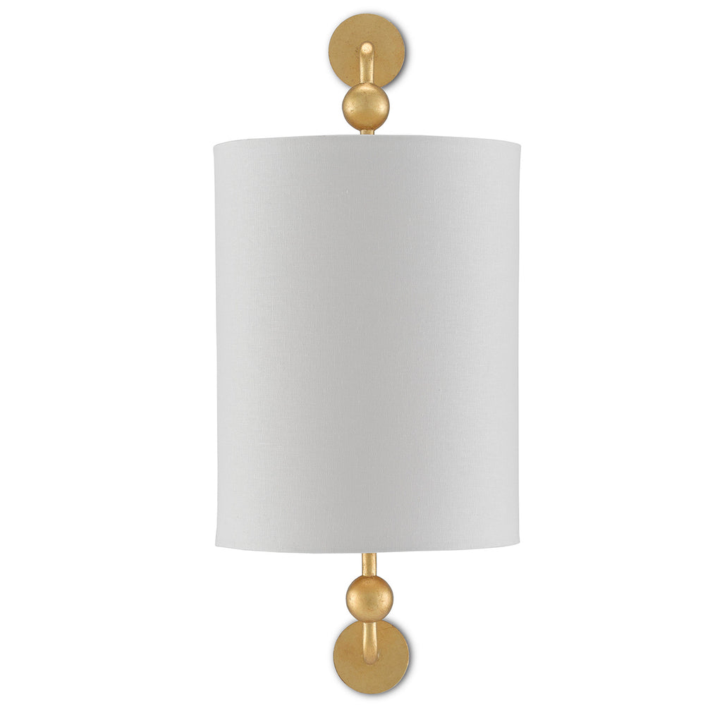 Tiny globes ornament the arms that affix the off-white linen shade of the Currey & Company Tavey Wall Sconce to its spot on the wall. Made of wrought iron in a contemporary silver leaf or gold leaf finish, the metal gleams when the light is switched on. The Currey & Company design team gave this stylish sconce an added advantage by designing it so that it meets ADA requirements.