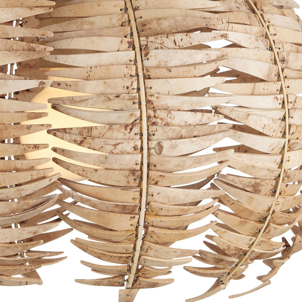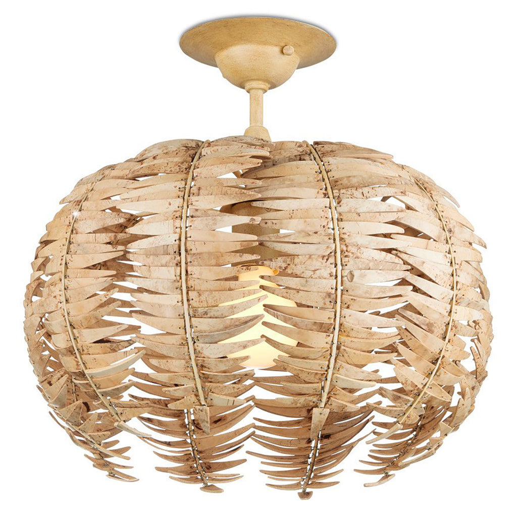 A tremendous amount of effort goes into creating the Currey & Co Tiptur Semi-Flush Mount, as the coconut shells are cut, bleached, drilled, and pinned to the frame by hand to form its orb shape. Tied to thin ribs of wrought iron in a coco cream finish, the color of the shells blends beautifully with the metal to create a veritable work of art.