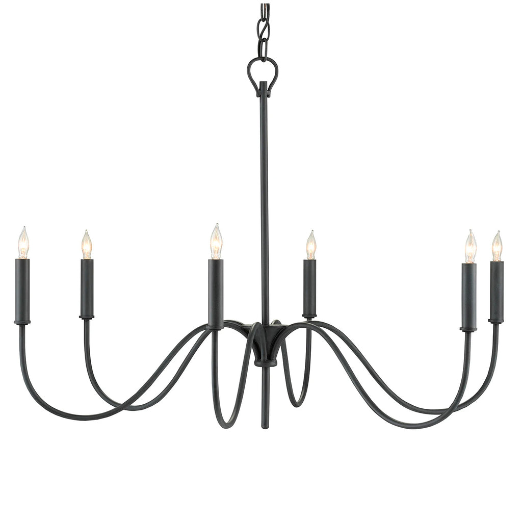 A nod to Early American style, the Currey & Company Tirrell Chandelier has graceful arms that arc upward to hold its candle sleeves with simple dignity. The black chandelier is made of wrought iron in an antique black finish.