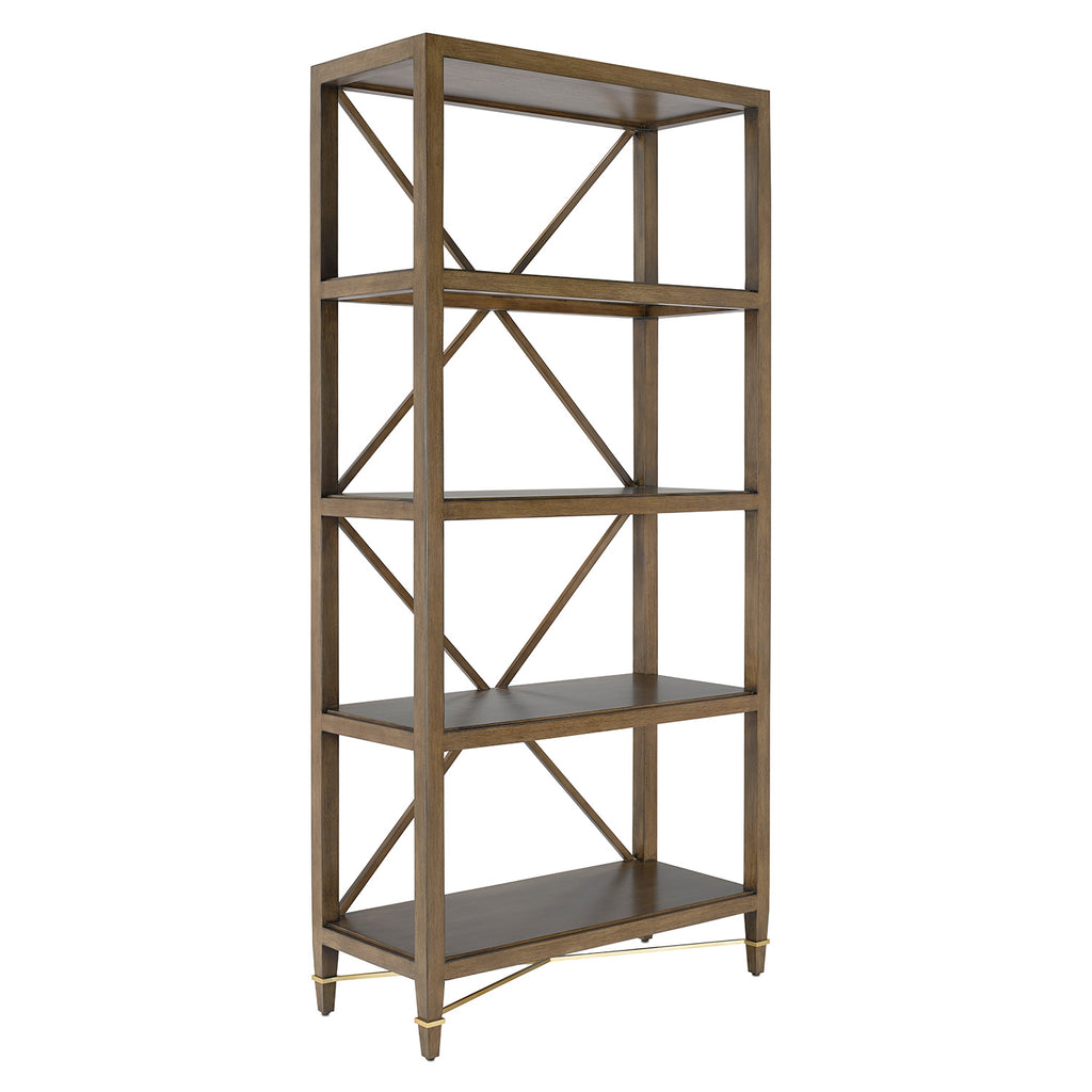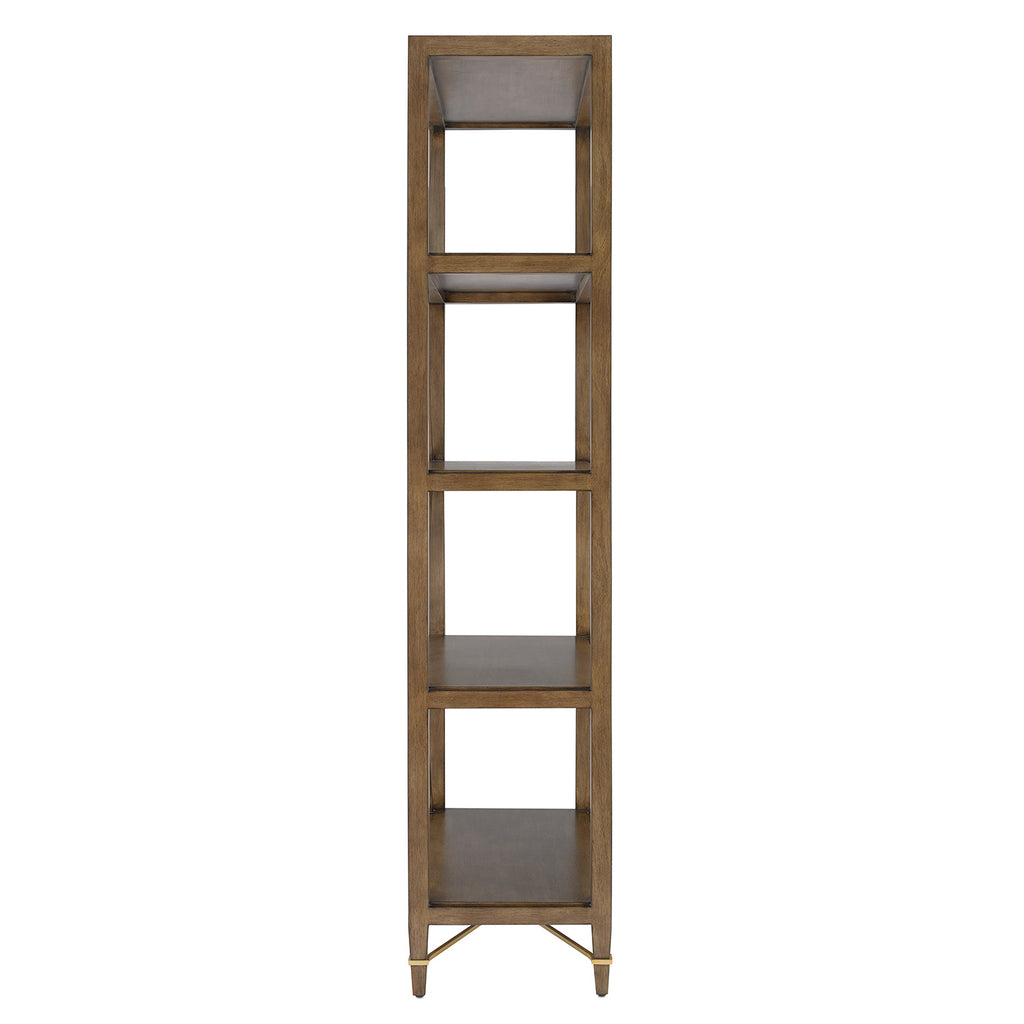 Made of mahogany in a woodland-inspired chanterelle finish, the Currey & Company Verona Chanterelle Étagère is warmly handsome with its metal detailing in a champagne finish. The stretchers on this brown étagère bring it its flair.