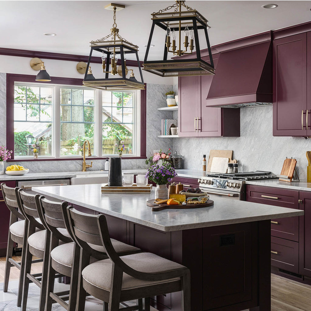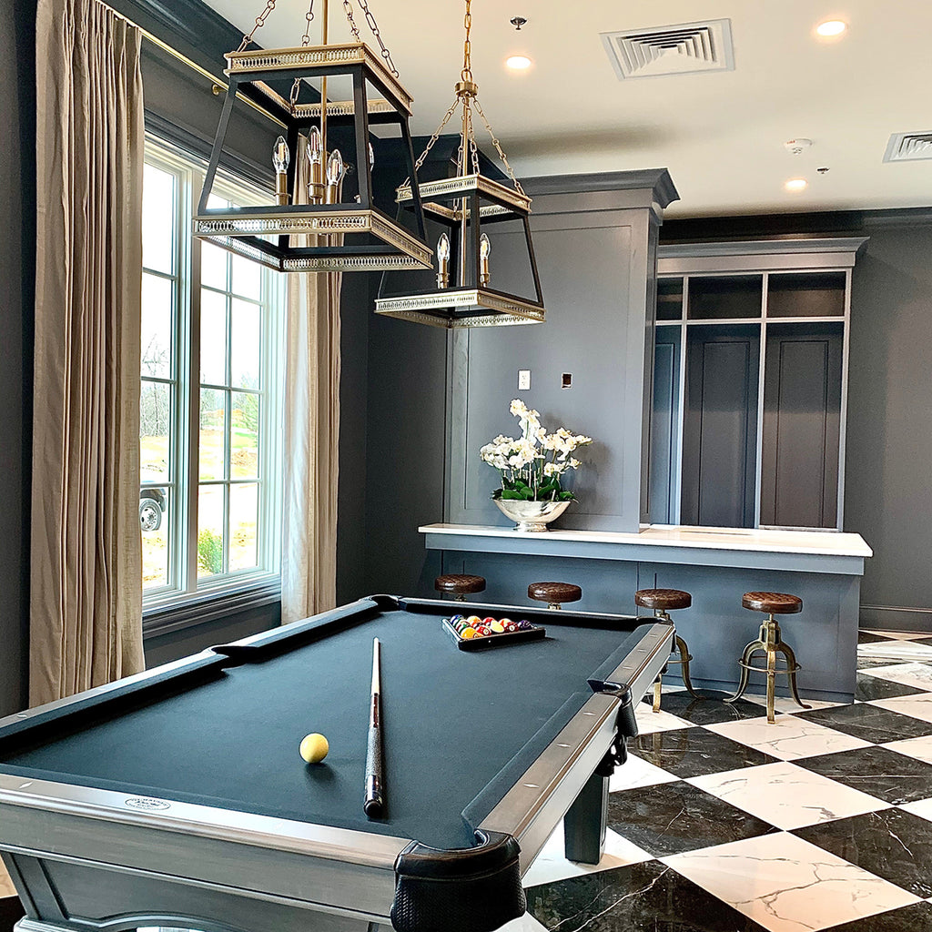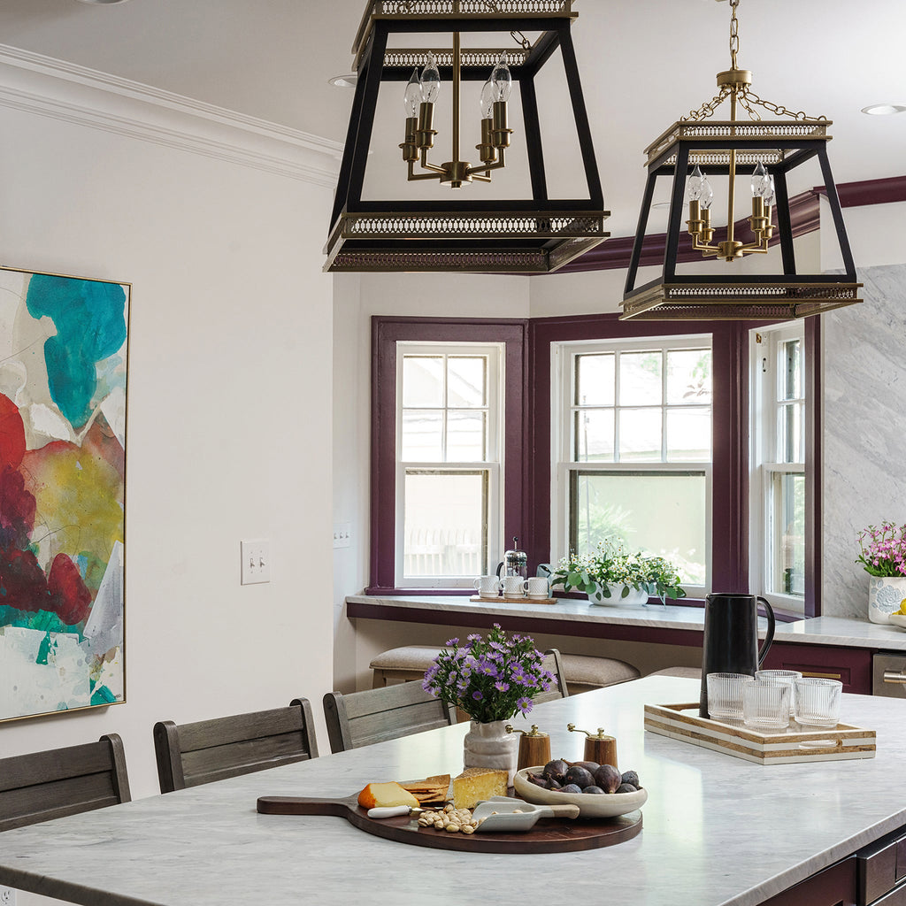 The charming four-light Gerard pendant draws inspiration from neo-nostalgic French country design. The two-tone, aged brass/black fixture sports an open frame with four candelabra sockets nestled neatly within. The crown of the enclosed structure boasts ornate molding that attaches to the matching chain suspension system. This luminary is the perfect fixture to showcase in multiples over your traditional kitchen island, to line down your modern farmhouse hallway, or to hang over your cute and cozy reading nook. With ample illumination cast from the light source, the Gerard pendant delivers in its function as much as it does its beautiful form.