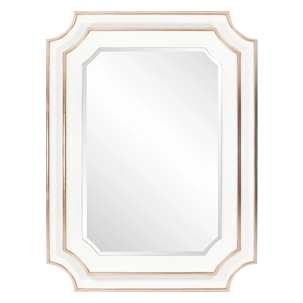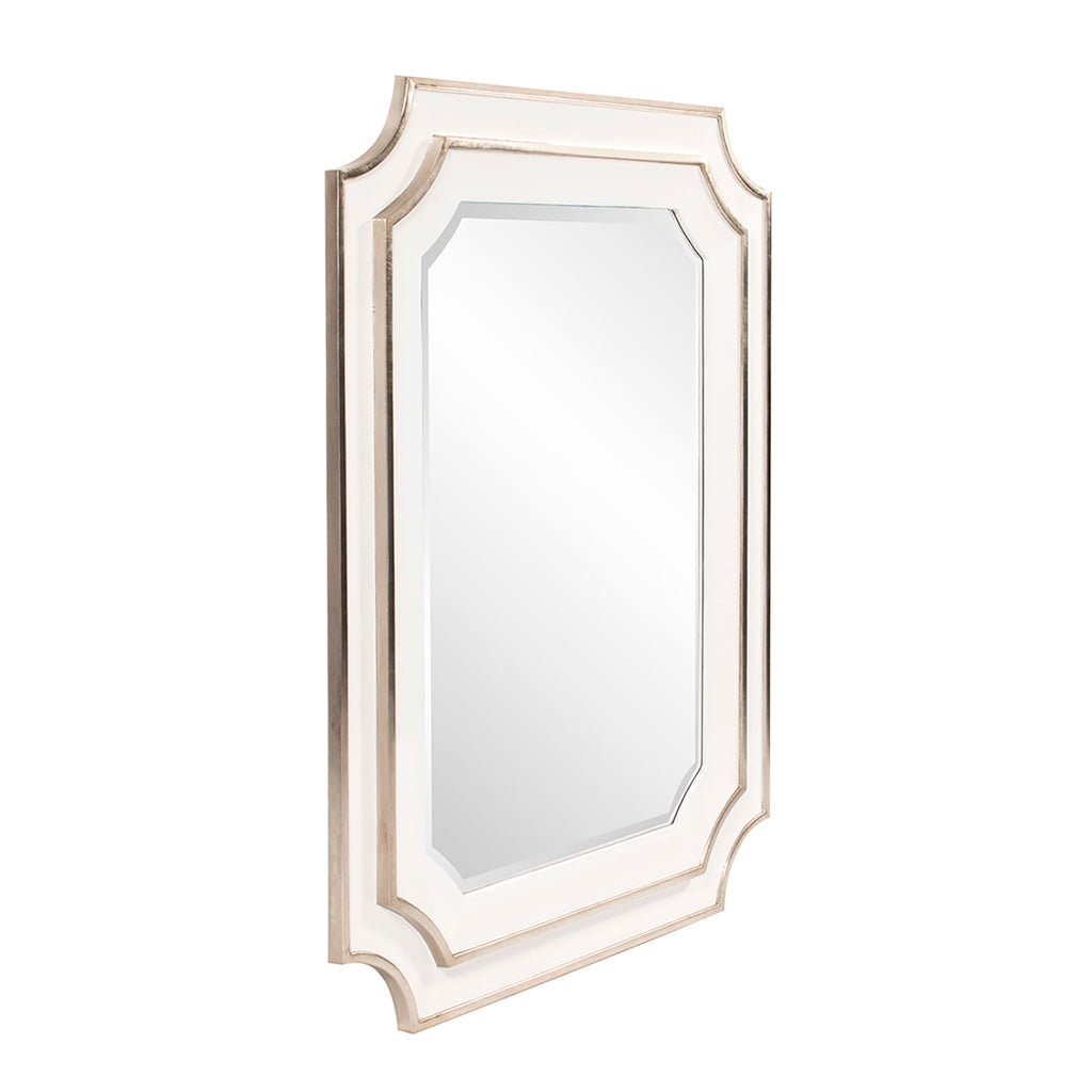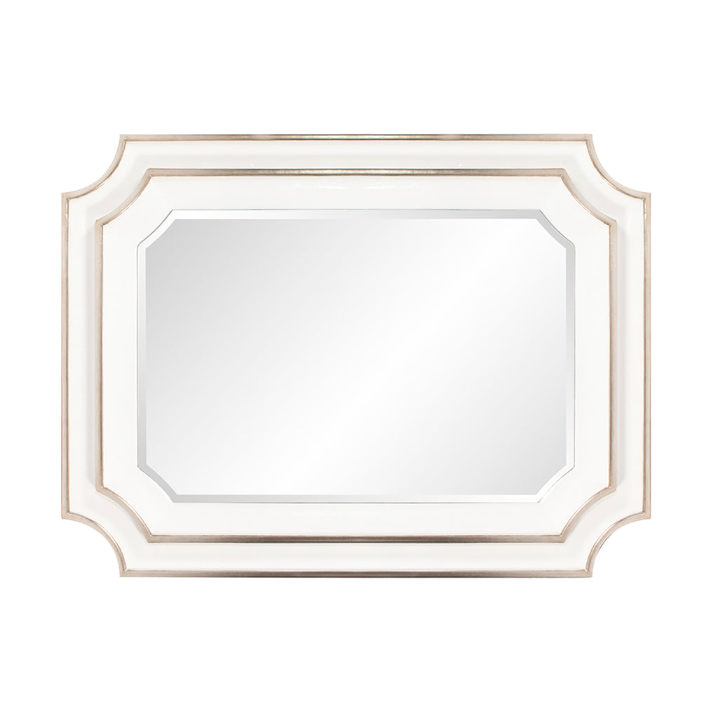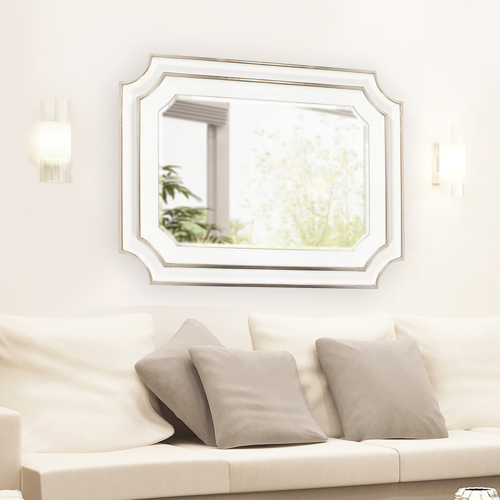 The Dante Mirror is a gorgeous piece. It is fashioned with an Art Deco flair. The main frame is rectangular with scalloped corners. It is then finished in a lovely glossy white lacquer, then trimmed on the inner and outer borders in a gorgeous silver leaf. It is a perfect focal point for an entryway, bathroom, bedroom or any room in your home. D-rings are affixed to the back of the mirror so it is ready to hang right out of the box in either a horizontal or vertical orientation!