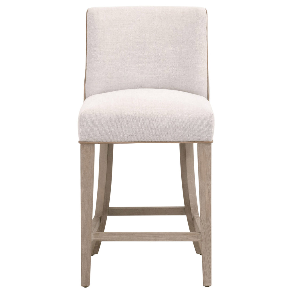 Elevate your kitchen or bar area with the Duet Counter Stool by Essentials For Living. Showcasing a transitional style, this stool seamlessly blends classic and contemporary elements for a versatile and chic seating solution. The frame, crafted from solid ash wood, features a refined natural gray finish, lending a sophisticated touch to any space. The seat boasts a distinctive two-tone design, with high-performance Bisque French Linen on the front and a vegan leather and polyester blend in Ivanhoe-Toast on the back, ensuring both resilience and easy maintenance. Accentuated with meticulous contrast edge piping detail, the stool exudes tailored elegance. The solid wood legs are complemented by a four-way footrest, enhancing stability and convenience. It measures 20" wide, 25" deep, and 39" high, with a seat height of 27". This stool combines impeccable quality, thoughtful design, and precise dimensions to enhance and complement any interior.