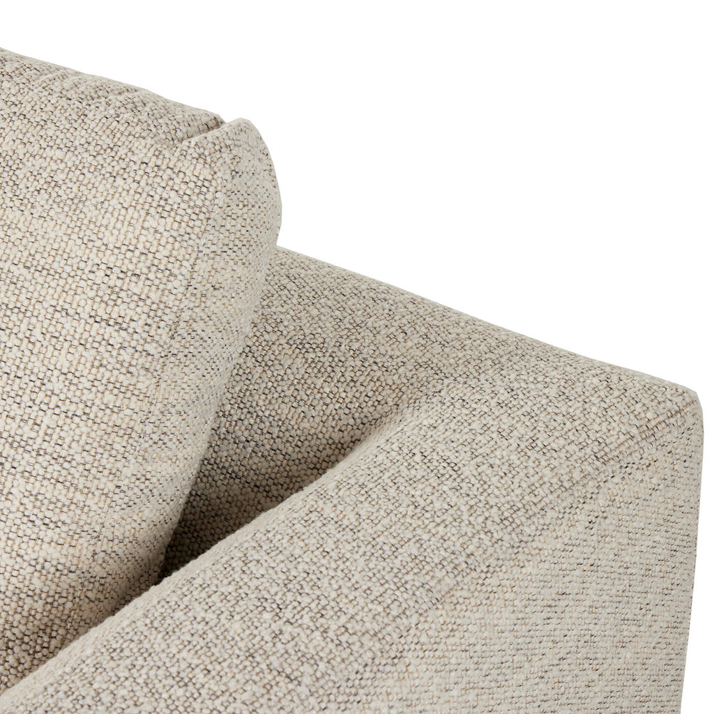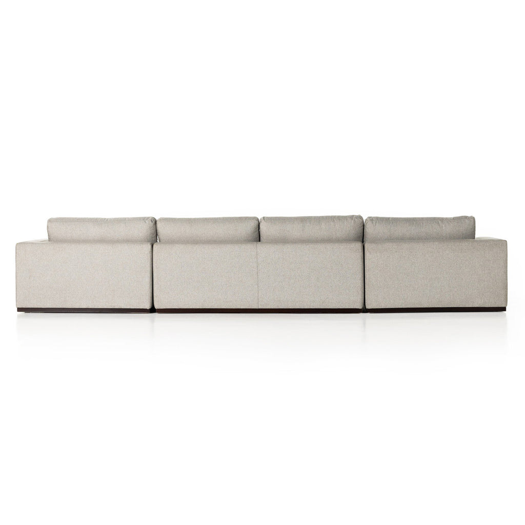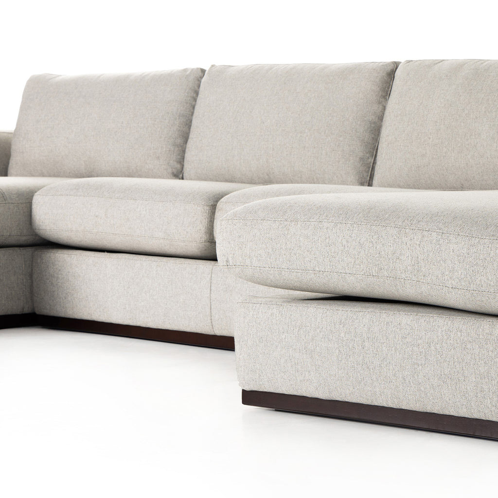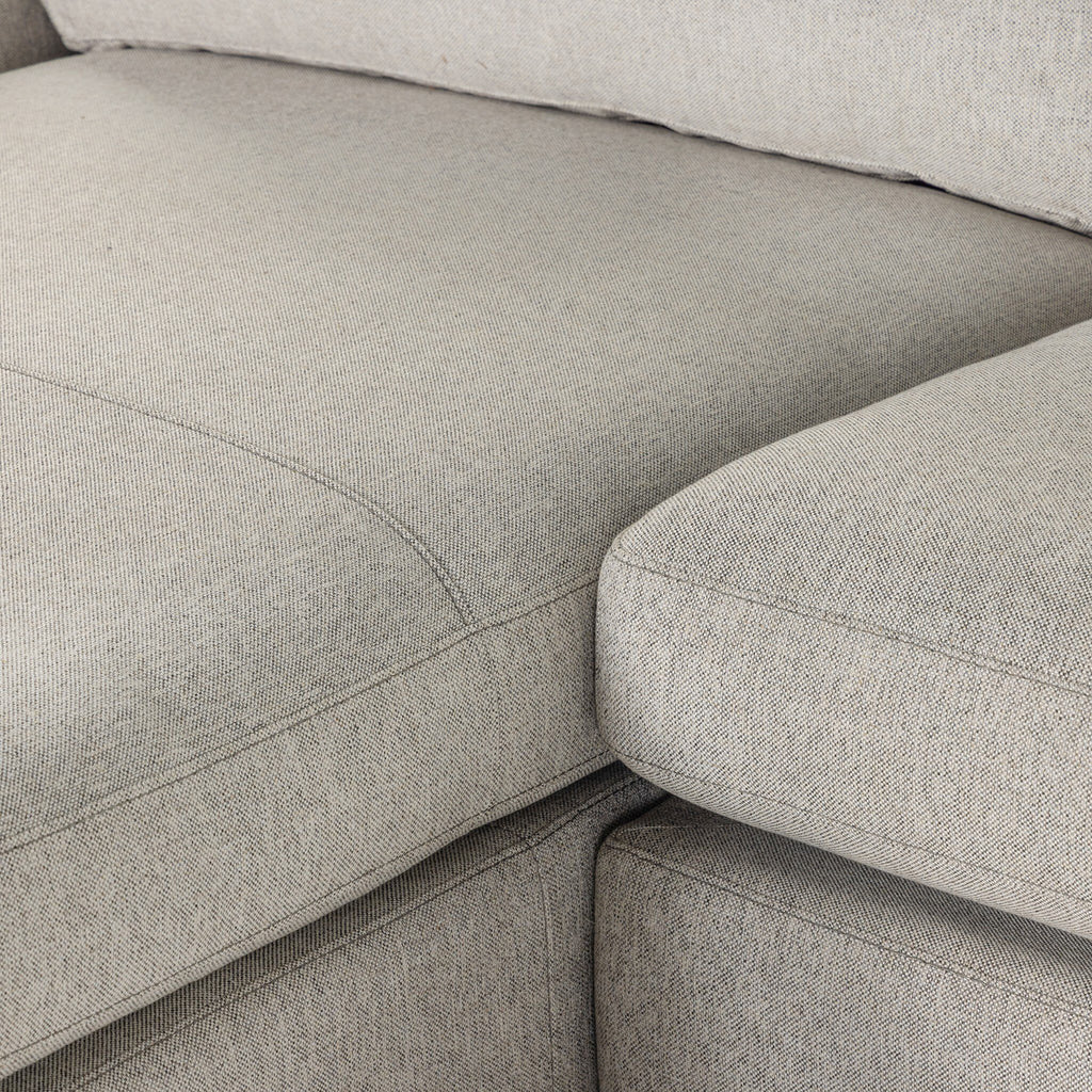 Simply styled for everyday lounging. This three-piece sectional is upholstered in a textural poly/linen blend with subtly flared sides and a plinth-style, wrapped wooden base.