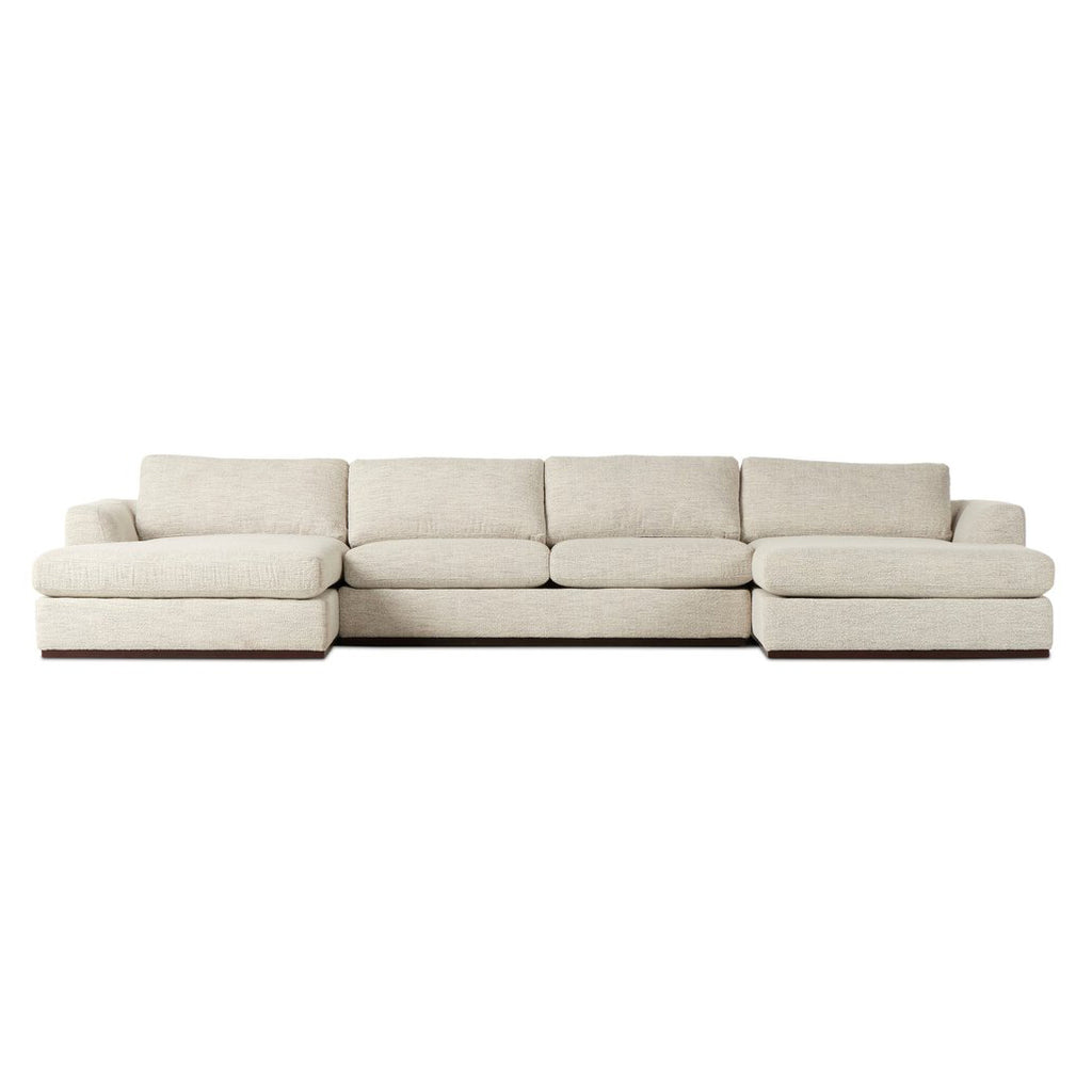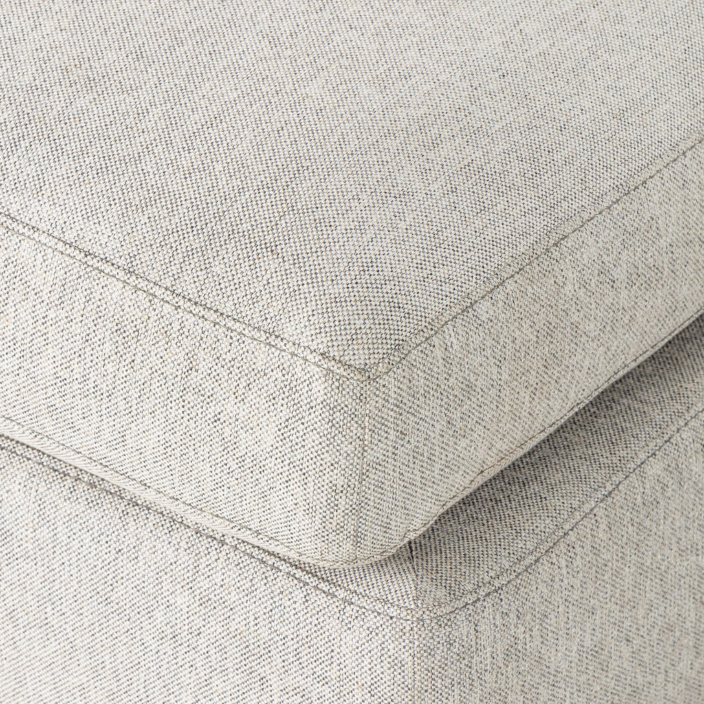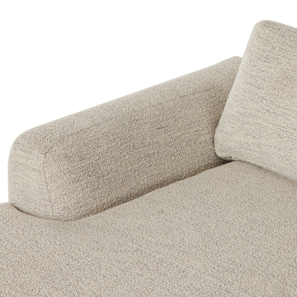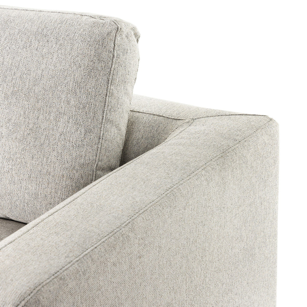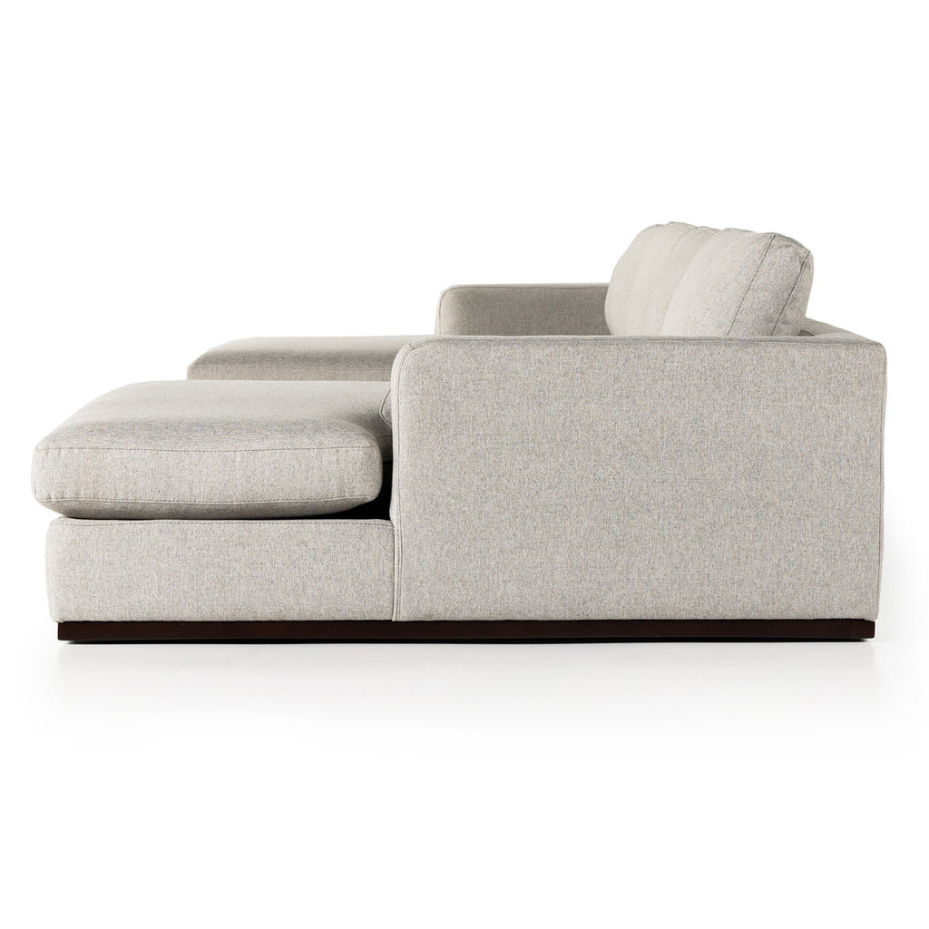 Simply styled for everyday lounging. This three-piece sectional is upholstered in a textural poly/linen blend with subtly flared sides and a plinth-style, wrapped wooden base.