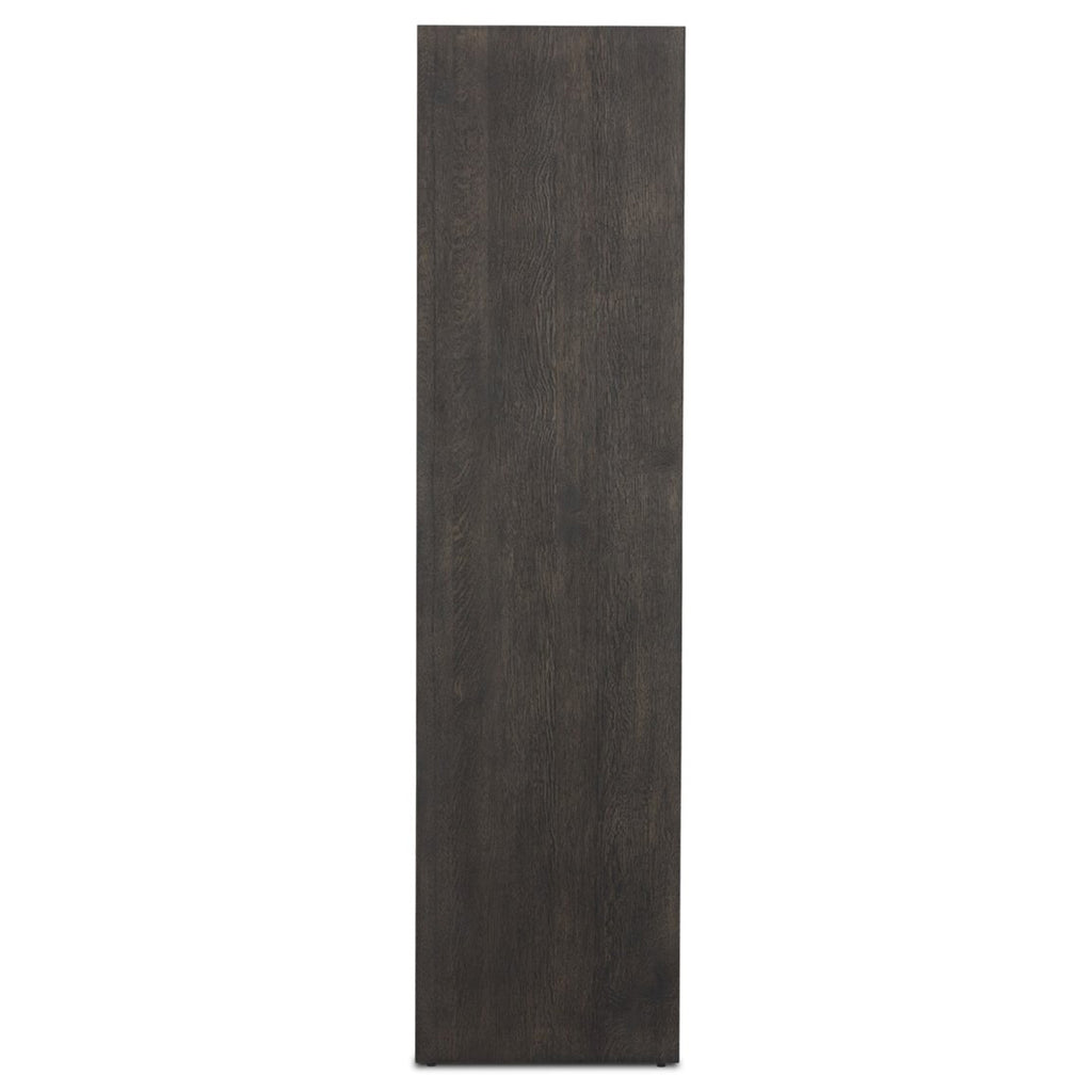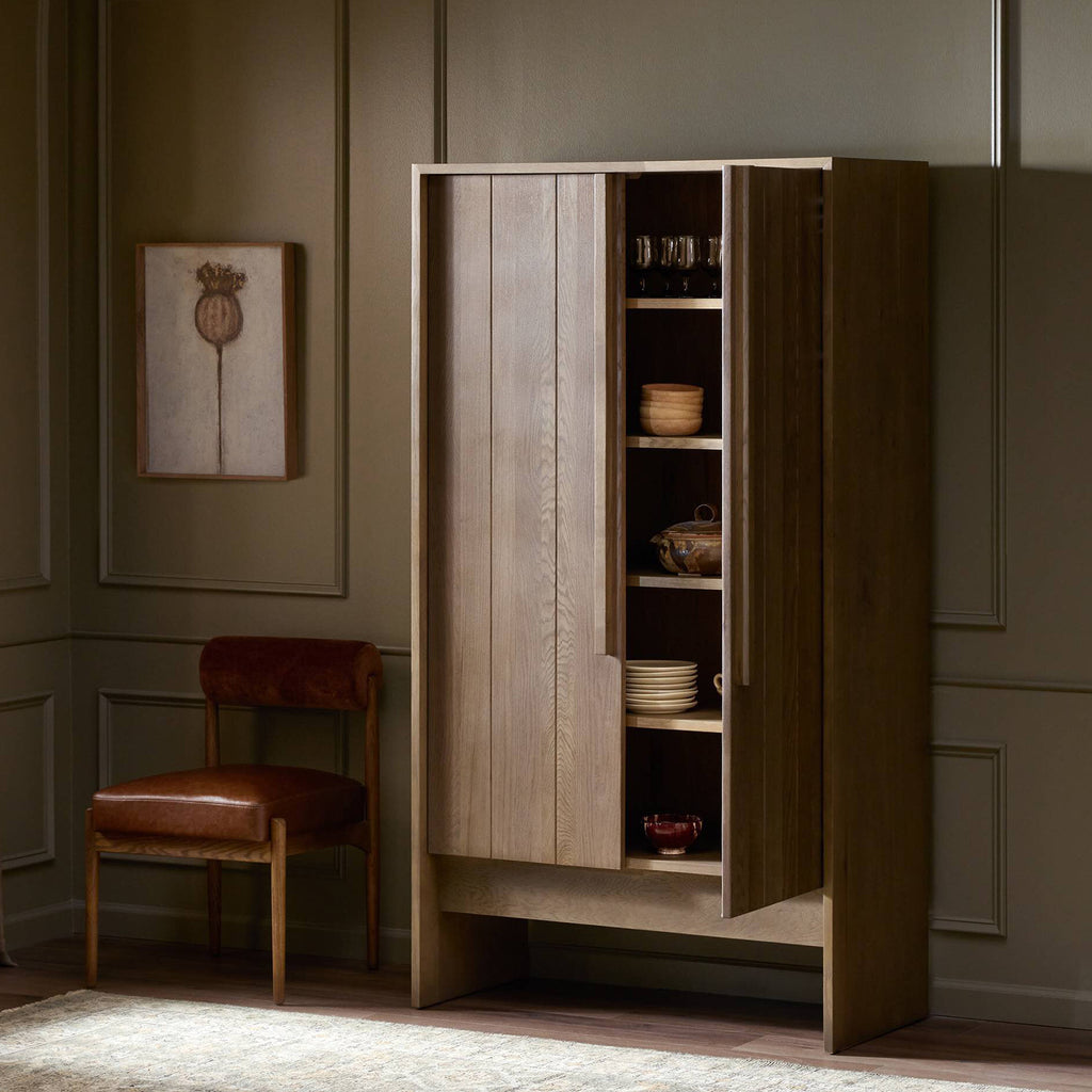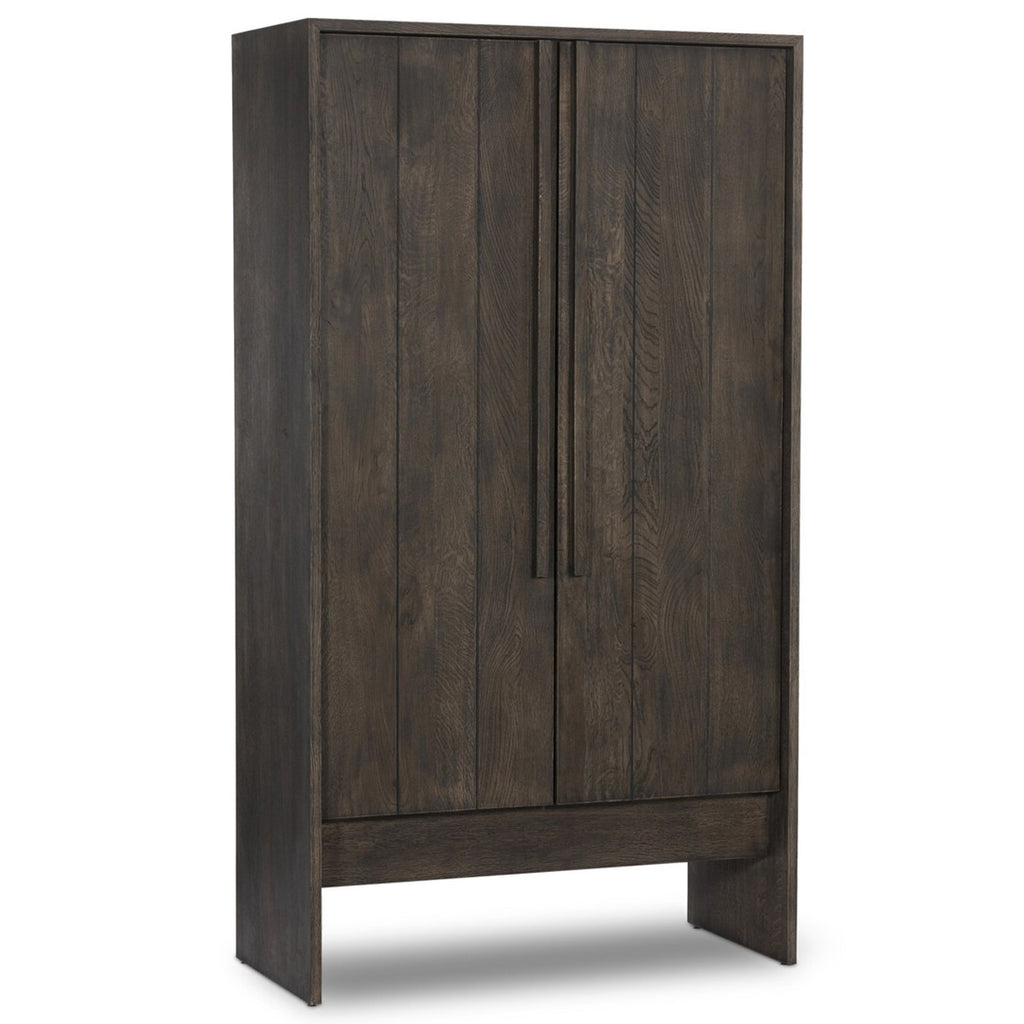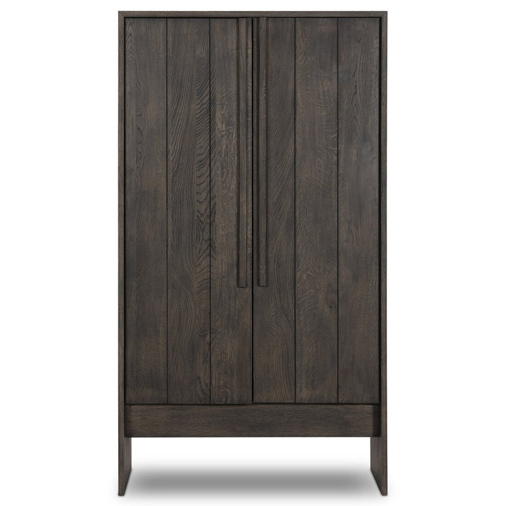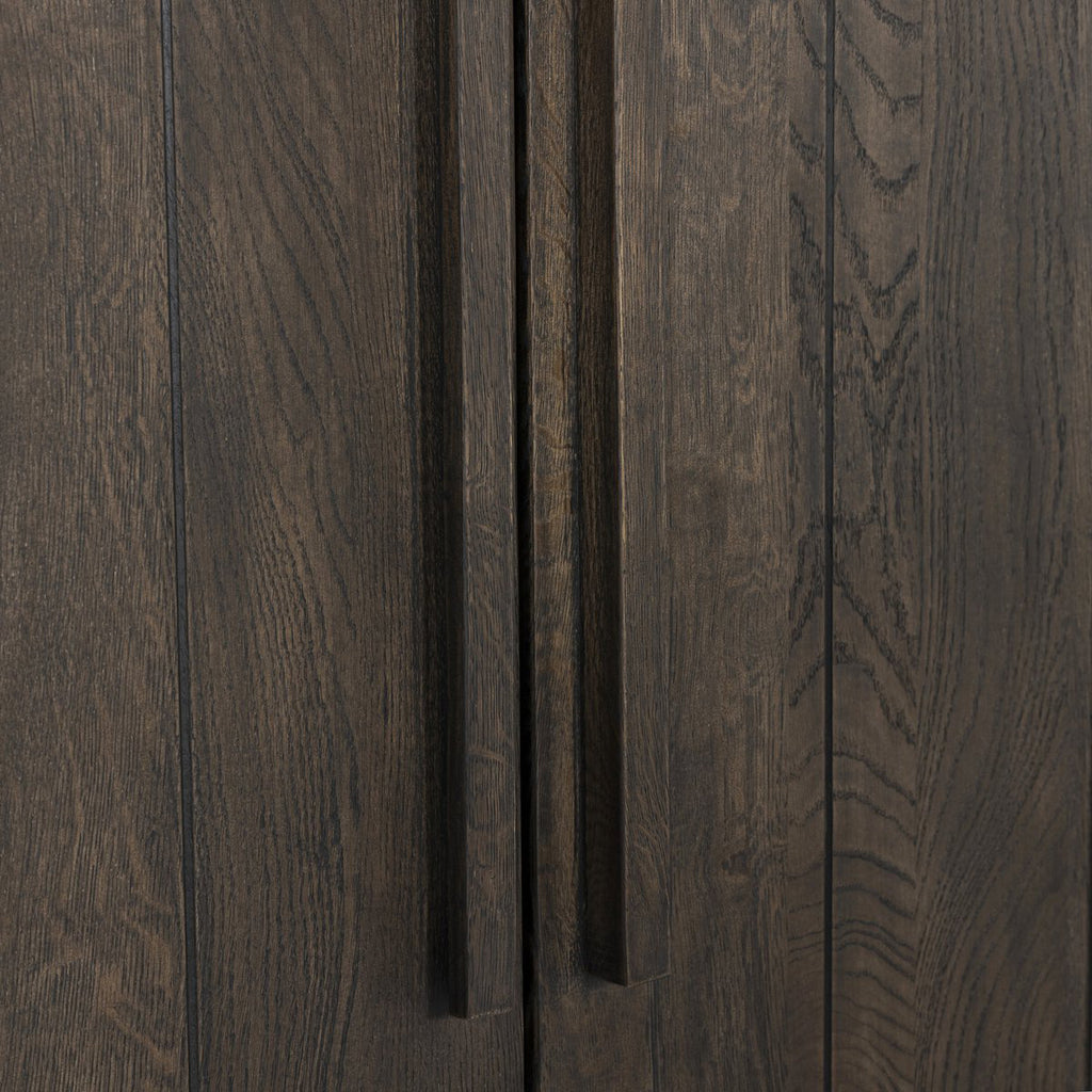 A clean, structured piece with plenty of presence. Made from oak and finished in a rich, dark brown, storage-driven cabinetry features plank-style doors, with linear hardware elongating the whole look.