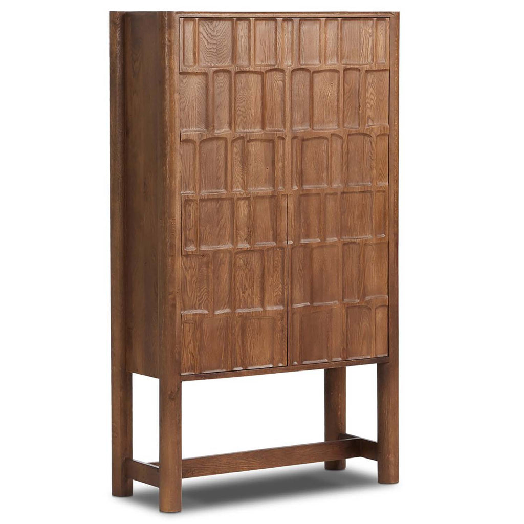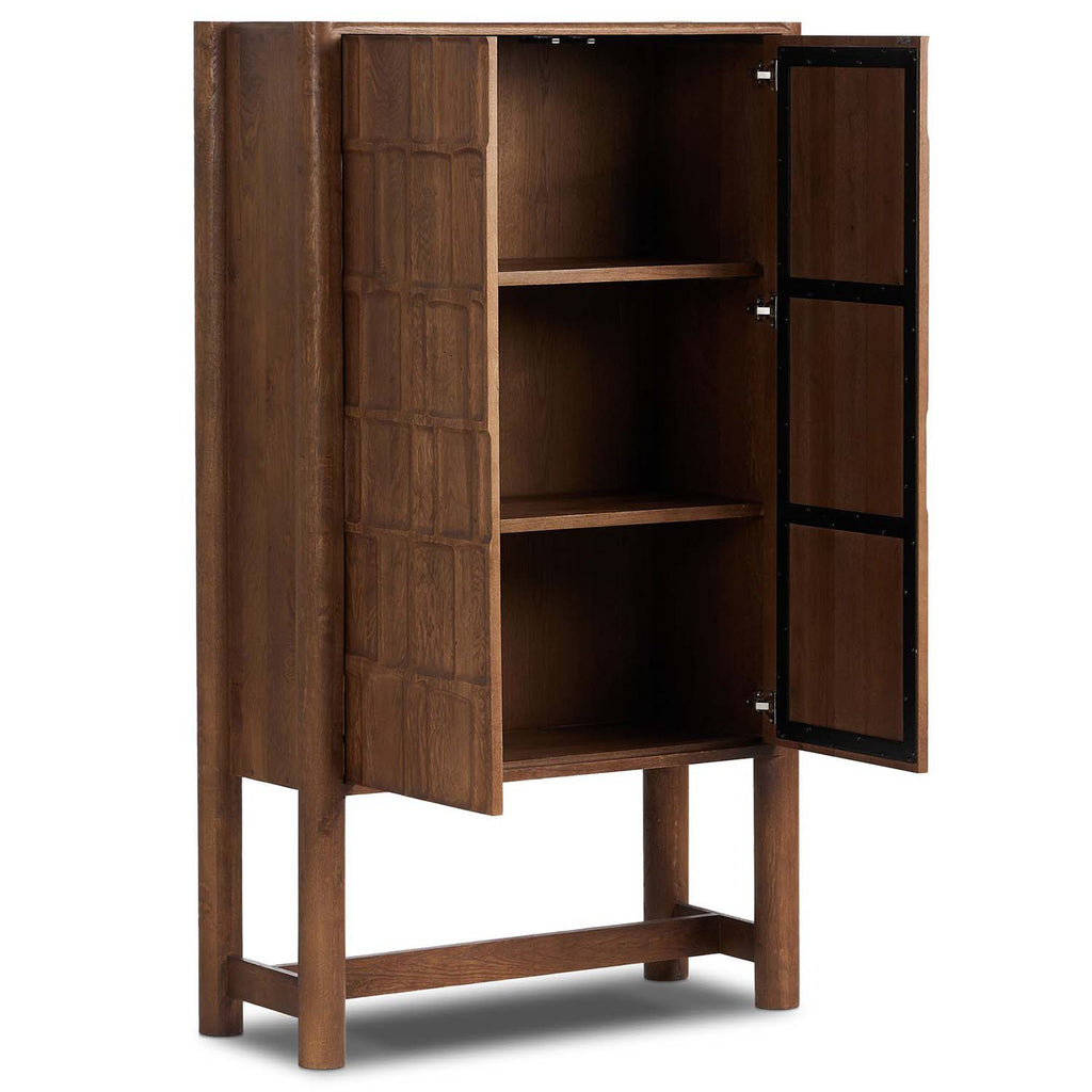 Made from solid oak and finished in a rich cocoa, tall cabinetry is carved with a unique grid-like pattern, for an organic look and textural touch. Interior shelving made from solid mango brings bonus storage to any room. Subtle variations in natural wood graining to be expected.