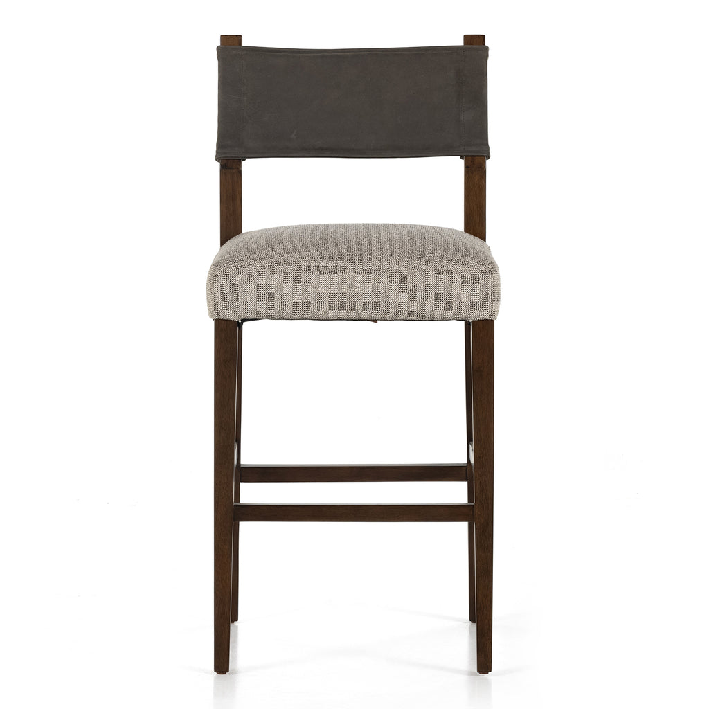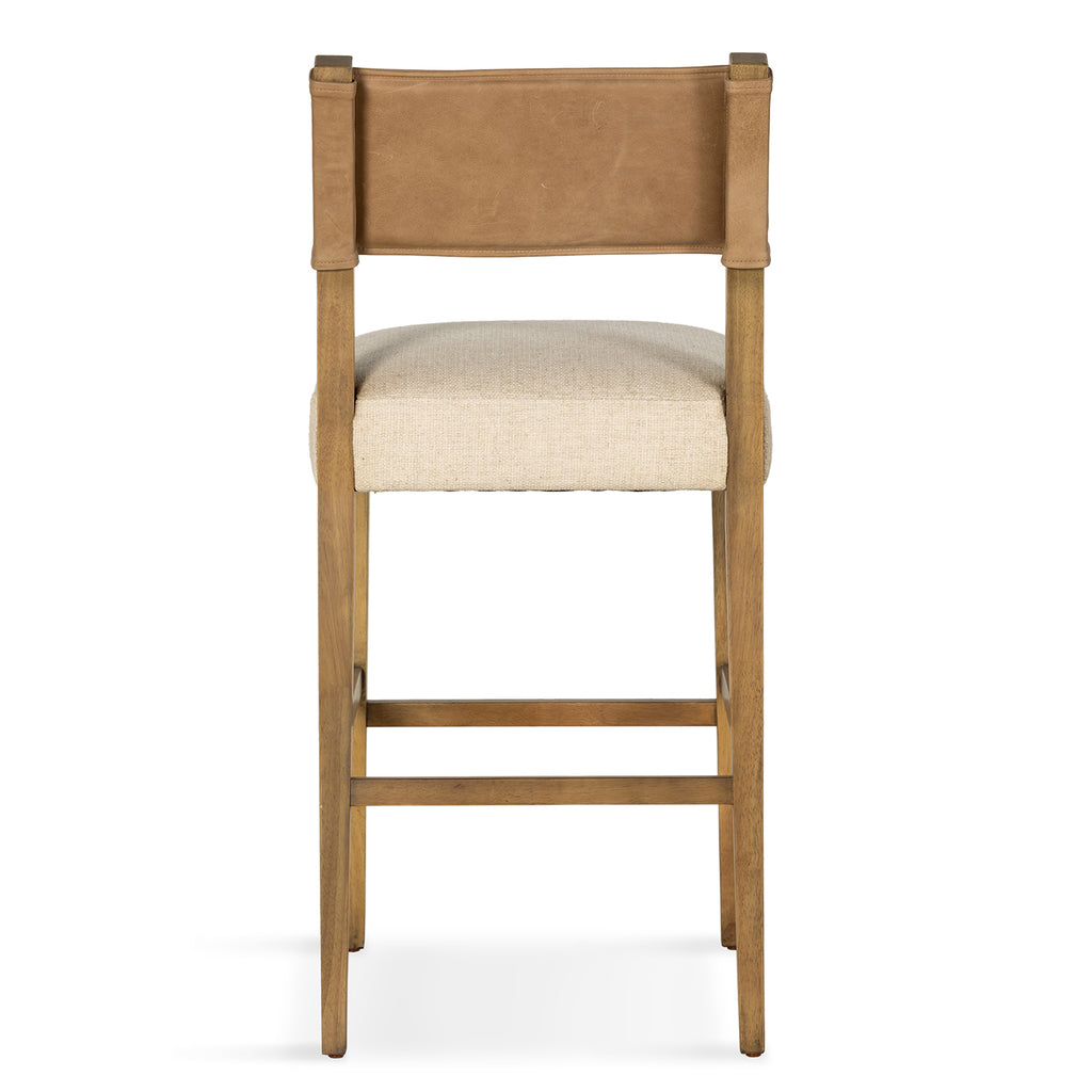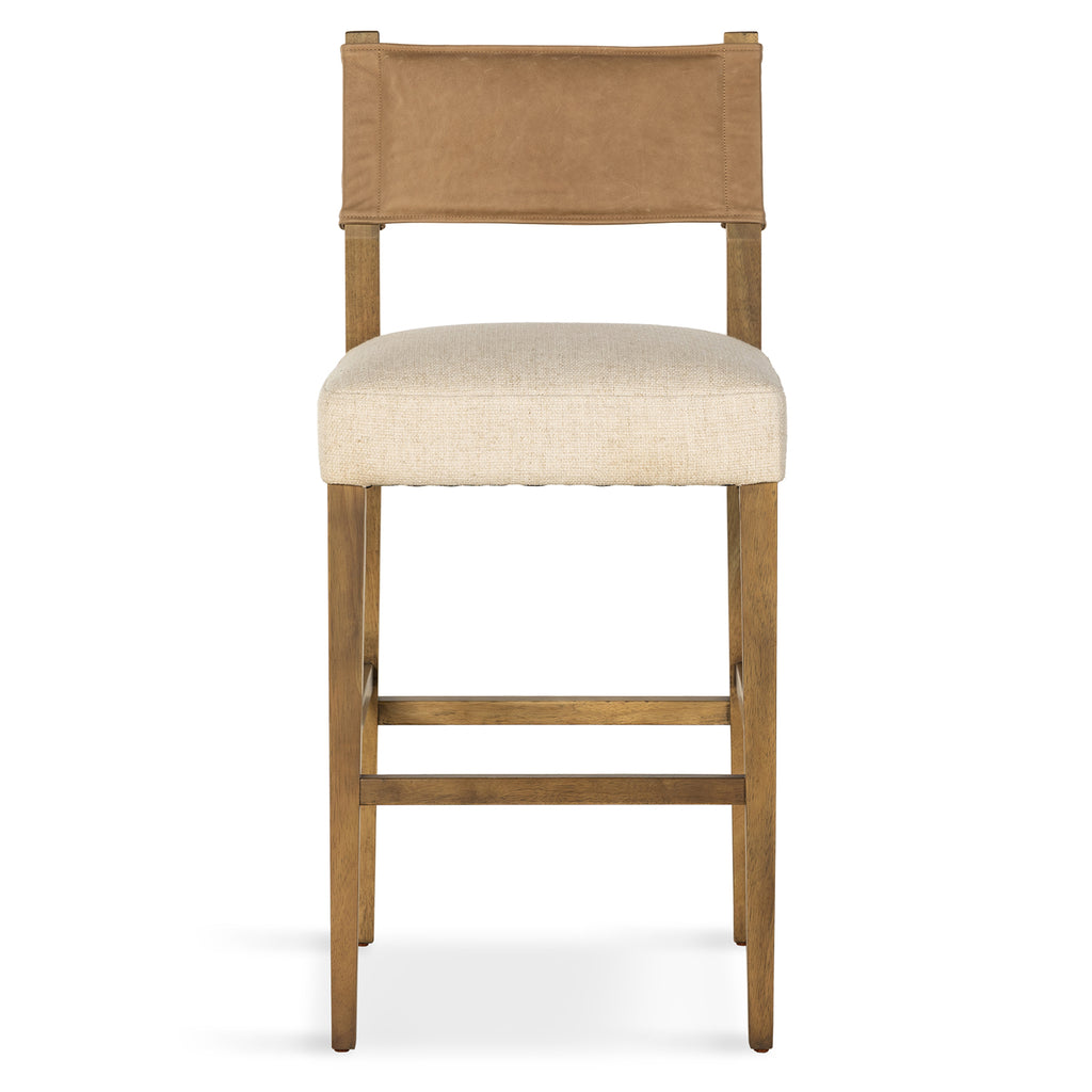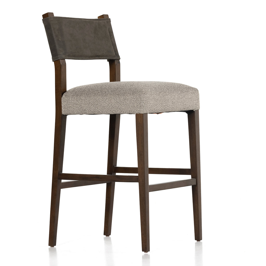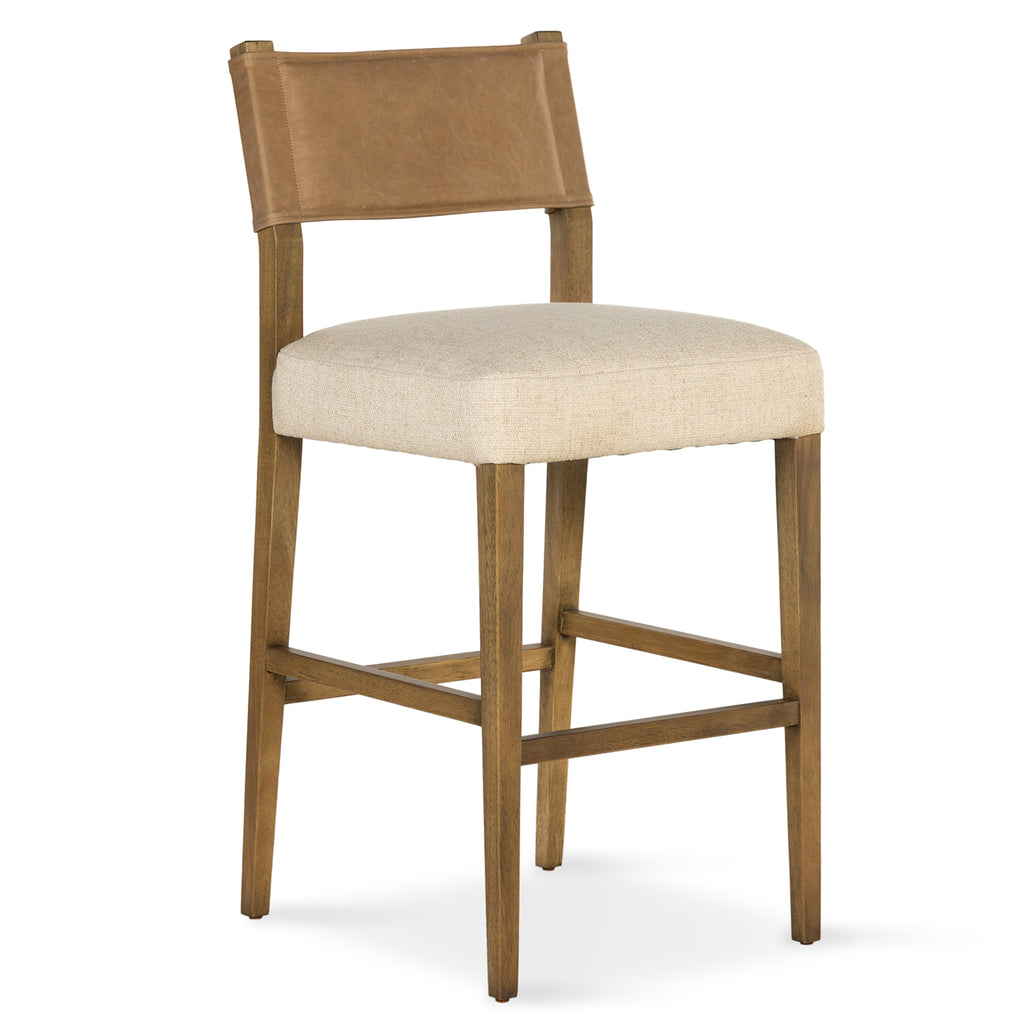 Mixed materials at their finest. Solid, burnished parawood frame with squared seating is upholstered in high-performance fabric. Beige top-grain leather backing takes this modern-minded stool to the next level. Performance fabrics are specially created to withstand spills, stains, high traffic and wear, ensuring long-term comfort and unmatched durability.