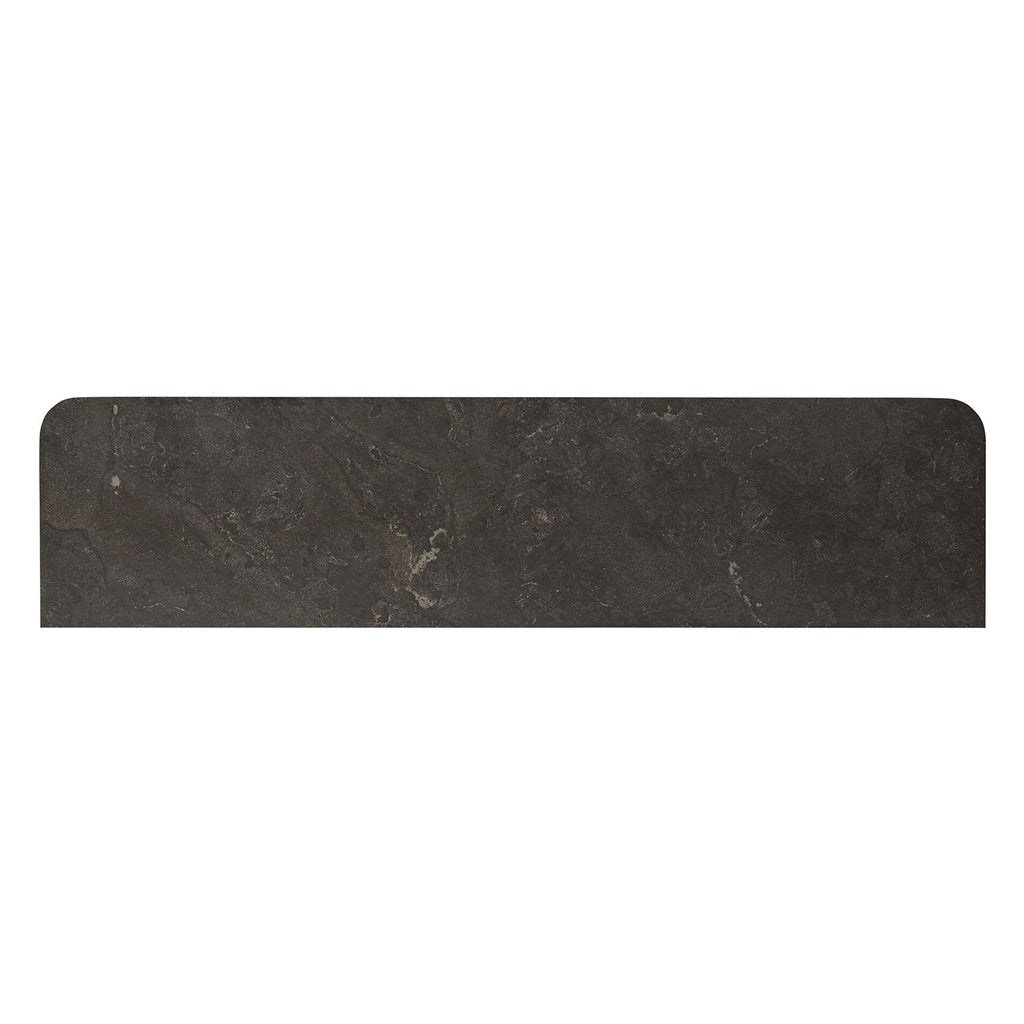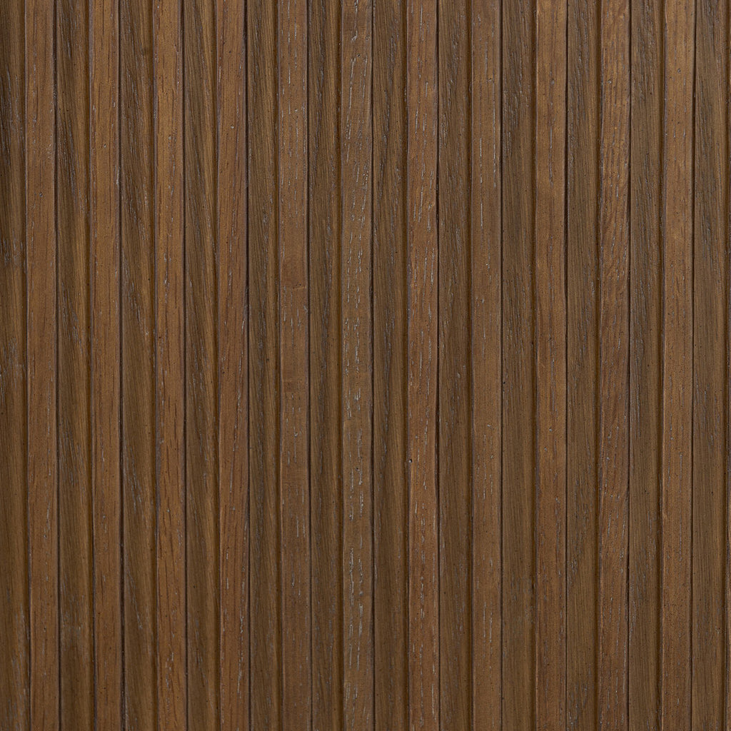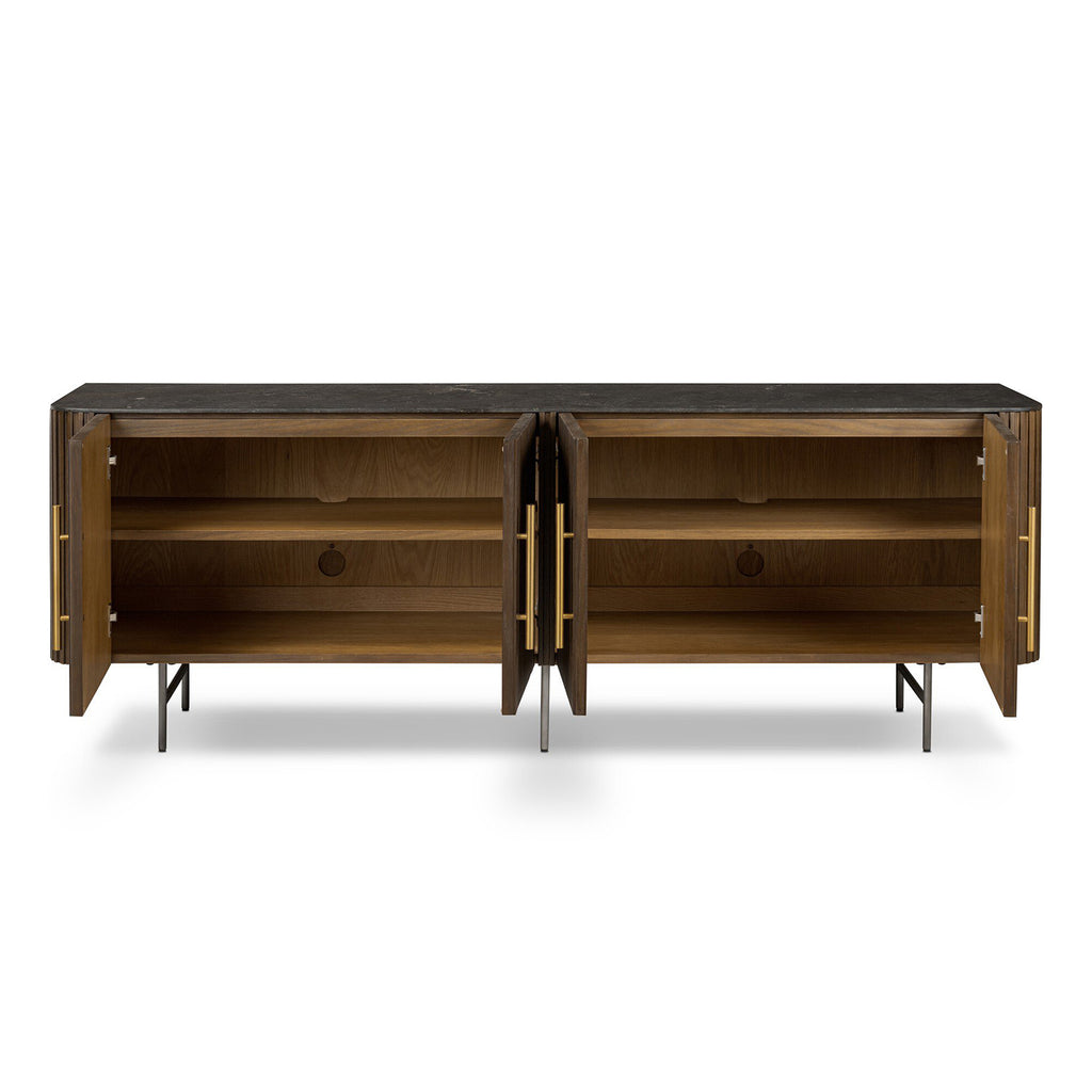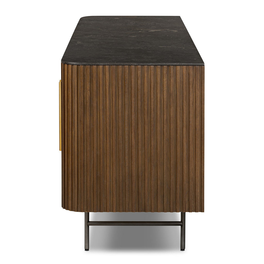 Rich with reeding for texture and a linear look, this brown oak media console features four doors with brushed brass hardware and curved corners. Its top is a slab of bluestone, adding a striking material mix, while white mineral lines and natural variations mark the uniqueness of each piece.