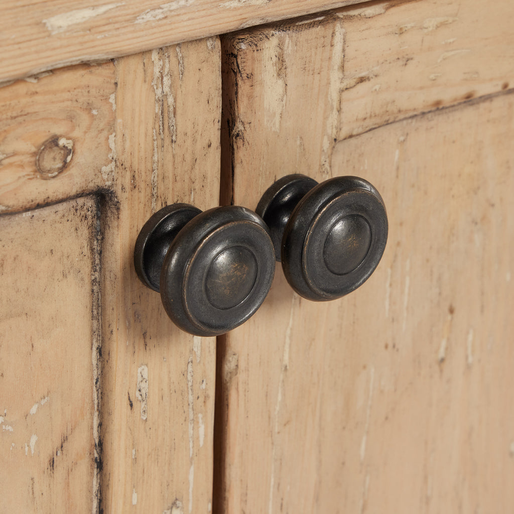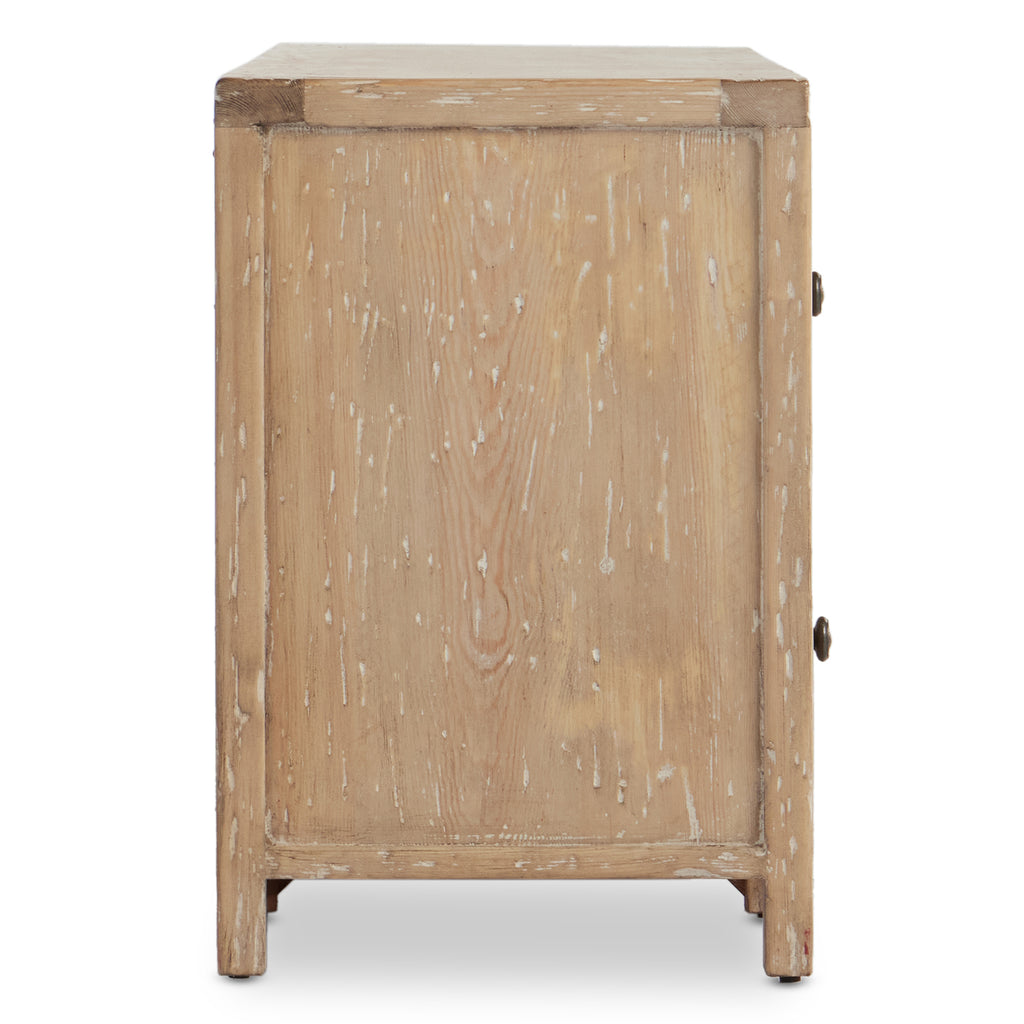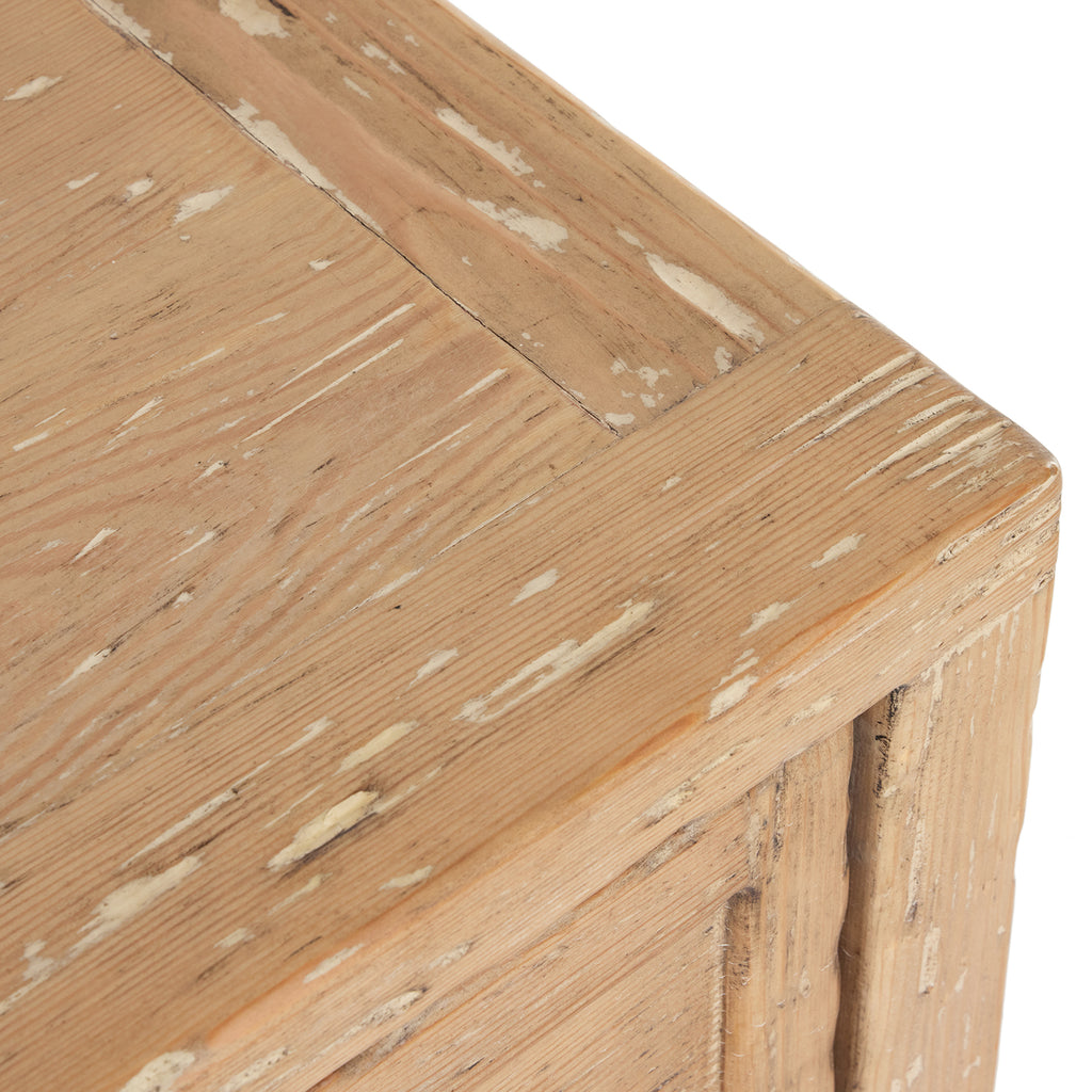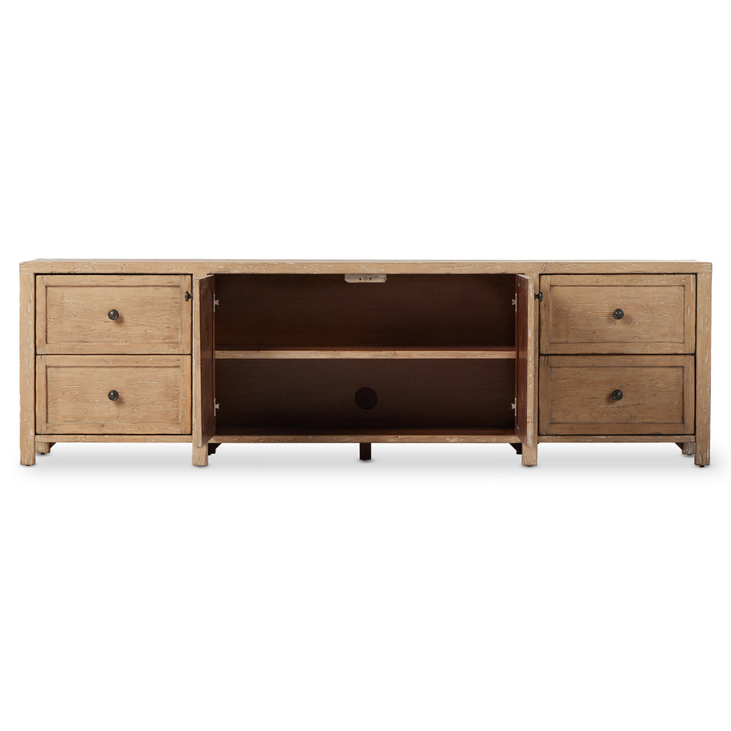 A simply shaped media console that's grand in scale. Light waxed pine finished with a distressed look and accented with distressed copper hardware.