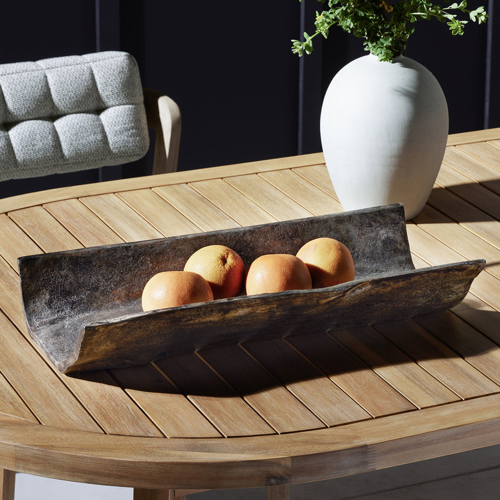Rustic cast aluminum takes on an organic, fluid shape reminiscent of carved wood. Cover or store indoors during inclement weather and when not in use.