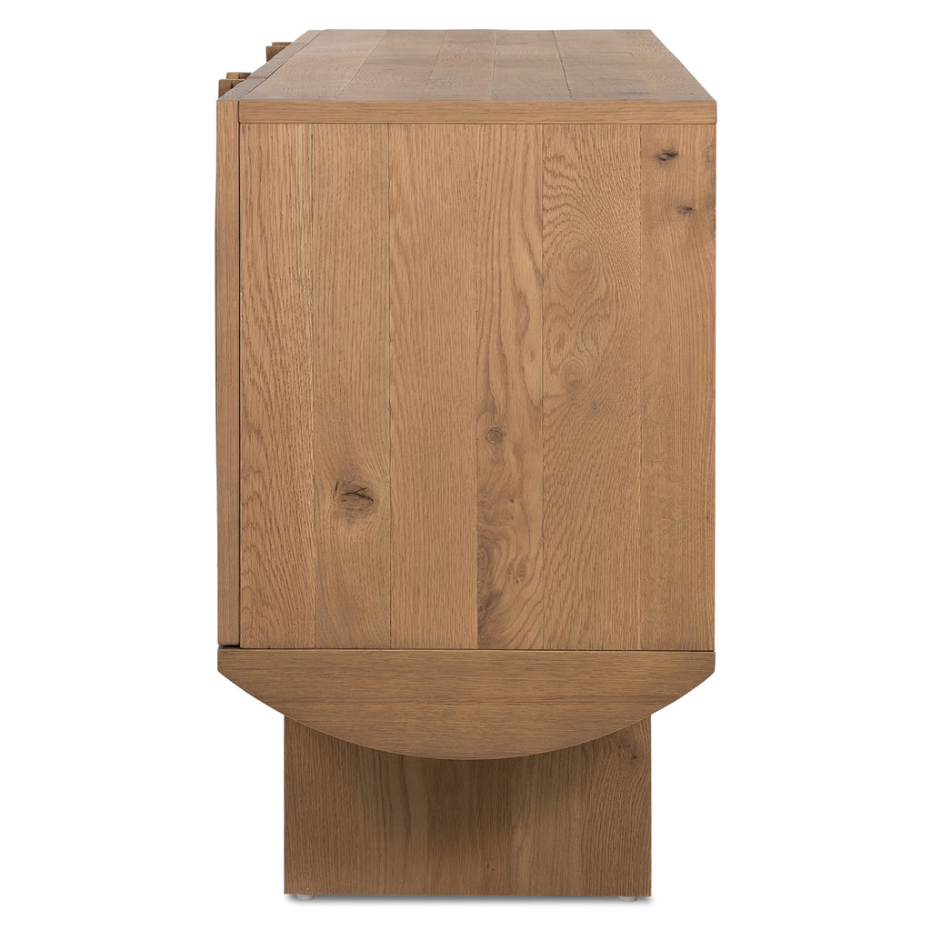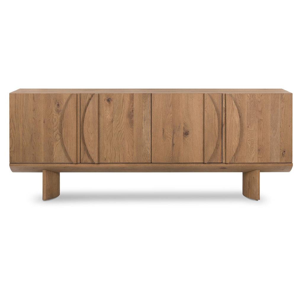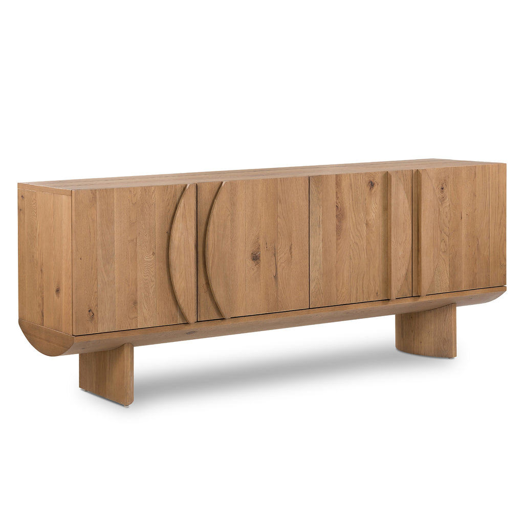 Made from thick oak veneer, a shape-driven sideboard features overscale proportions, semicircle shaping and hand-applied half-moon hardware. Dual posterior cutouts for seamless cord management.