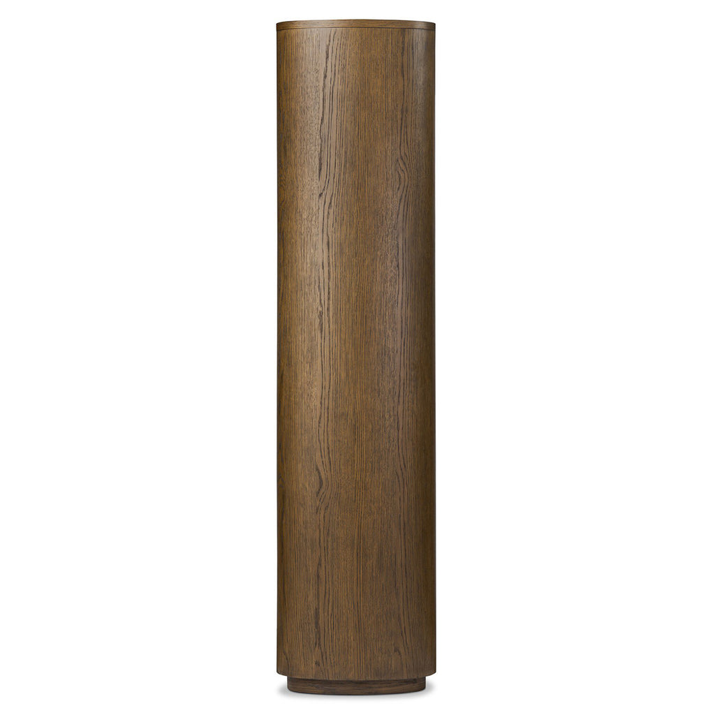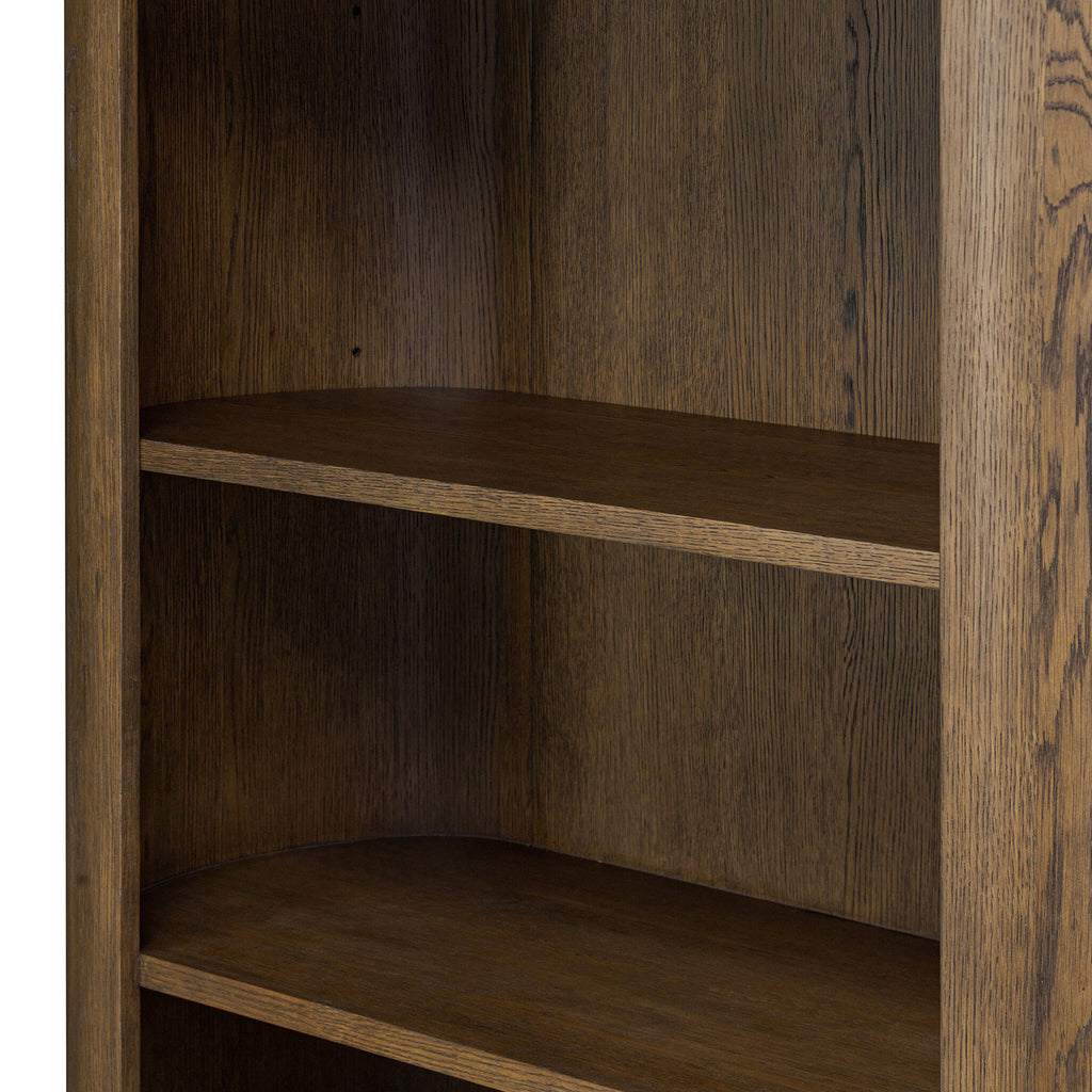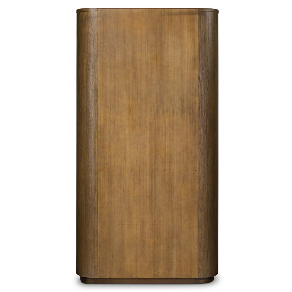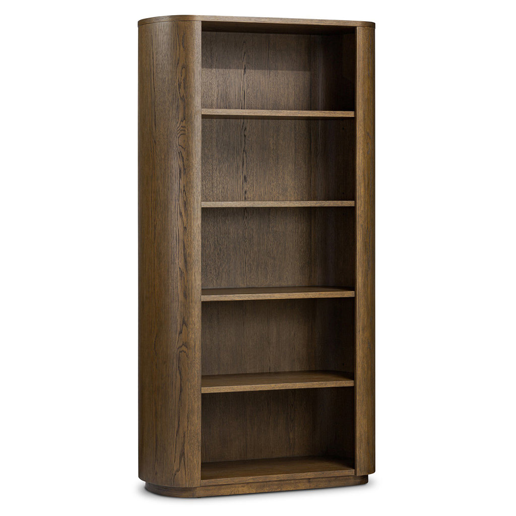 With half-cylinder sides inspired by Eighties design, almond-finished oak works warmth into any room in your home. Spacious shelves create endless storage and display options for favorite books and keepsakes.