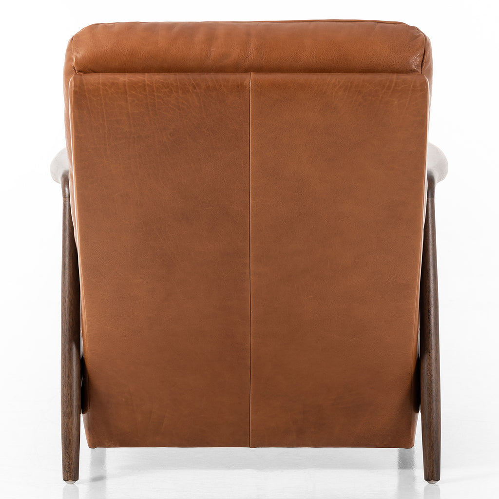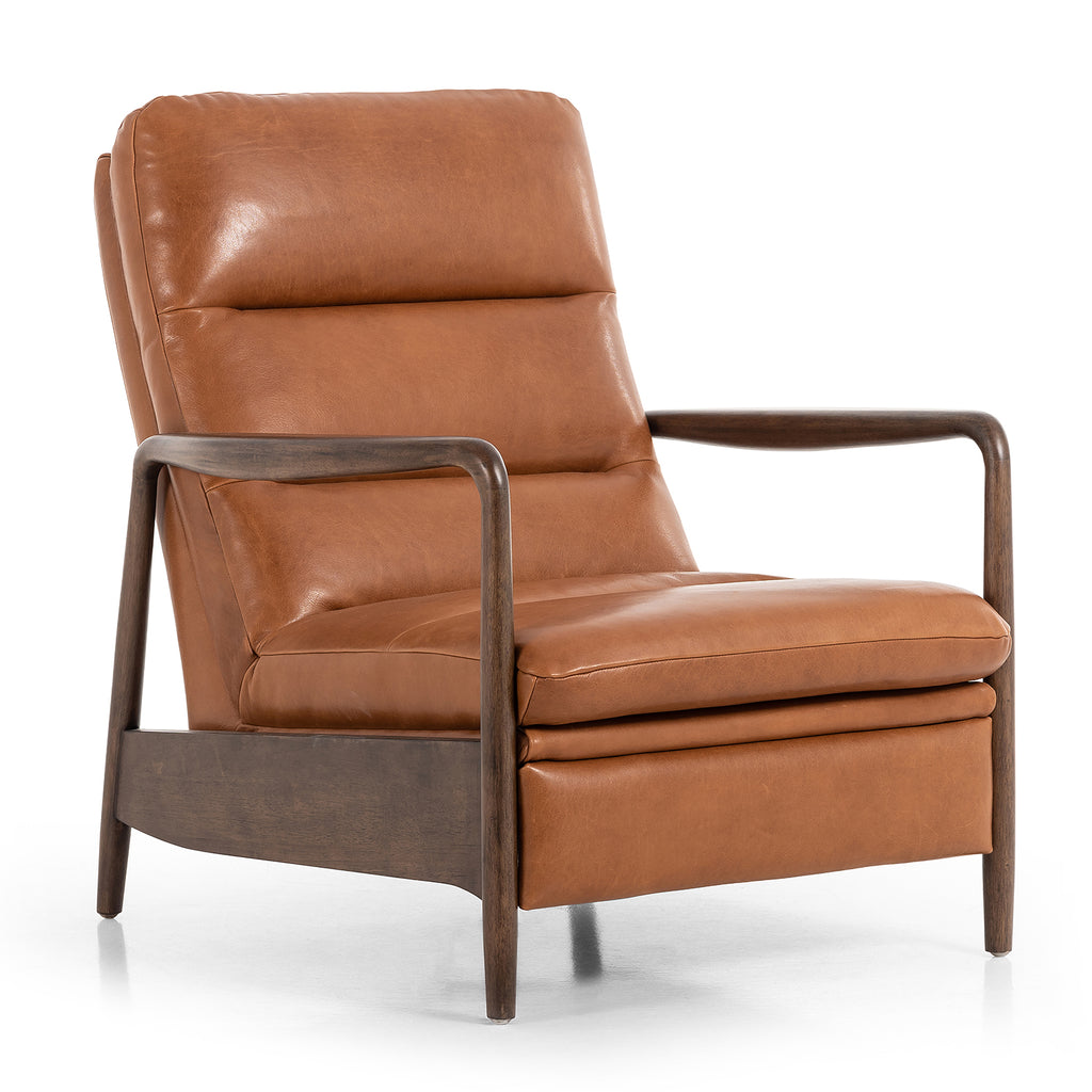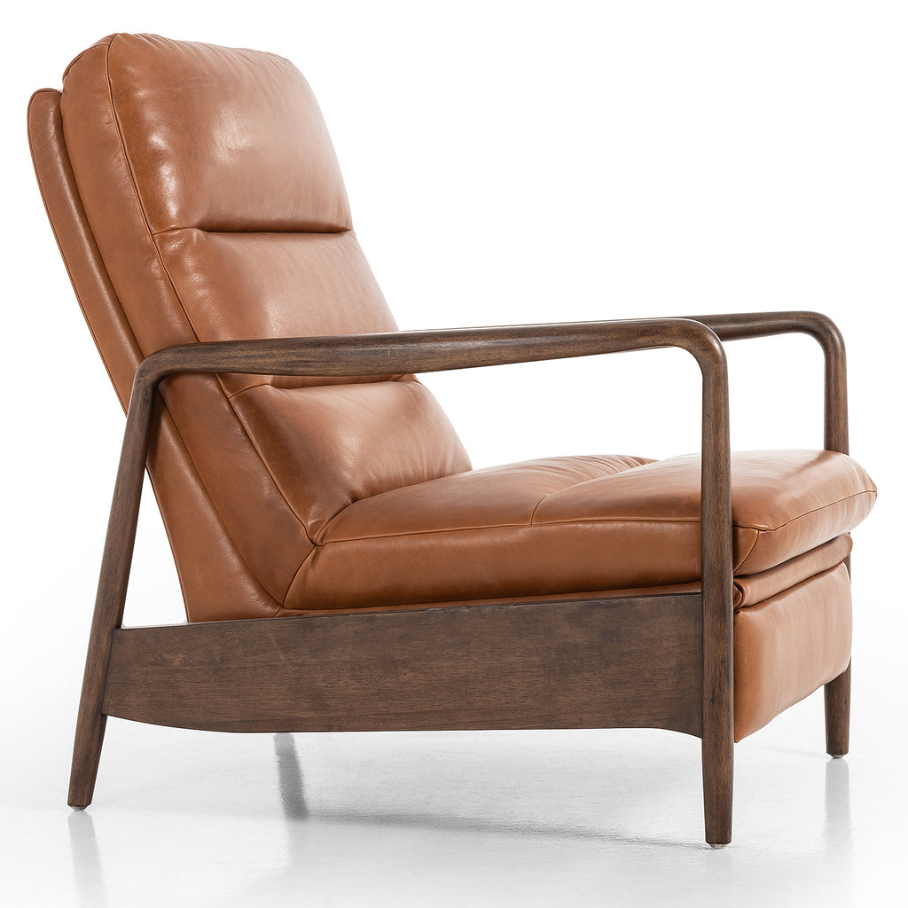 A sleek seat with hidden push-back reclining functionality. This midcentury-inspired recliner features wide chunky channeling paired with slim paddle arms and a tapered wood frame. Designed with a high seat and high back for extra comfy support. Upholstered in a timeless tobacco-hued leather made in a family-owned tannery in Thailand.