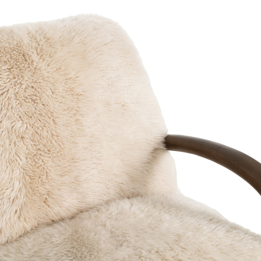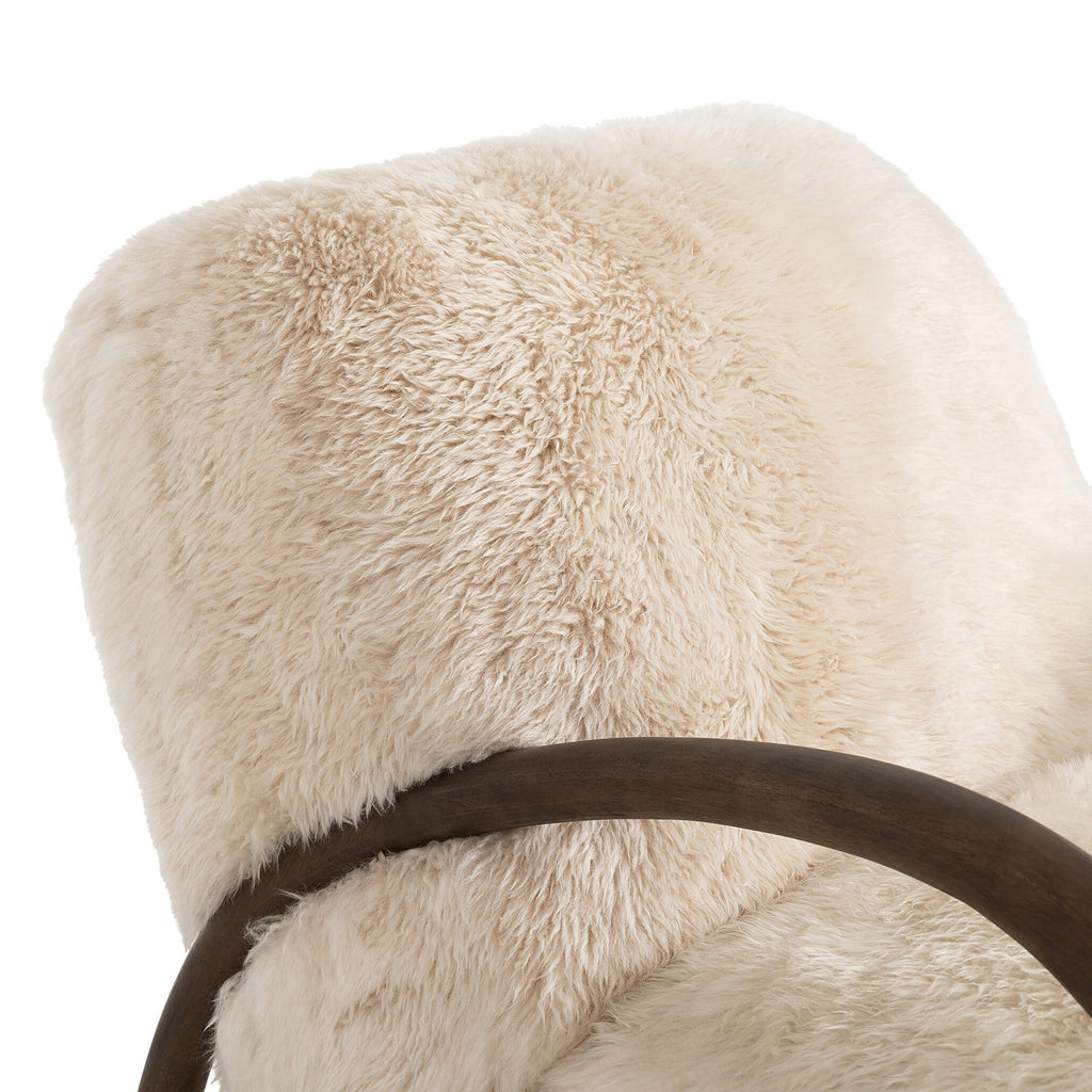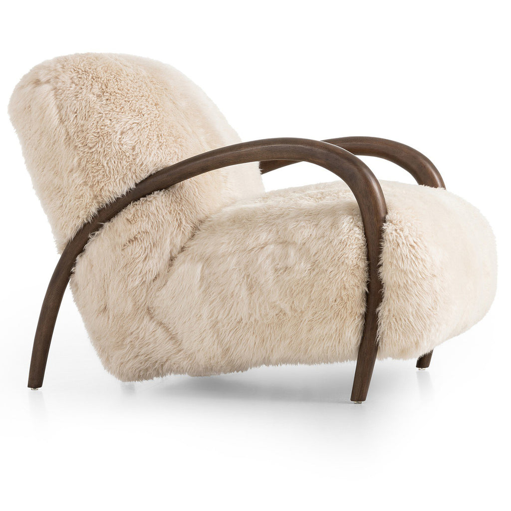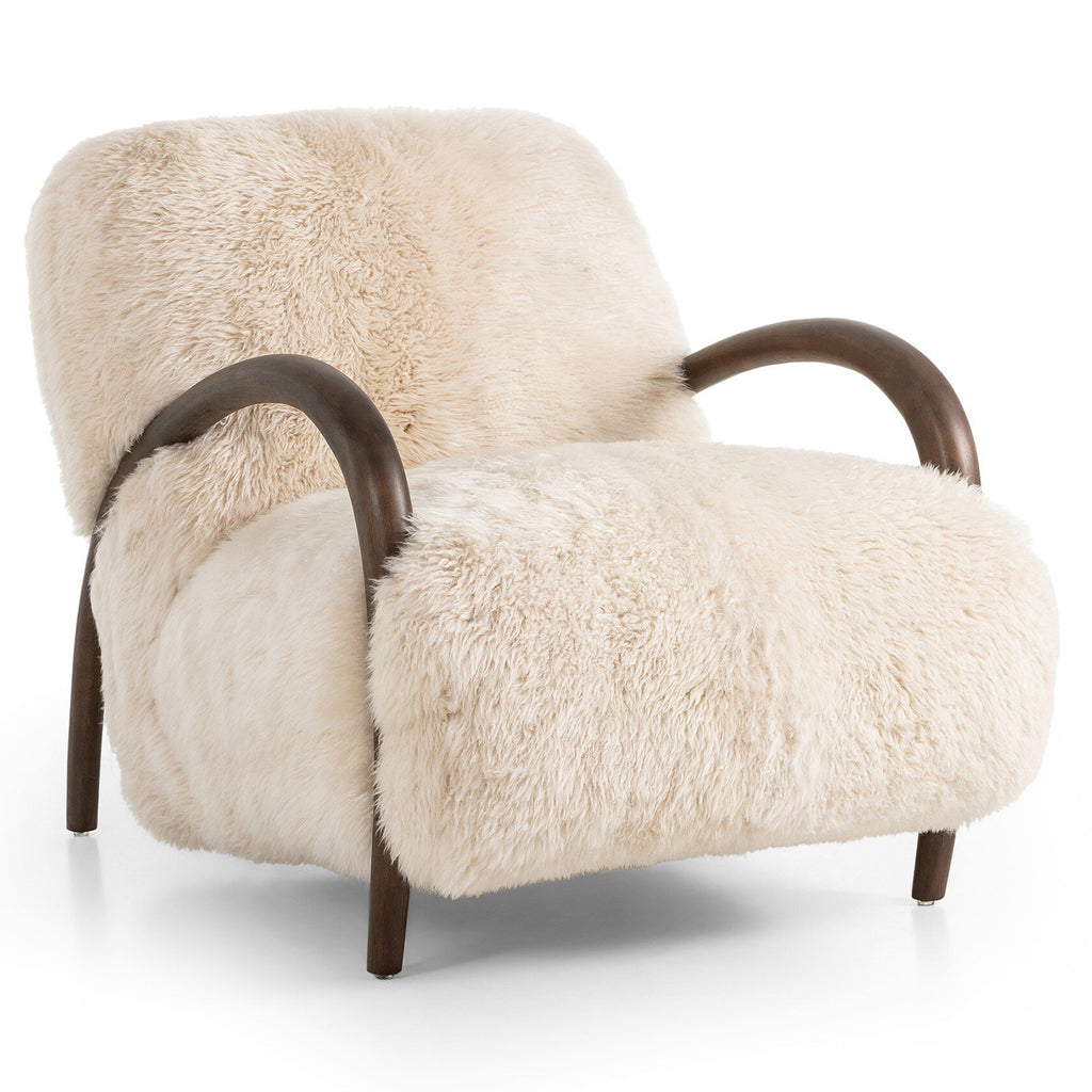 This versatile accent chair is upholstered in a faux Mongolian shearling with a textural high pile. A contrasting, chunky parawood frame hugs the seat and is wire-brushed for a warm, vintage feel.