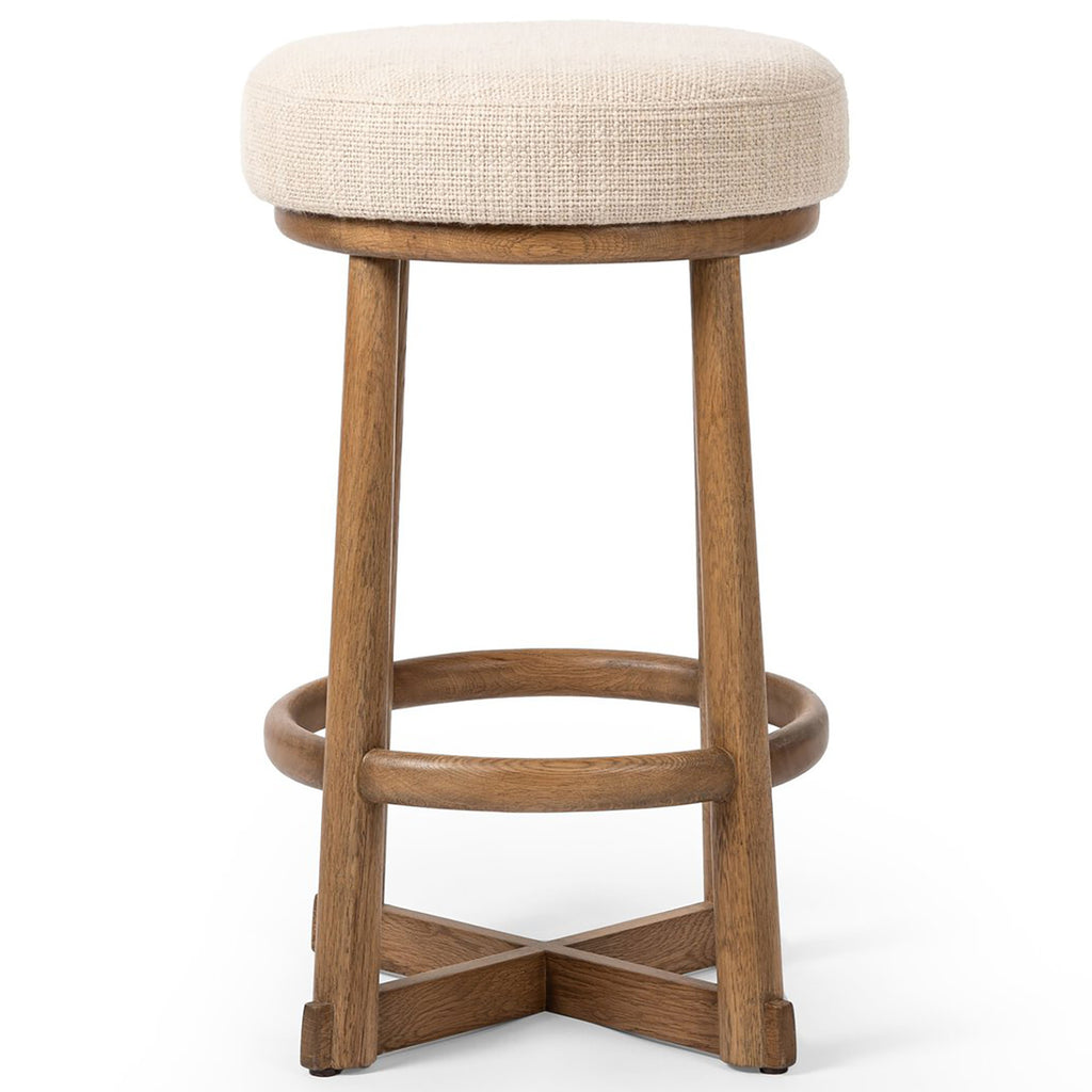 Perfectly sized for the counter, a 360-degree swivel stool pairs a warm oak frame with sand seating in a chunky basketweave. Tapered legs meet a crossed base ties it all together.